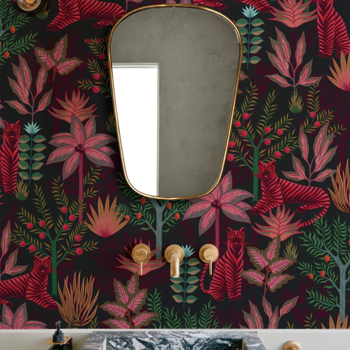 Wallpaper with a plant and animal motif GOLD TIGERS BLACK black with red