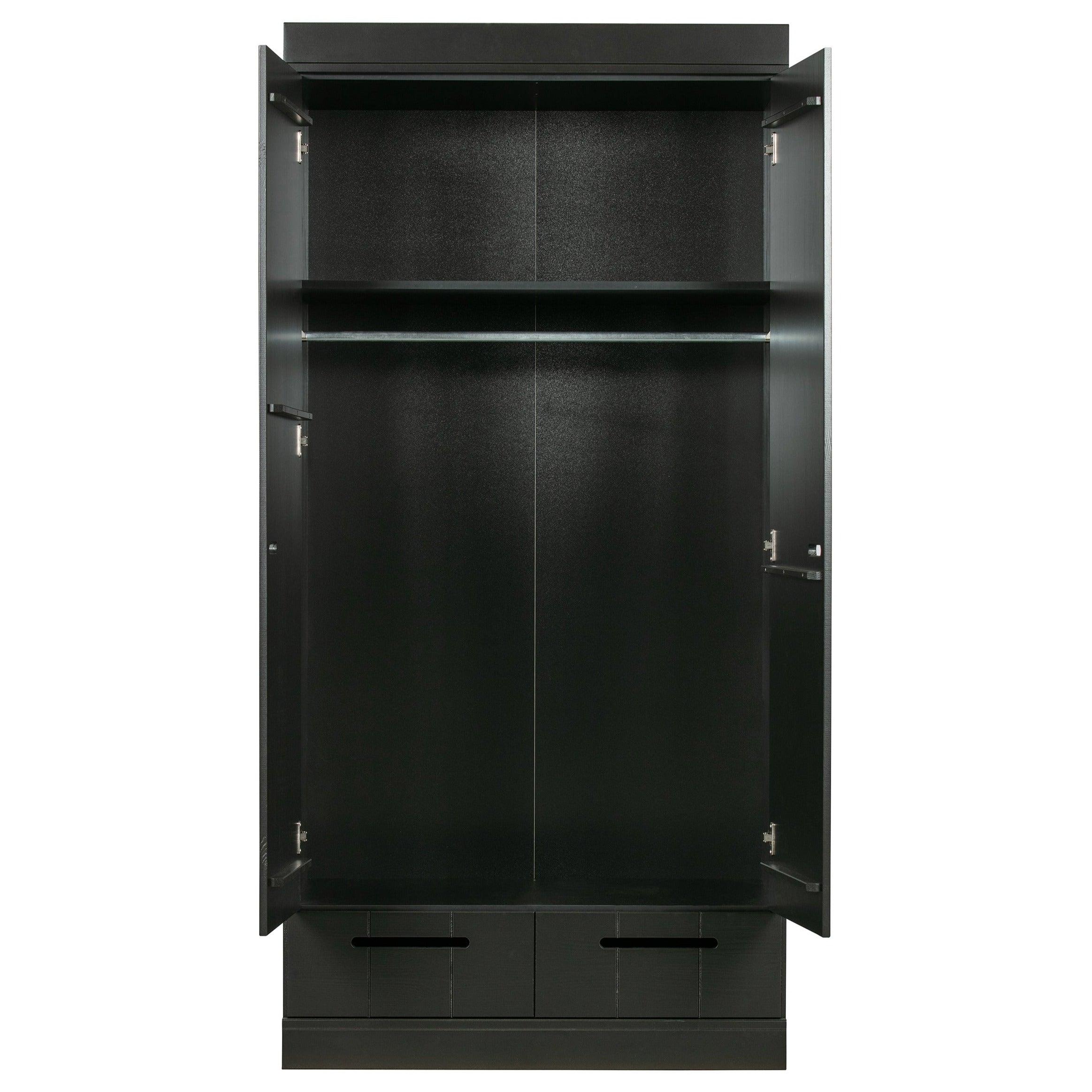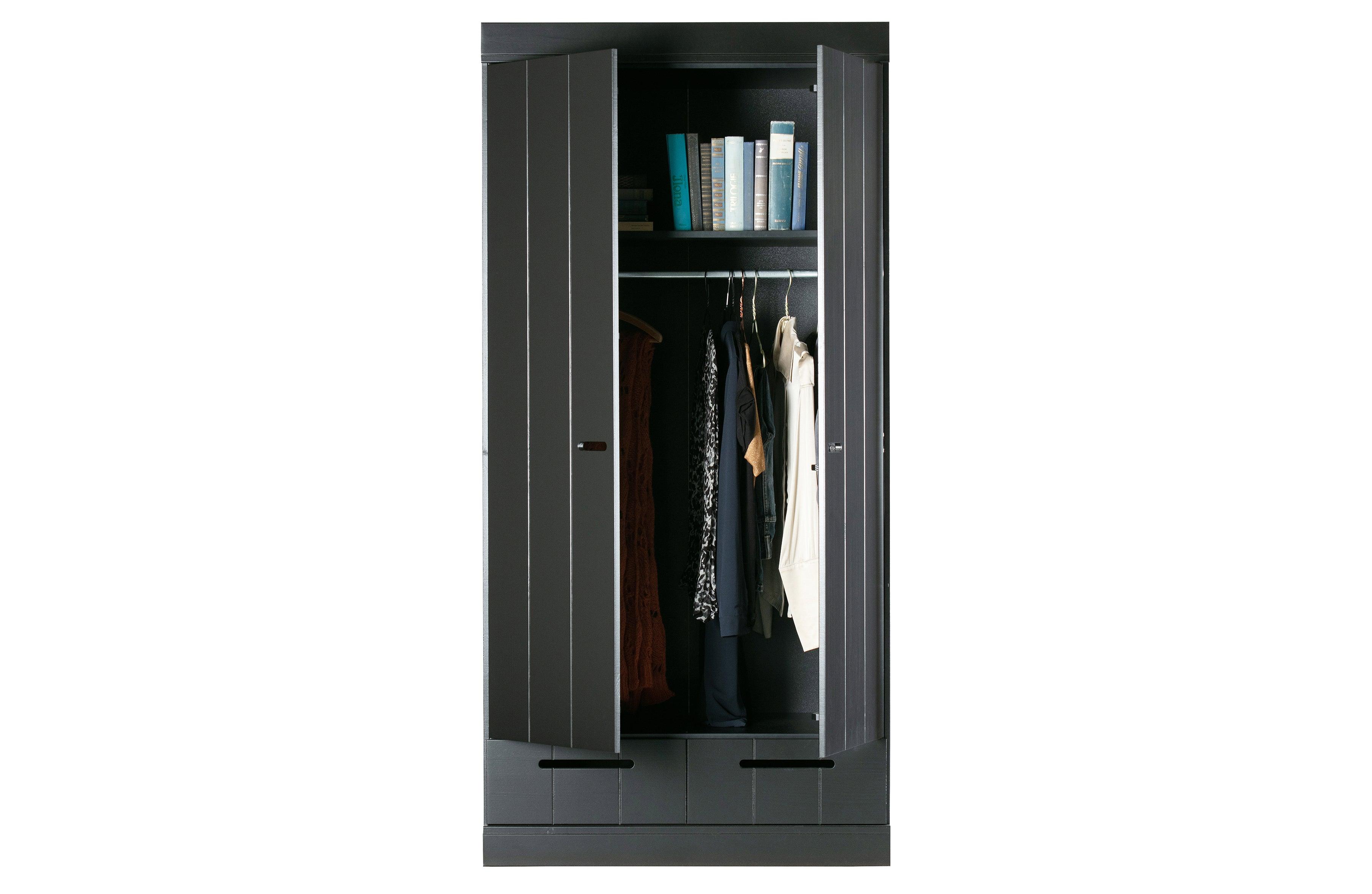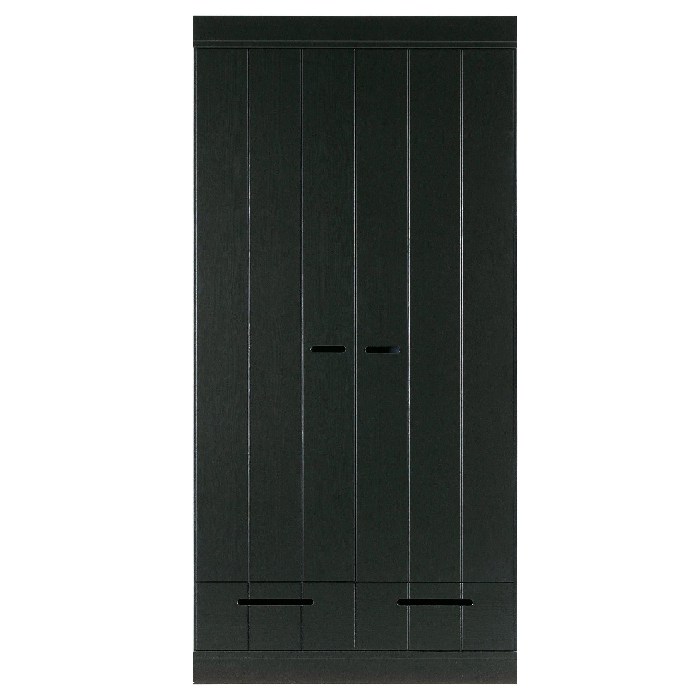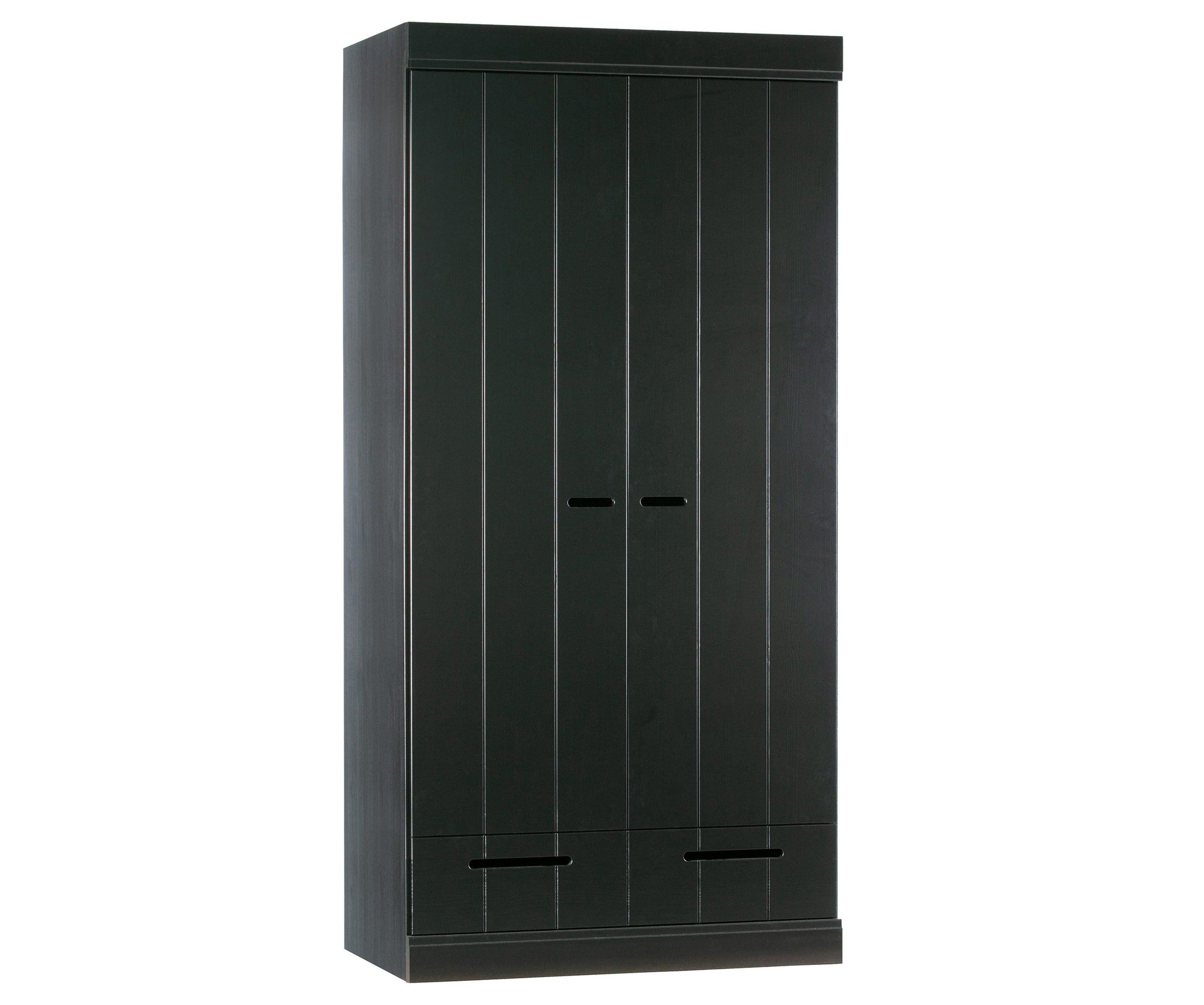 The black Connect wardrobe is made from durable materials that ensure its longevity and durability. Two doors open easily, revealing a storage space that is spacious enough to hold everything you need - from clothes to bedding or towels. Additionally, the wardrobe is equipped with two practical drawers that allow for even better organization and storage of small items.