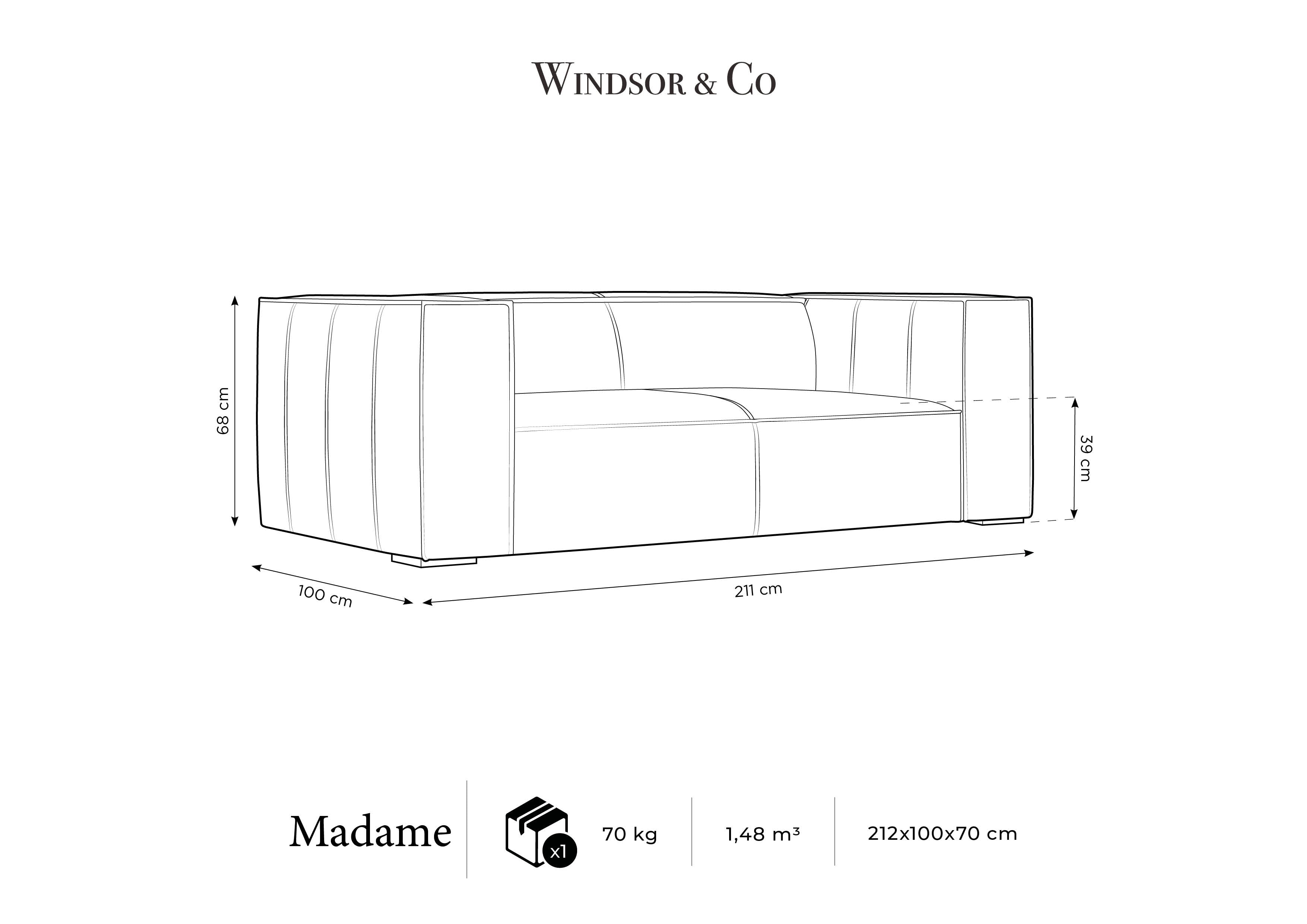 Sofa for two people Madame with a distinctive character and elegant finish is an excellent choice for a modern living room. The deep seat is perfect for social gatherings as well as for moments of relaxation after a long day. It allows you to rest comfortably in casual positions. With its low-set silhouette, wide armrests, and backrests, it creates a cozy shape.