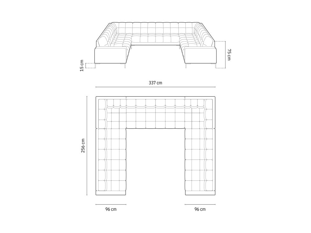 A light gray 9-seater panoramic velvet sofa with a golden base
