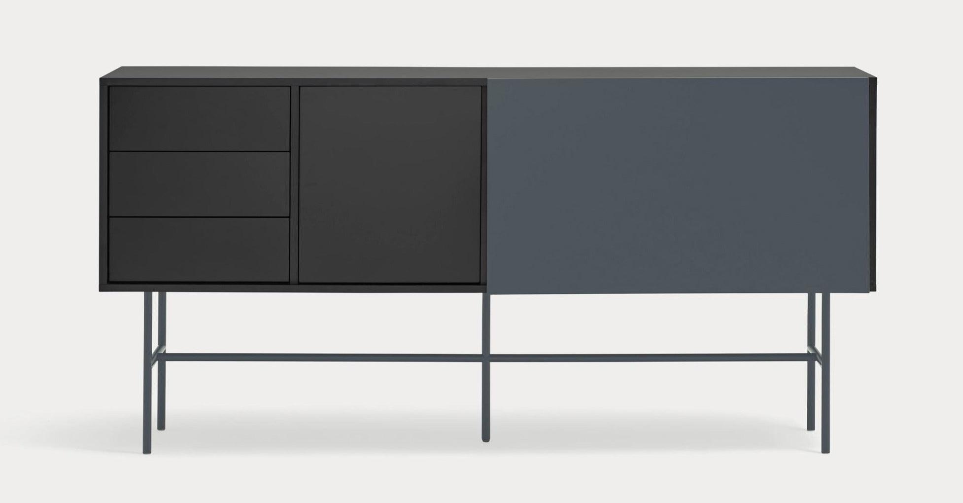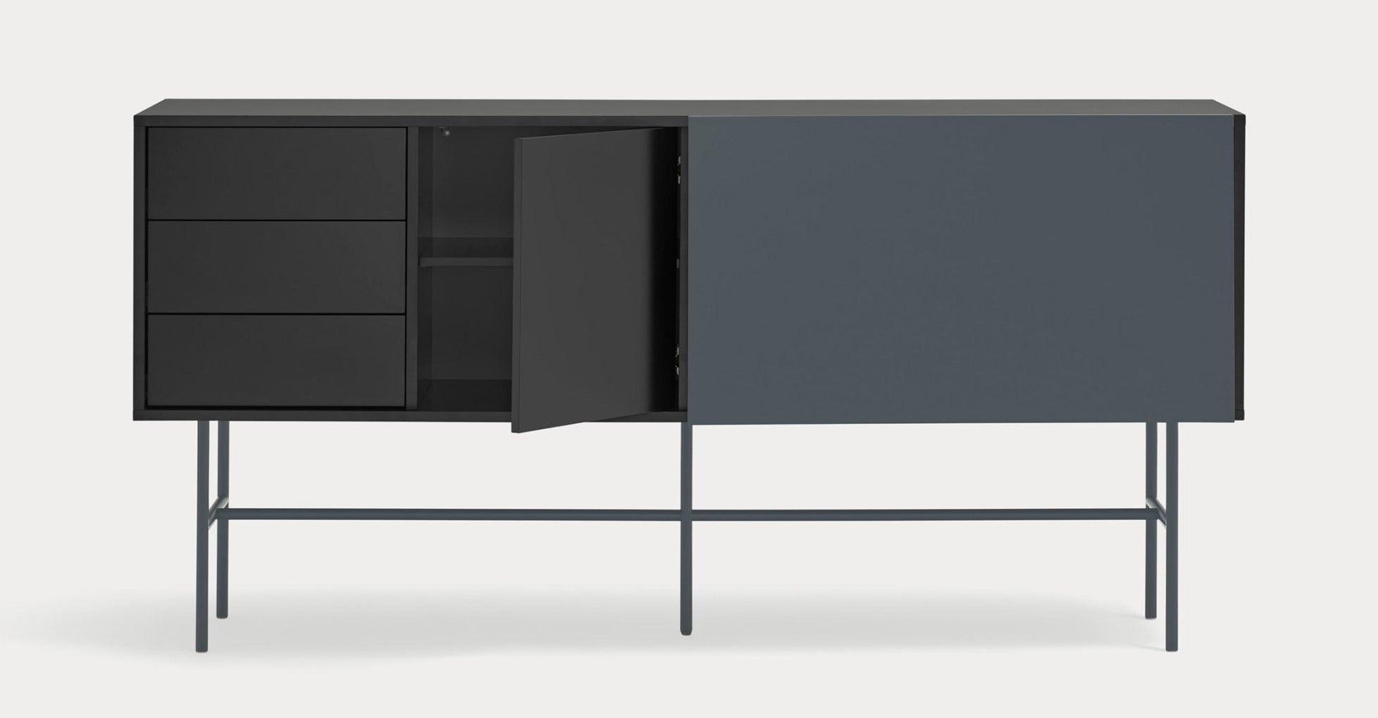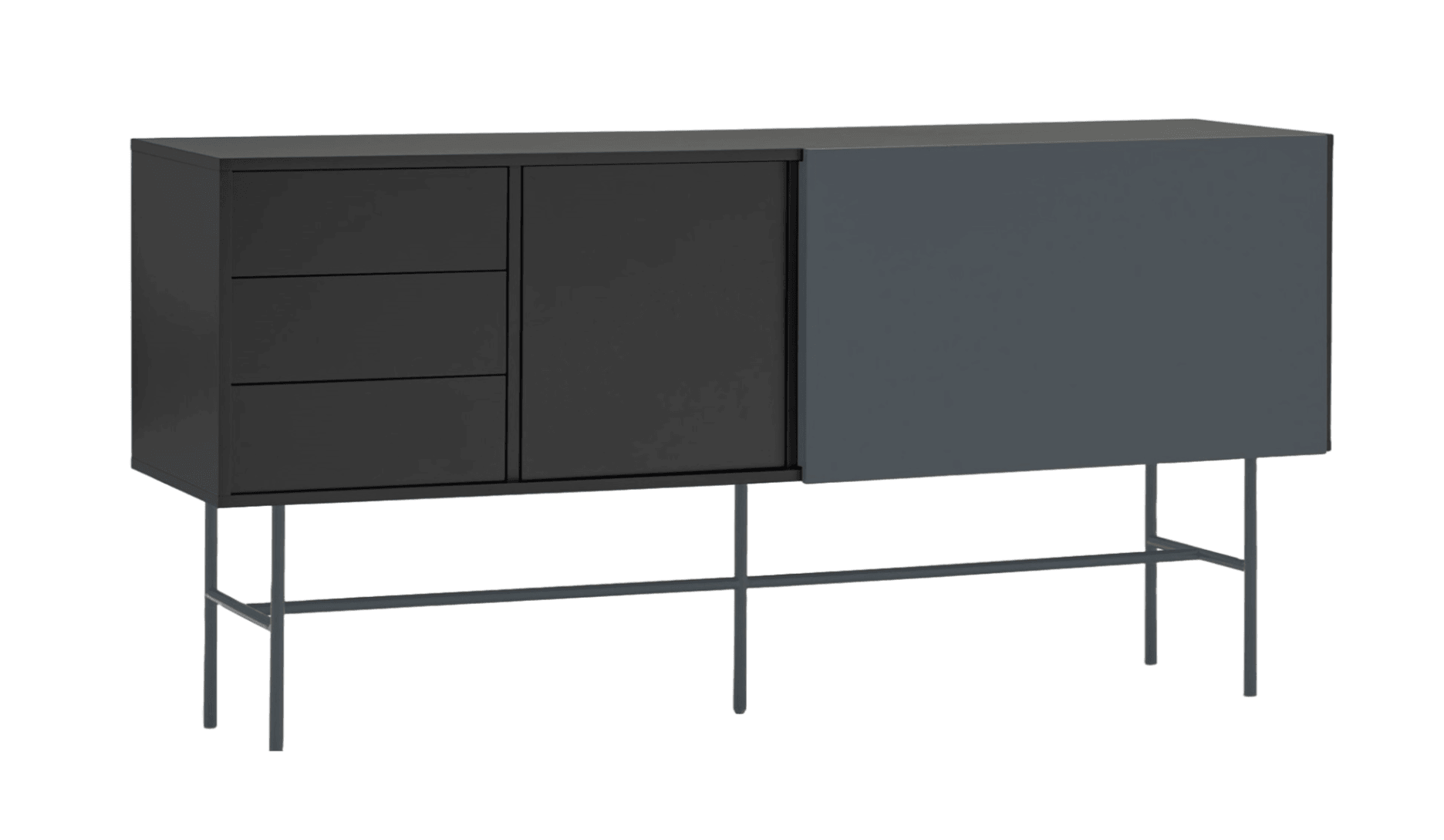 Wide cabinet with a unique anthracite color. The Nube collection is distinguished by an unusual and expressive configuration thanks to the sliding door, which can be freely set up, adapting to individual preferences. The way this door moves on the wide nube cabinet, revealing and hiding various parts of its interior, derives inspiration from the way the clouds move in the sky.