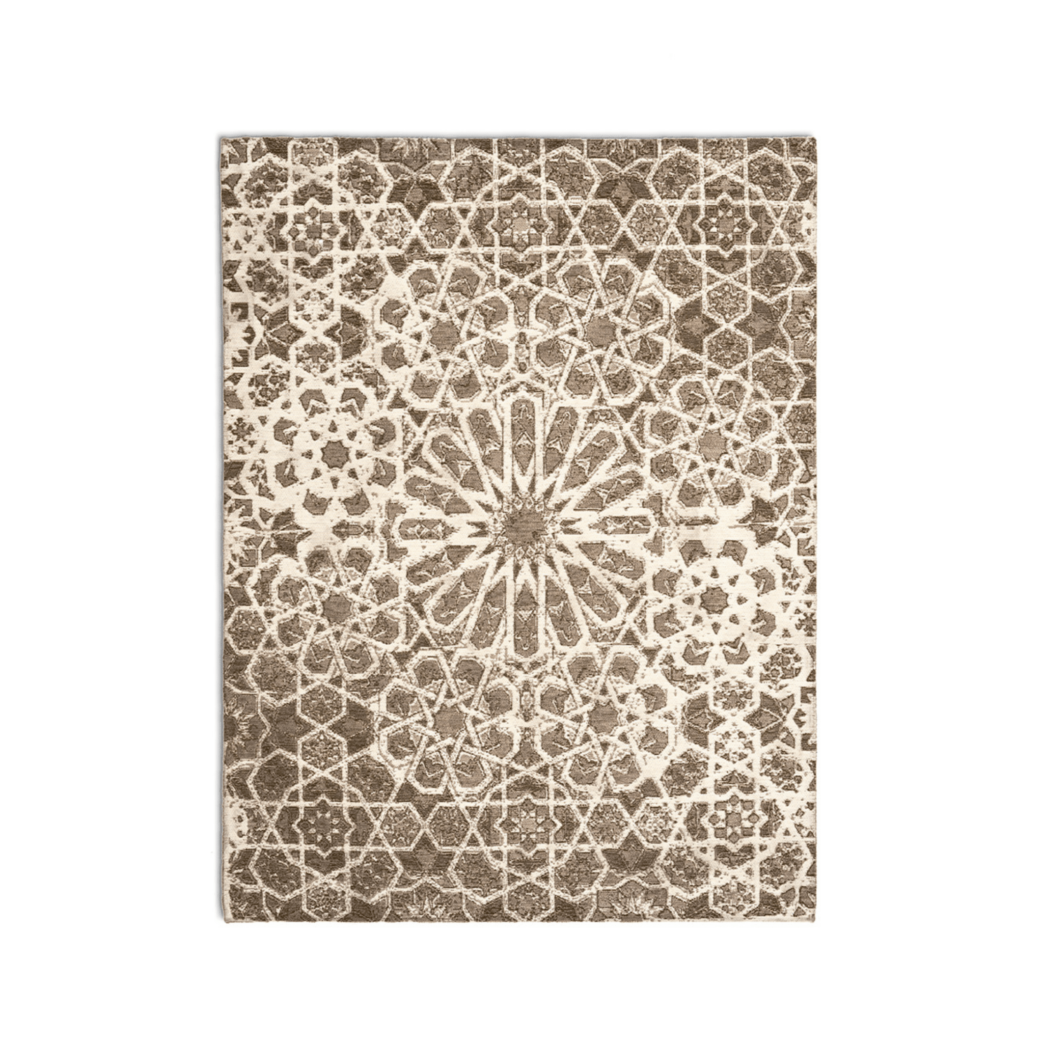 The rug design is a reinterpretation on a smaller scale of a section of the largest rug in the world, exuding an atmosphere of sophistication and artistry. It features intricate geometric patterns inspired by traditional arabesque shapes, creating a mesmerizing interplay of stars and floral motifs reminiscent of a gear.