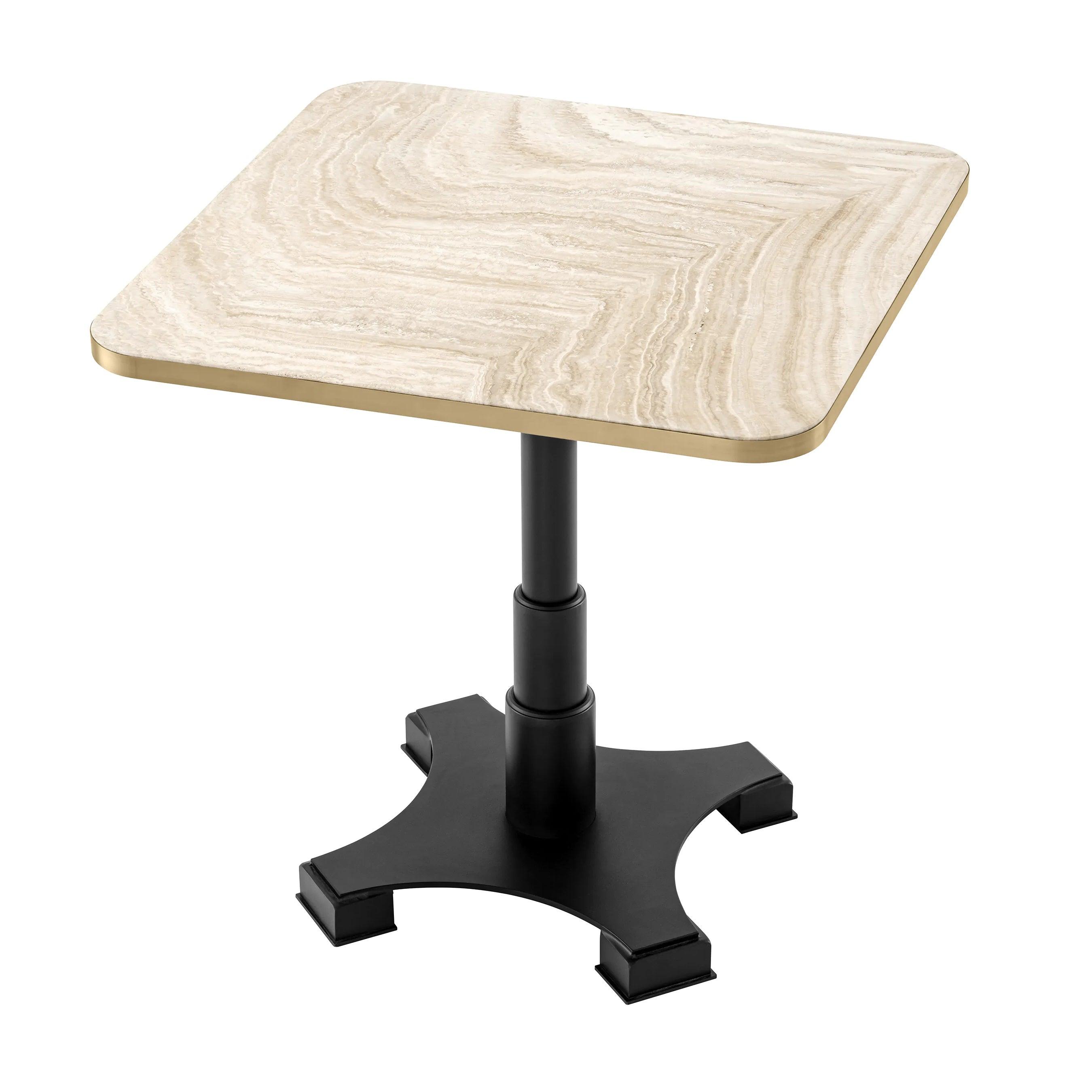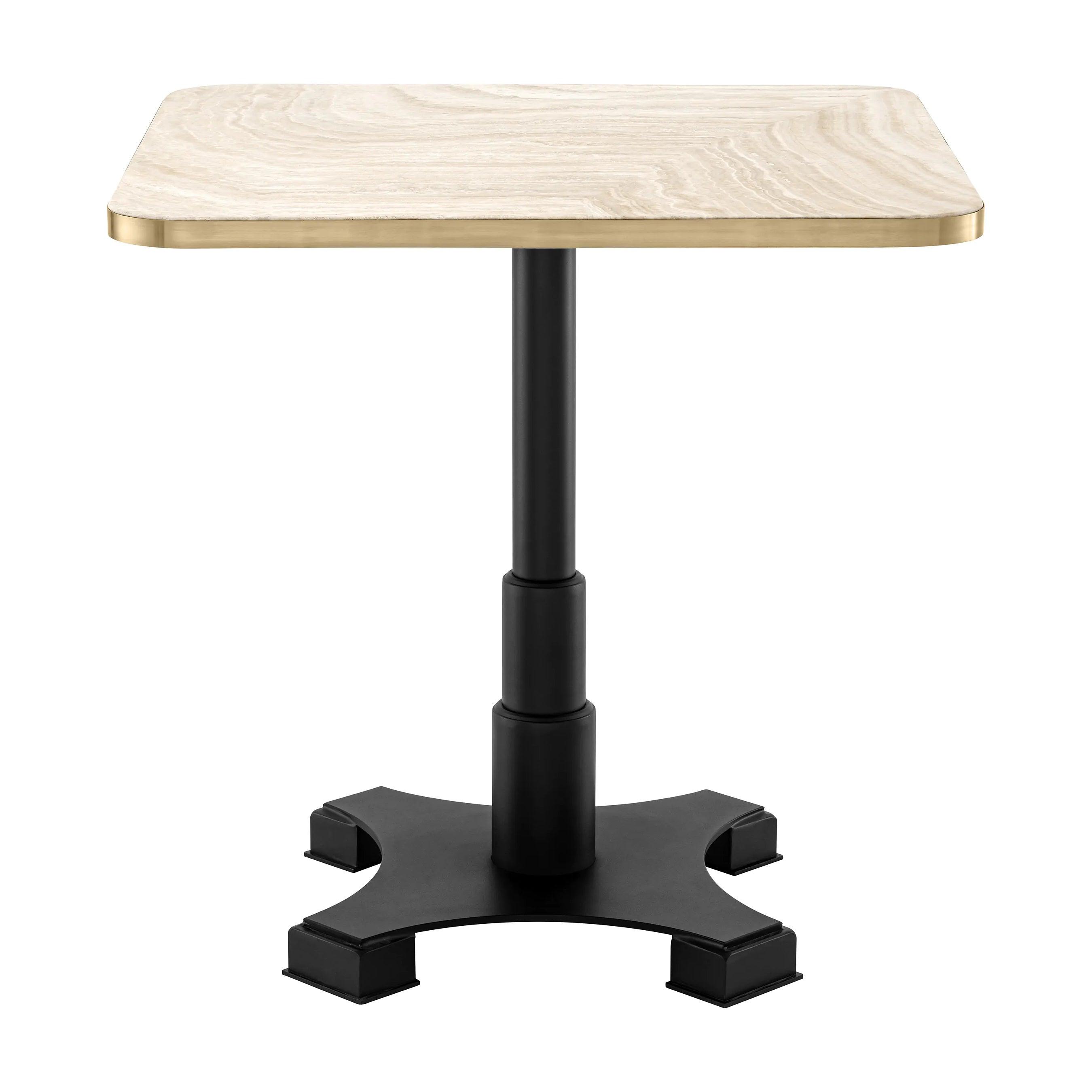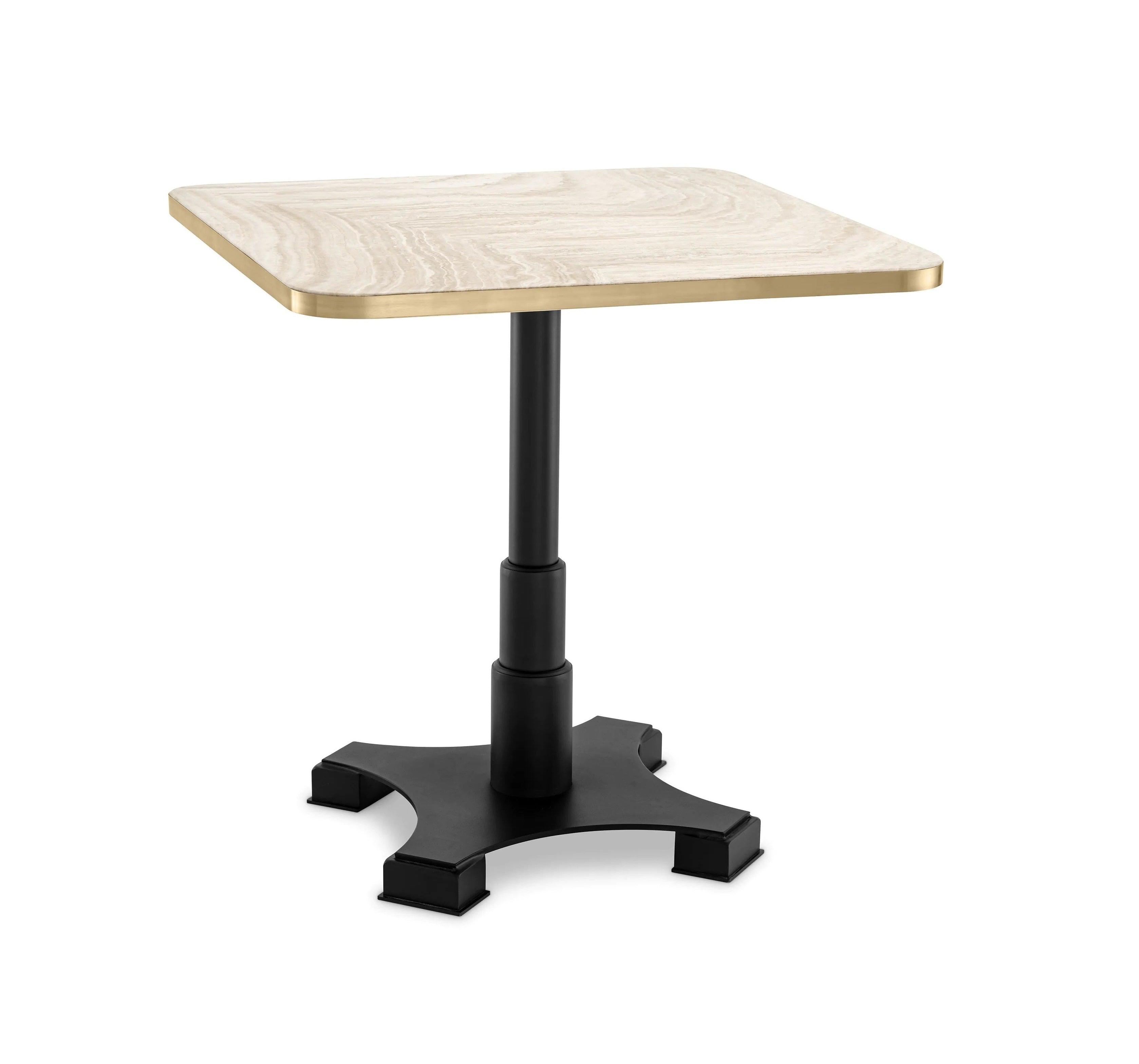 Dining table Avoria combines modern design with a touch of bistro classic nostalgia. The true gem of this piece is the natural travertine top, a stone valued for its unique embellishments and durability. The brushed brass edge adds shine and elegance, introducing a hint of luxury into everyday spaces.