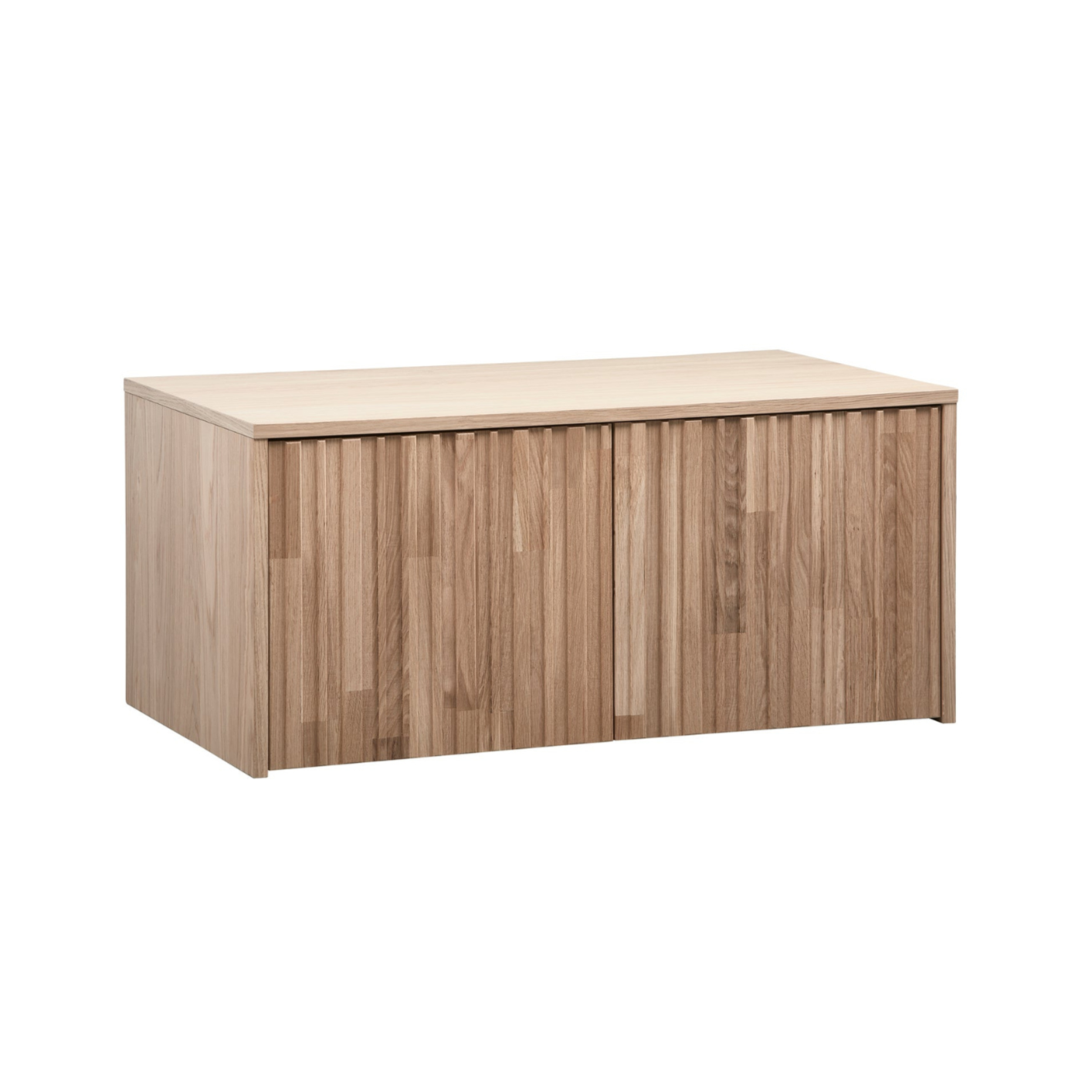 The furniture is made of oak veneer in a natural shade and protected with a clear lacquer, which highlights the beauty of the wood grain and gives the whole a subtle shine. Additionally, the bench offers a high load capacity – up to 160 kg – making it a solid seating option. Practical drawers provide plenty of space for storing everyday items or textiles.