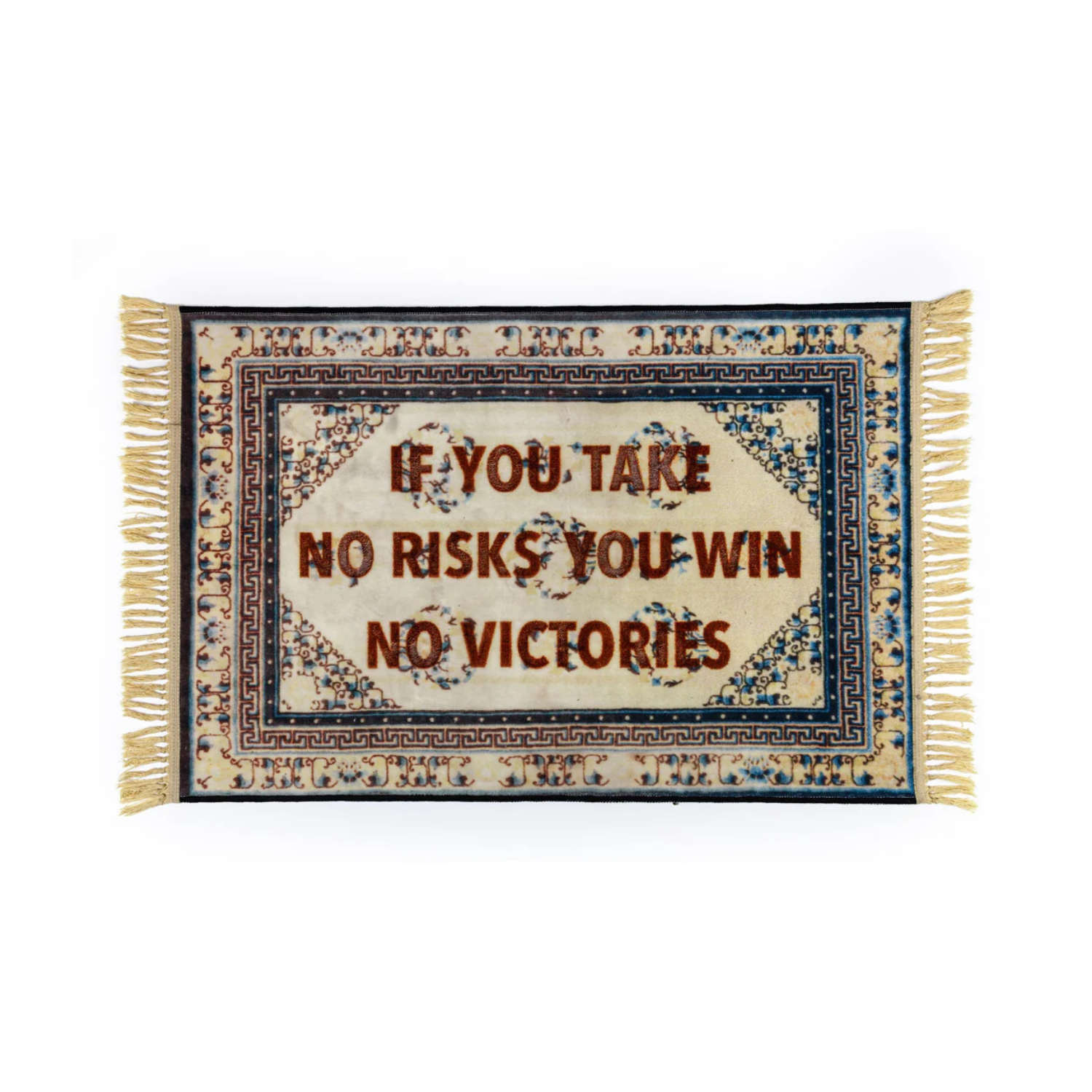 Rug Burnt - Choices is a combination of classic design with a strong, inspiring message. His pattern resembles traditional oriental rugs, But it is distinguished by a burned inscription, which prompts reflection on taking risks and making choices in life.