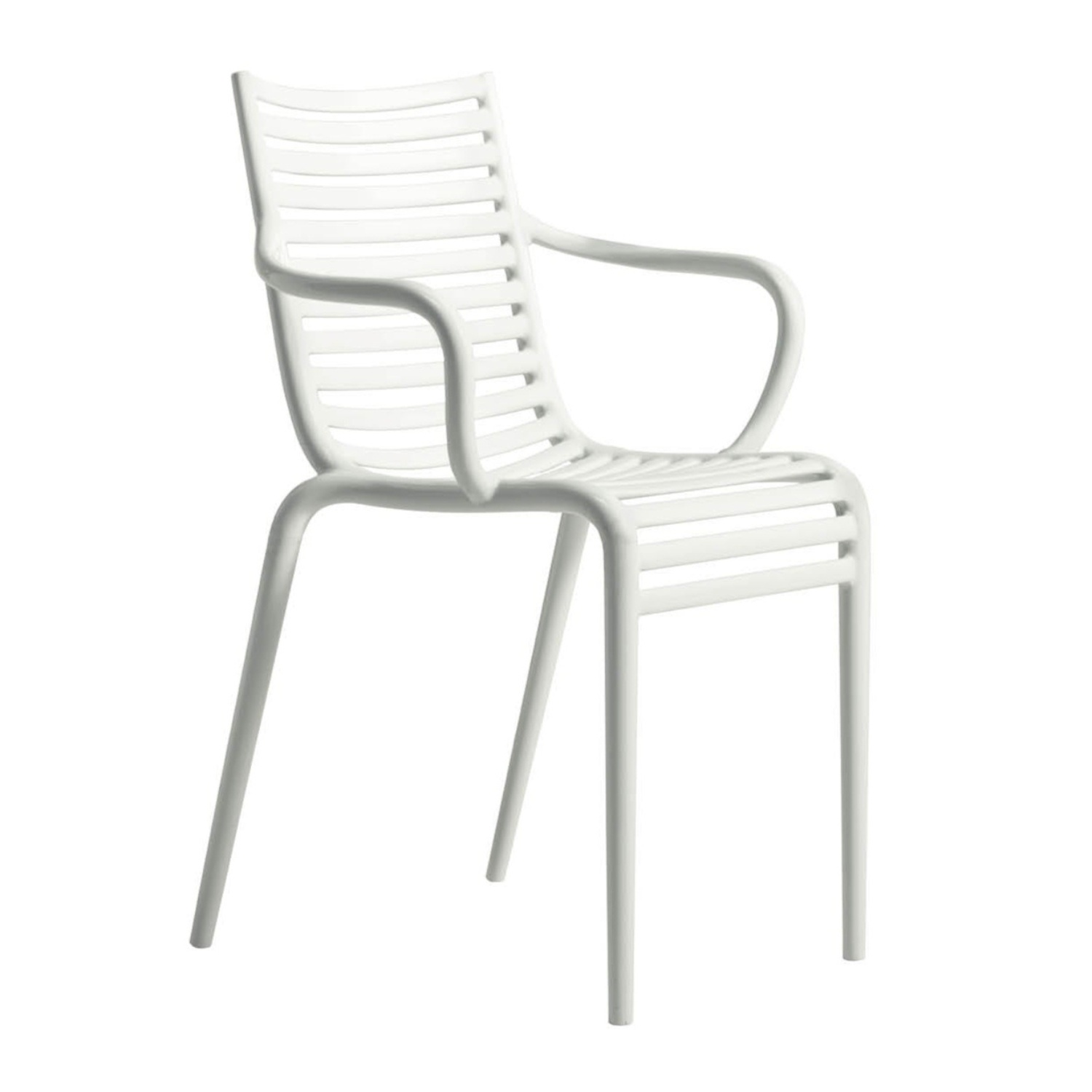 Chair with armrests PIP-E is a classic form in a modern edition by Philippe Starck. The characteristic horizontal slats forming the back and seat give it a graphic expression and an interesting effect of chiaroscuro, and their ergonomic system perfectly supports the figure and facilitates the arrangement of the legs. A simple and expressive design makes PIP-E to be found both in internal and outside.