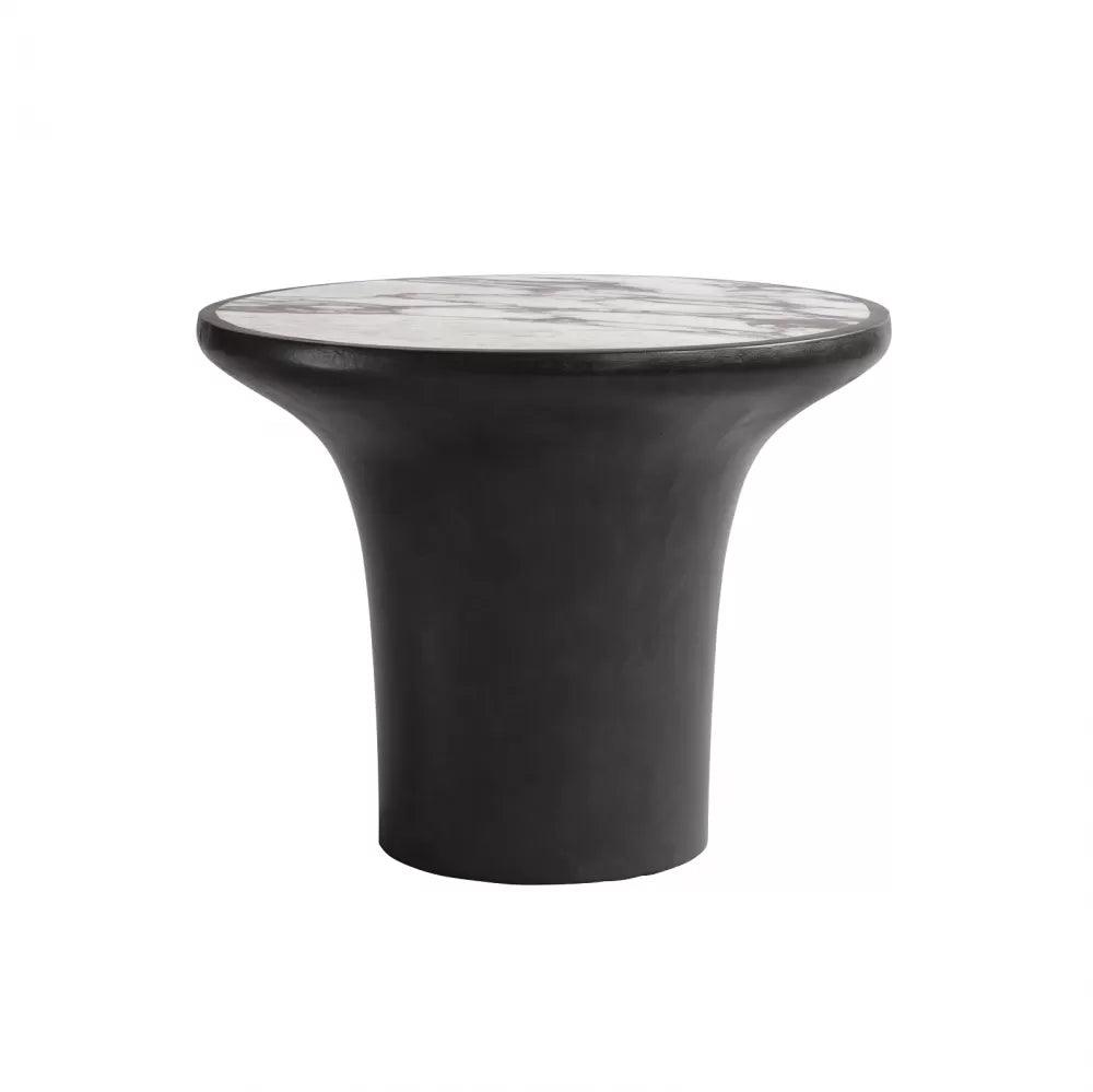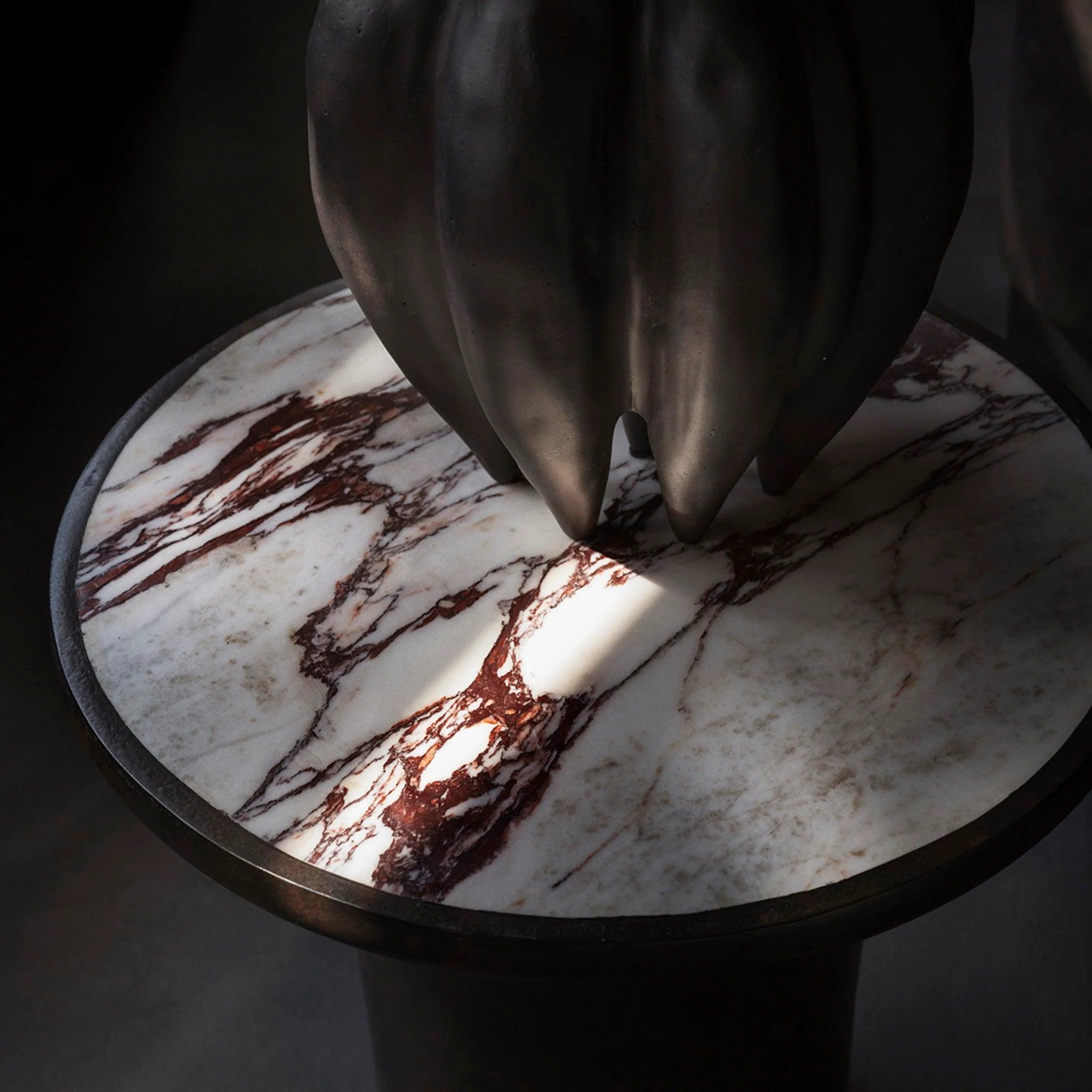 Tables come in two versions, one with tiles in calacatta color and the other version made from three types of exquisite marble, all tiles are mounted in a frame of fiber-reinforced concrete. Each table is unique due to the natural differences in color and pattern of each marble.