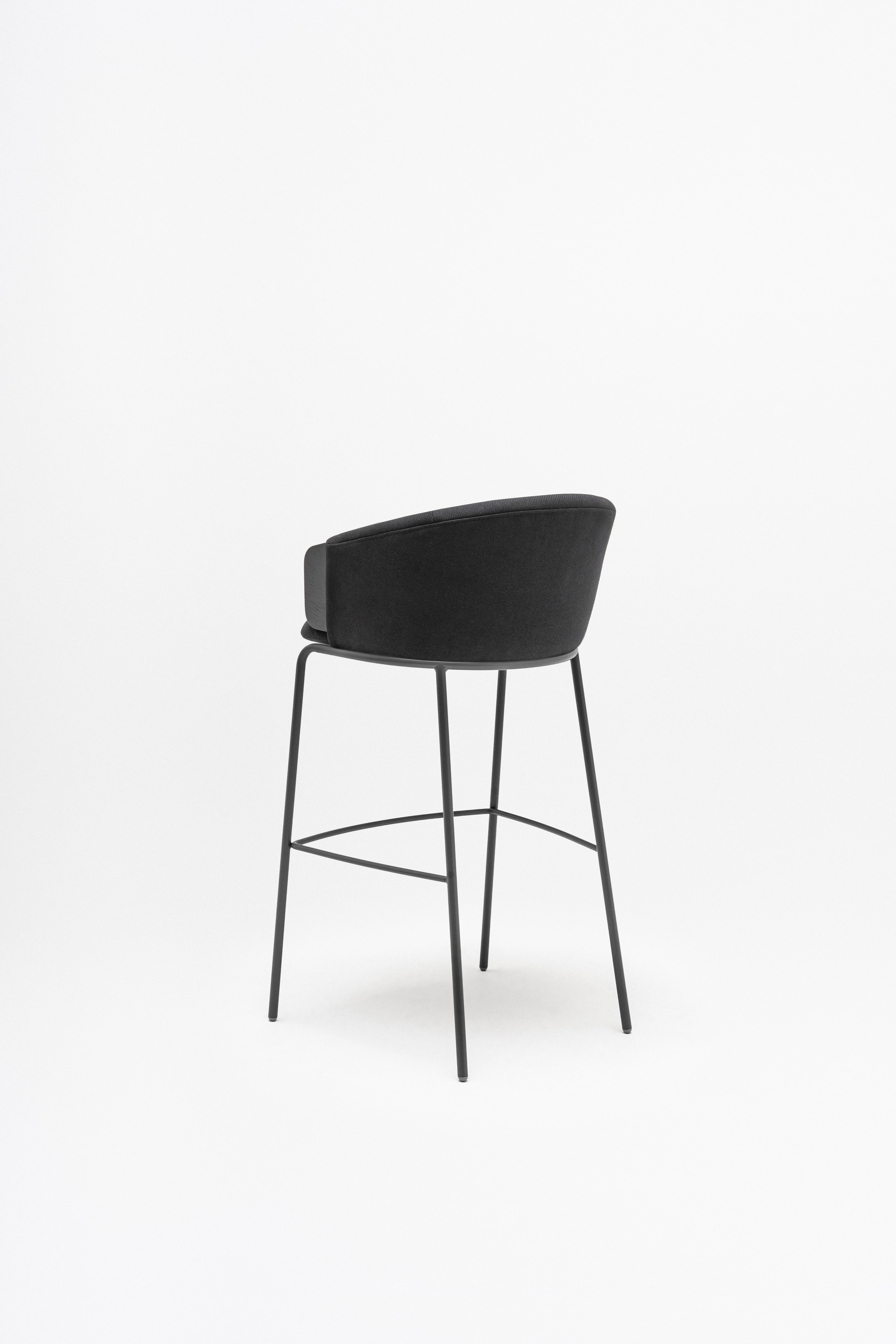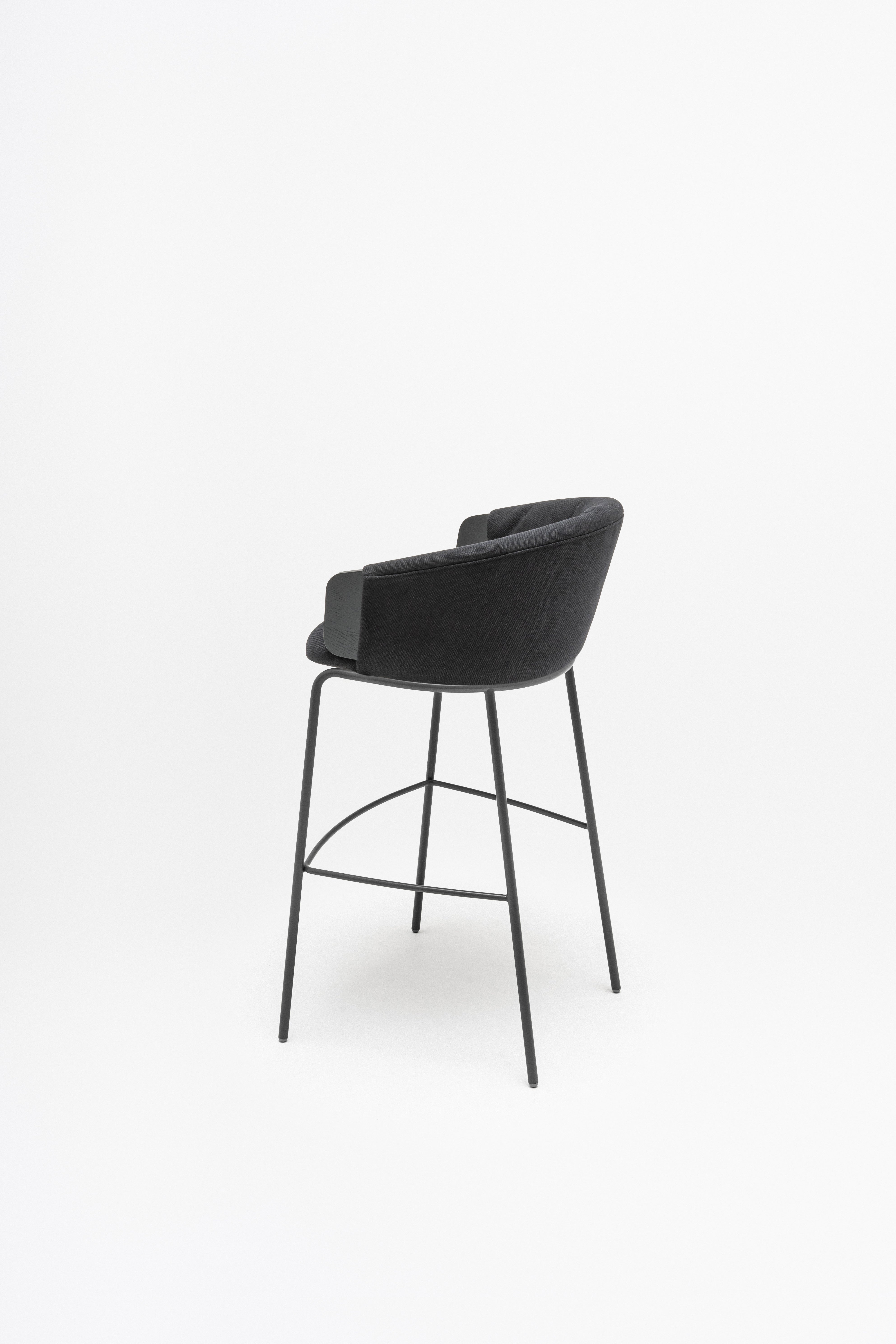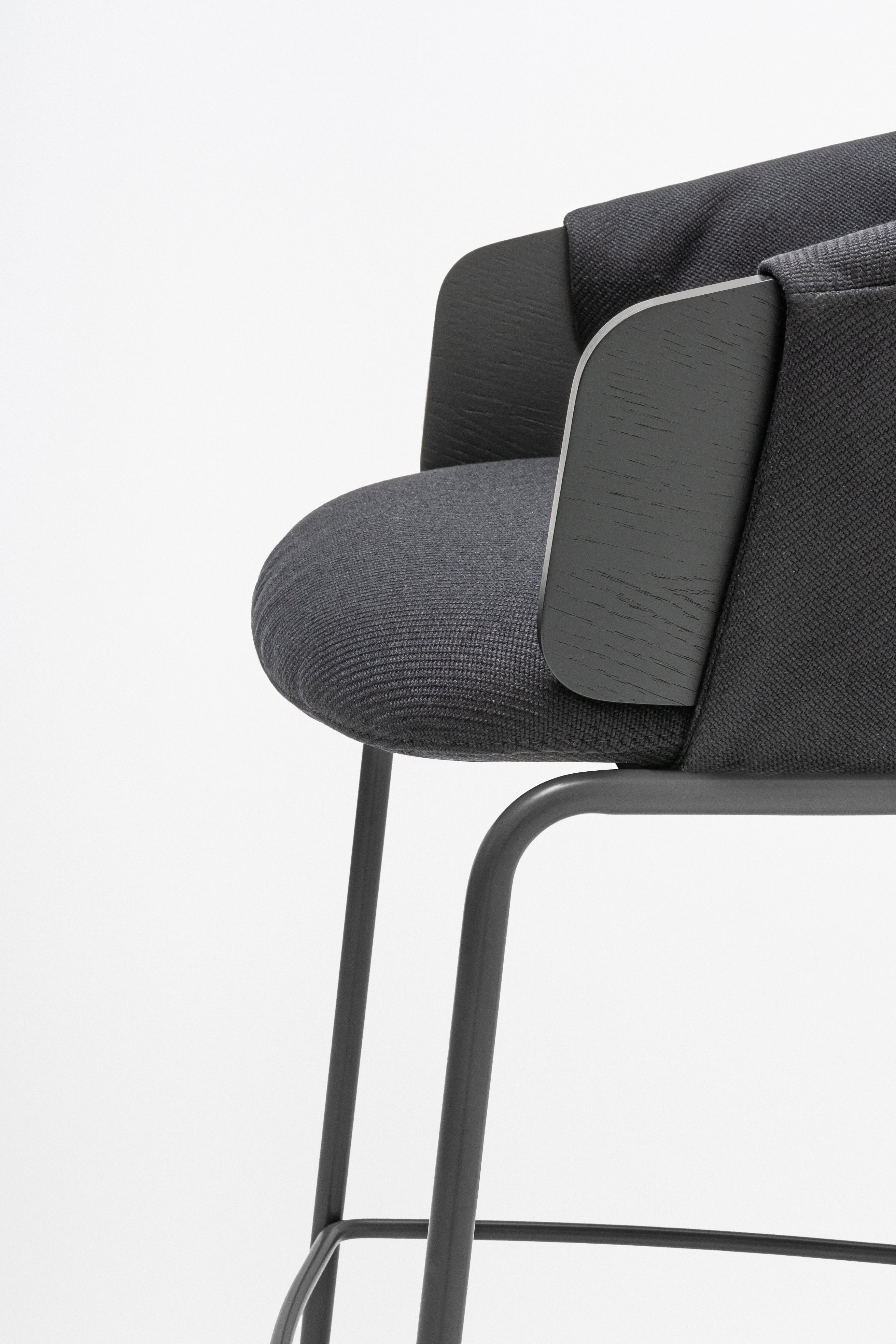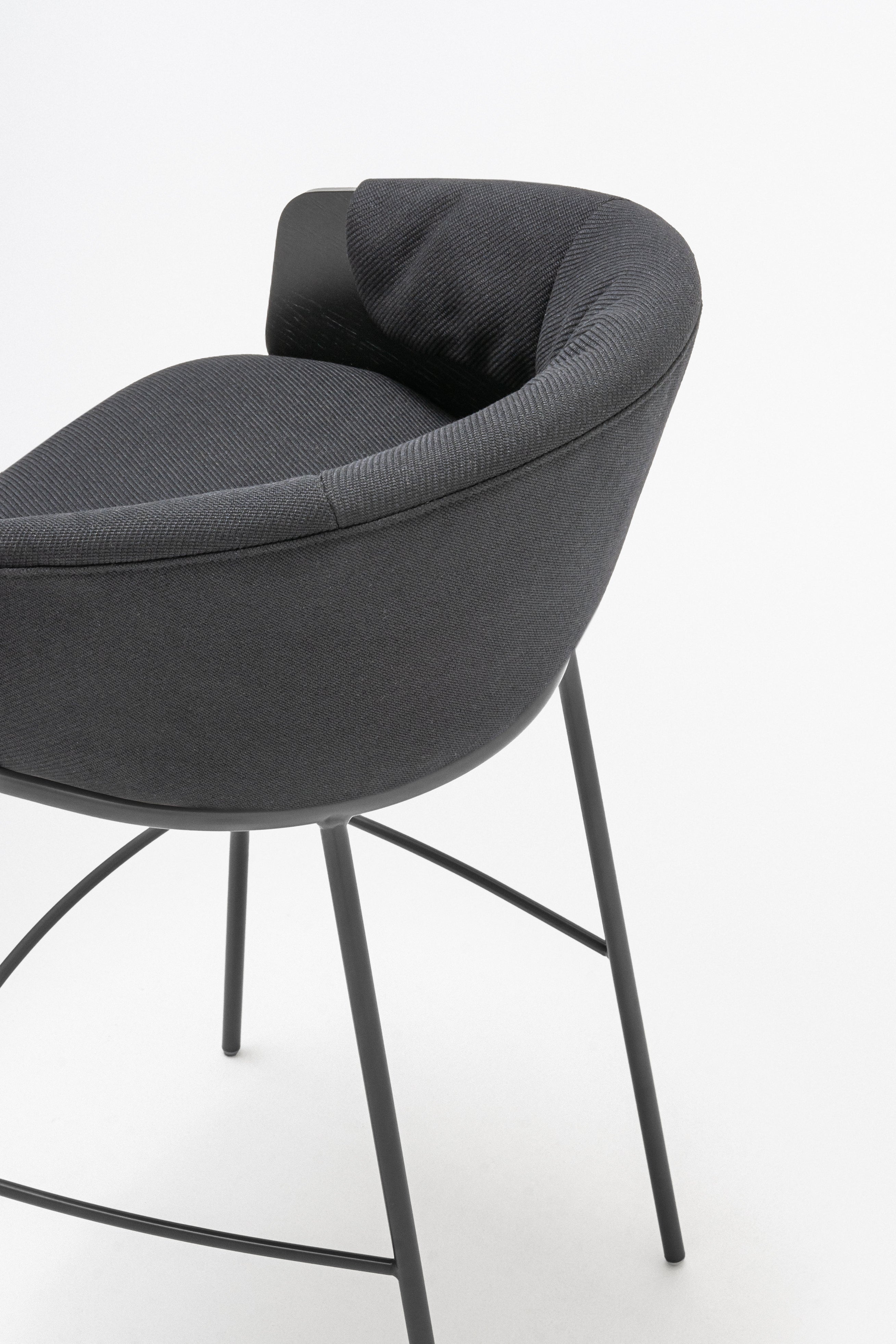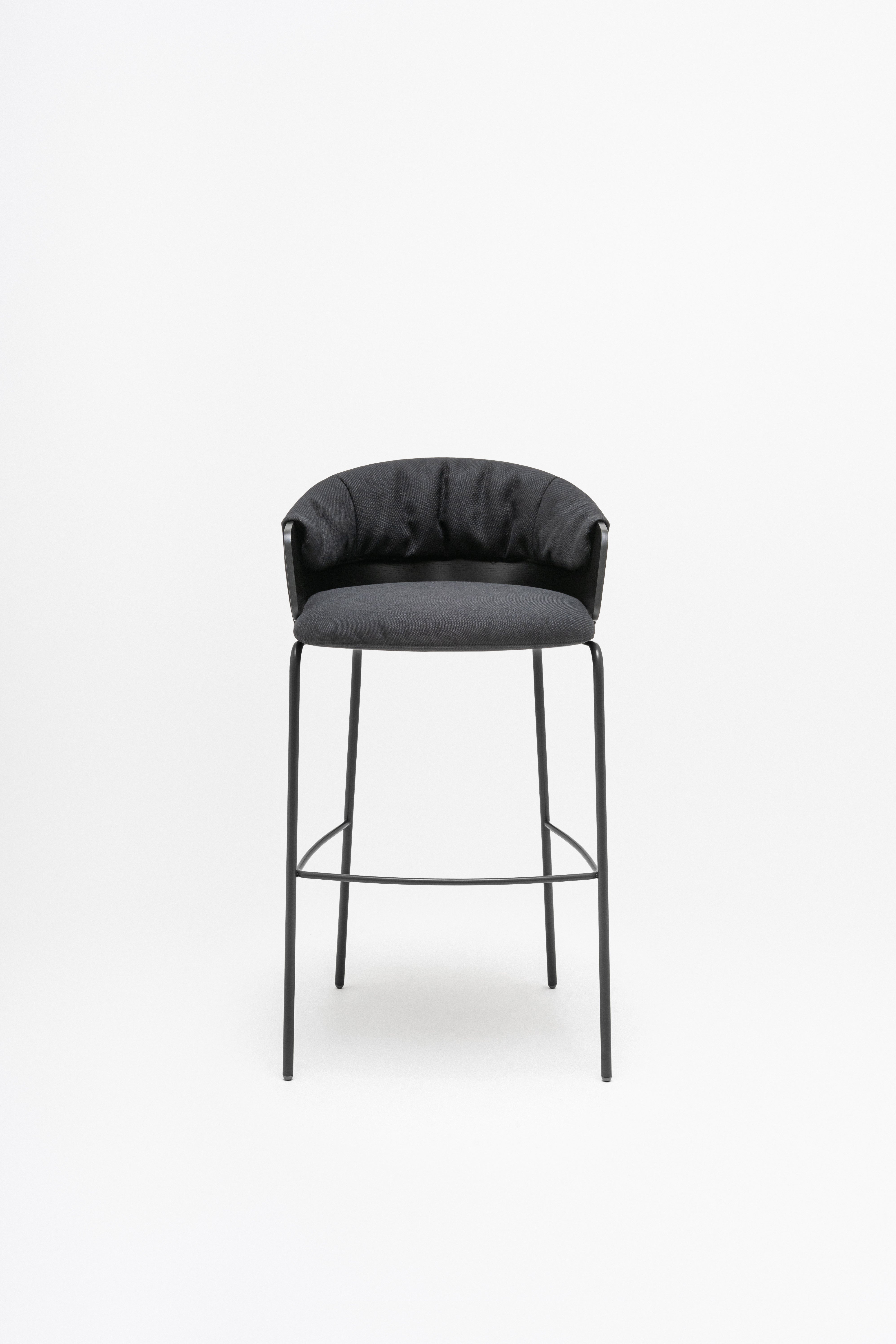 Bar COLlar is a stylish combination of the comfort of the chair with the functionality of the bar furniture, ideal for bar and kitchen spaces. The plywood seat, enriched with a characteristic pillow with ruffles, is embedded on a high base, which ensures comfortable sitting even for a long time. The backrest envelops the user, and the integrated armrests allow for comfortable backing of the arms. The chair is available in two seats, which allows you to match the kitchen or bar countertop.