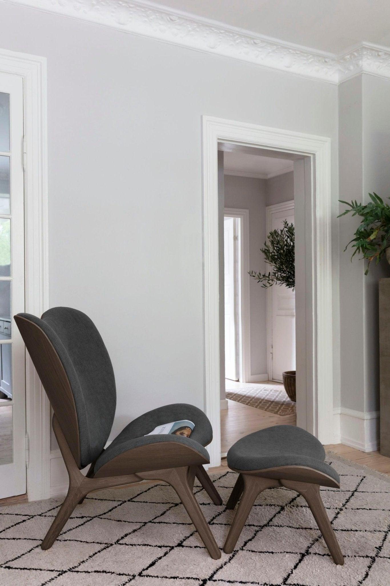 Armchair Conversation Piece Tall is available in oak, dark oak and black oak, in eight carefully selected shades of Horizons fabric, made entirely of recycled materials, as well as in two colors of Teddy Bear fabric.