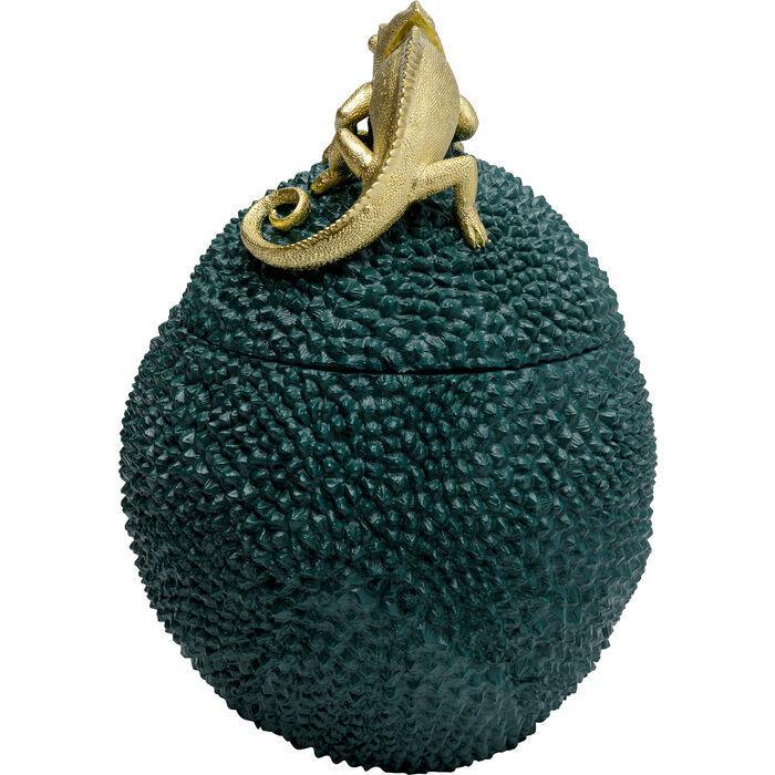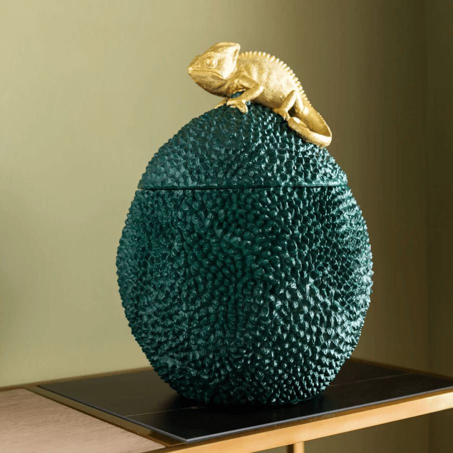Złoty kameleon, który strzeże zawartości pudełka, pięknie kontrastuje z butelkowym kolorem. Pojemnik o ciekawej, nieregularnej strukturze, inspirowany był dżakfrutem - największym wśród owoców rosnących na drzewie. Całość świetnie sprawdzi się jako dekoracja w salonie, jadalni oraz sypialni.