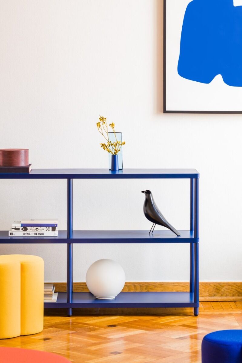 Rack Stilt is distinguished by a solid structure of steel pipes and optional wheels, which increases its mobility. The characteristic design and the possibility of expanding the shelf with subsequent modules makes it perfectly fit into modern and flexible interior arrangements.