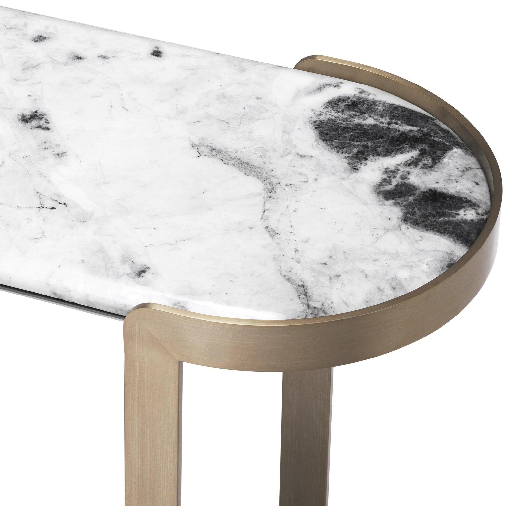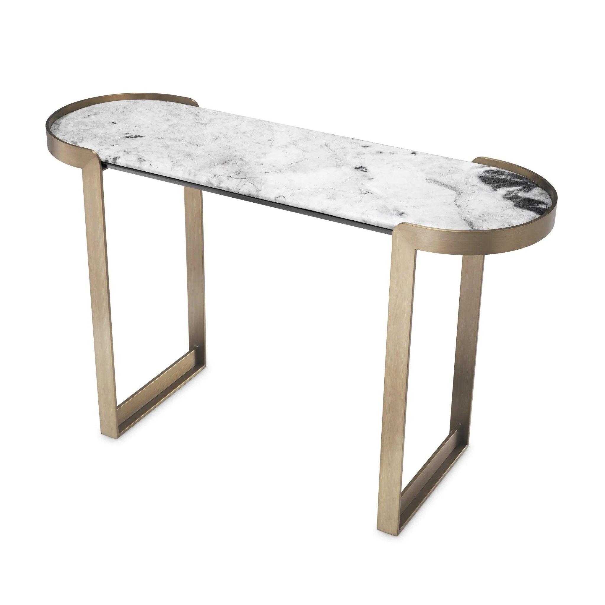 Its metal legs, finished in brushed brass, are not only sturdy but also artistically curved, creating a sleek contour around the edges of the top. This pill-shaped top made of Barcelona marble is a distinctive feature of the furniture, giving it a luxurious character and sophistication.