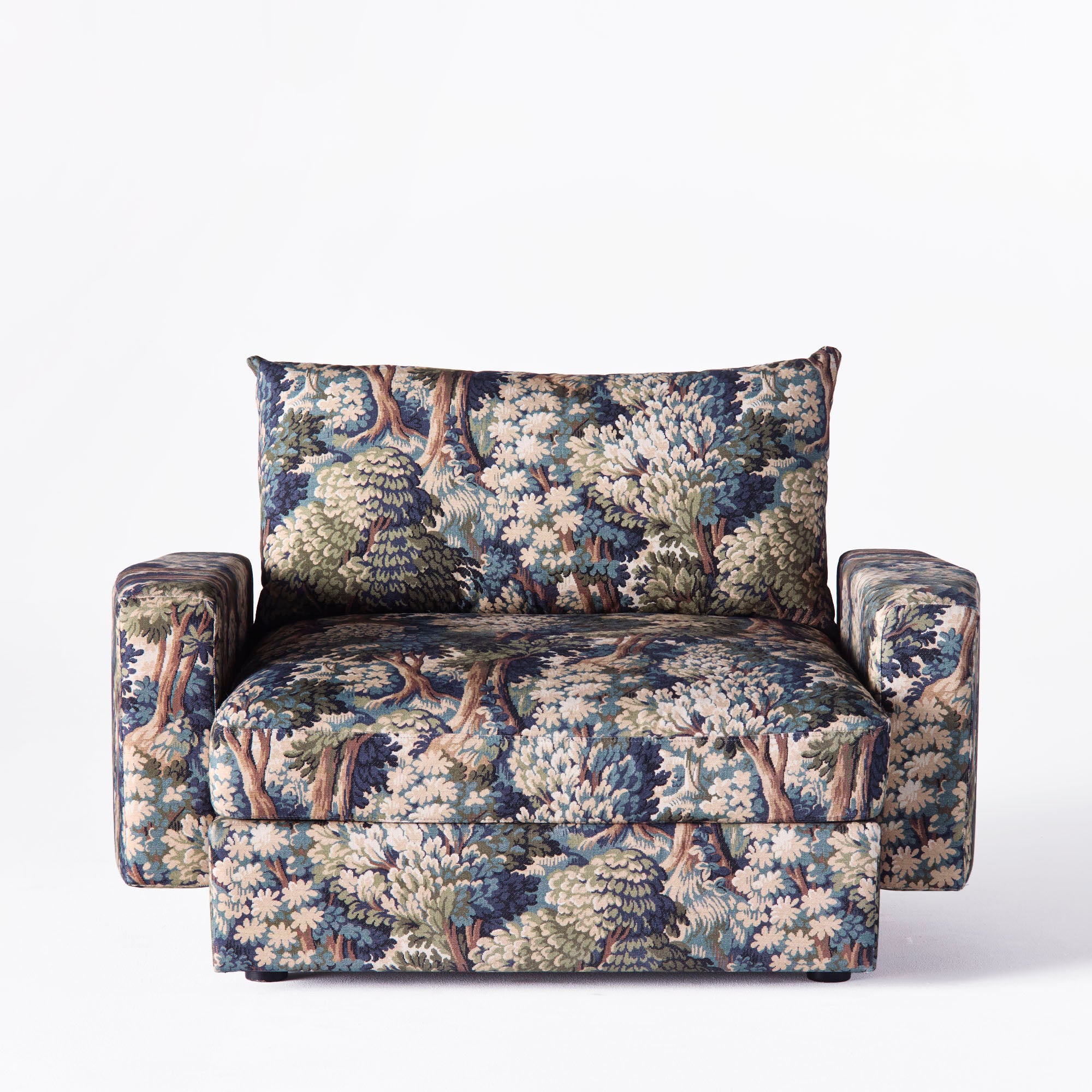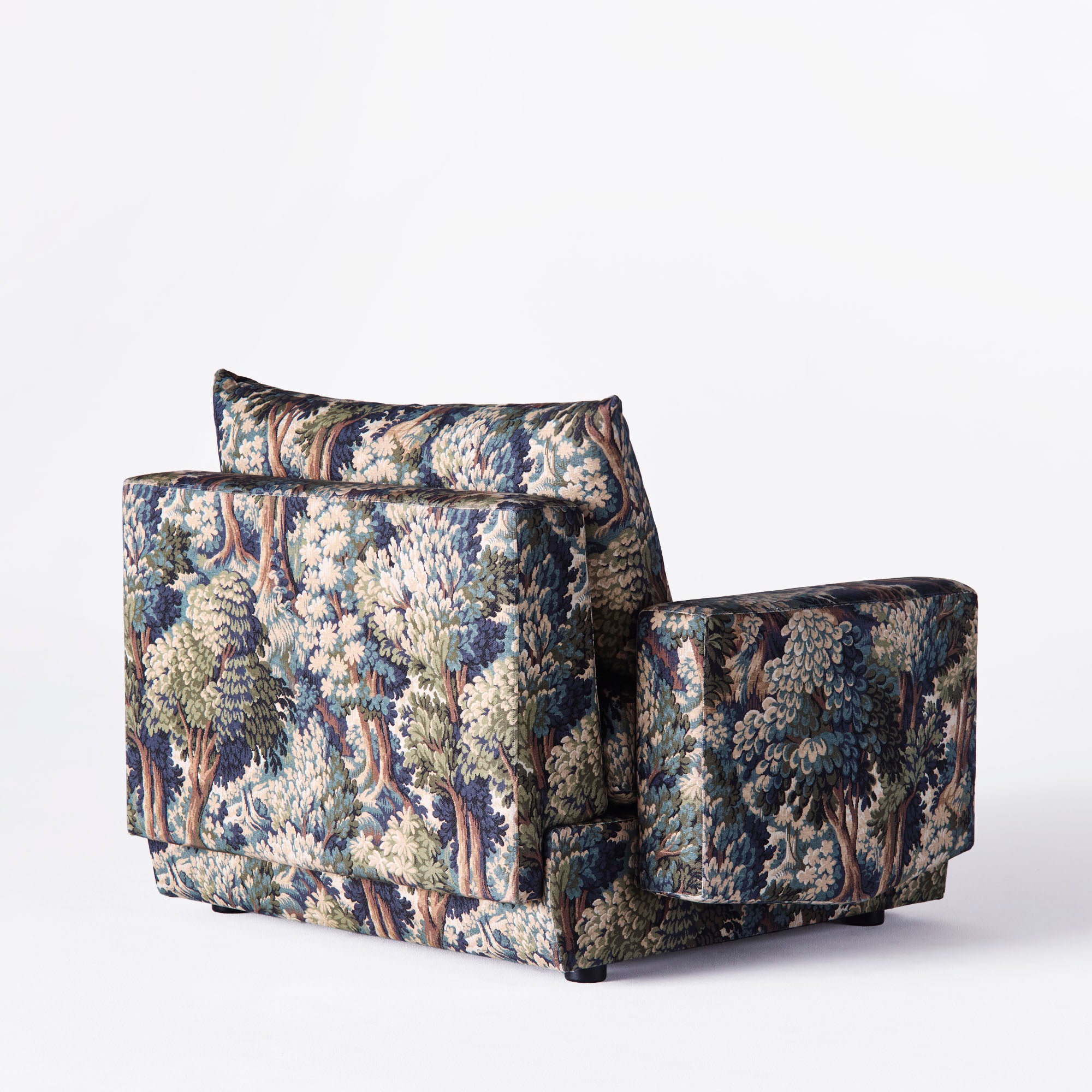 Laurel Armchair is a unique piece of furniture created in collaboration between Dusty Deco and the architectural studio Bross. Its geometric silhouette and angular armrests give it a modern character while maintaining timeless comfort. The upholstery in Lauritzon fabric from the Into the Woods collection, inspired by nature, in deep green shades and rich patterns makes the armchair a focal point of the interior.