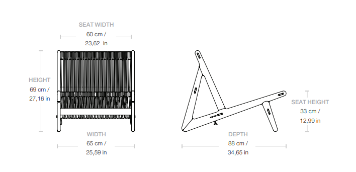 The frame is crafted without the use of screws, highlighting the artisanal skill and purity of the construction. The seat and backrest made from high-quality polyester rope, resistant to water and UV rays, ensure durability and comfort even in the most demanding conditions. The core of the rope prevents it from stretching over time, maintaining optimal support and aesthetics.