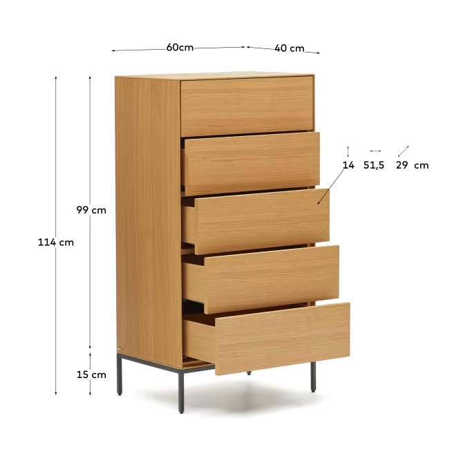 High chest of drawers Vedrana, created by the experienced design team at La Forma, represents a perfect harmony between oak veneer and steel, creating a unique combination of functionality and aesthetics. This unique blend of materials makes Vedrana perfectly fit into various types of homes and design styles, highlighting their elegance and modernity.