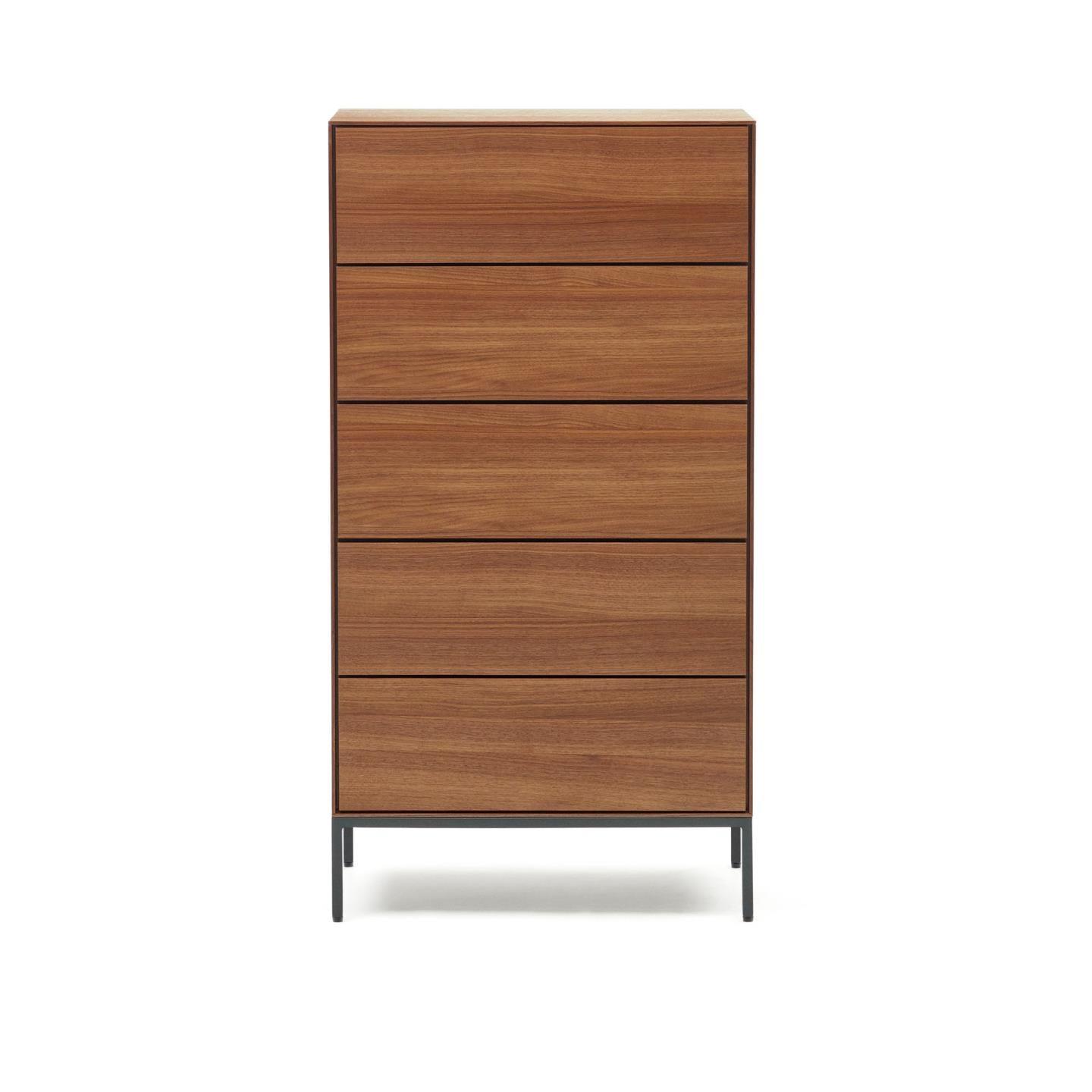 Tall chest of drawers Vedrana, created by the experienced design team at La Forma, represents a perfect harmony between walnut veneer and steel, creating a unique combination of functionality and aesthetics. This unique blend of materials makes Vedrana perfectly suited for various types of homes and design styles, highlighting their elegance and modernity.