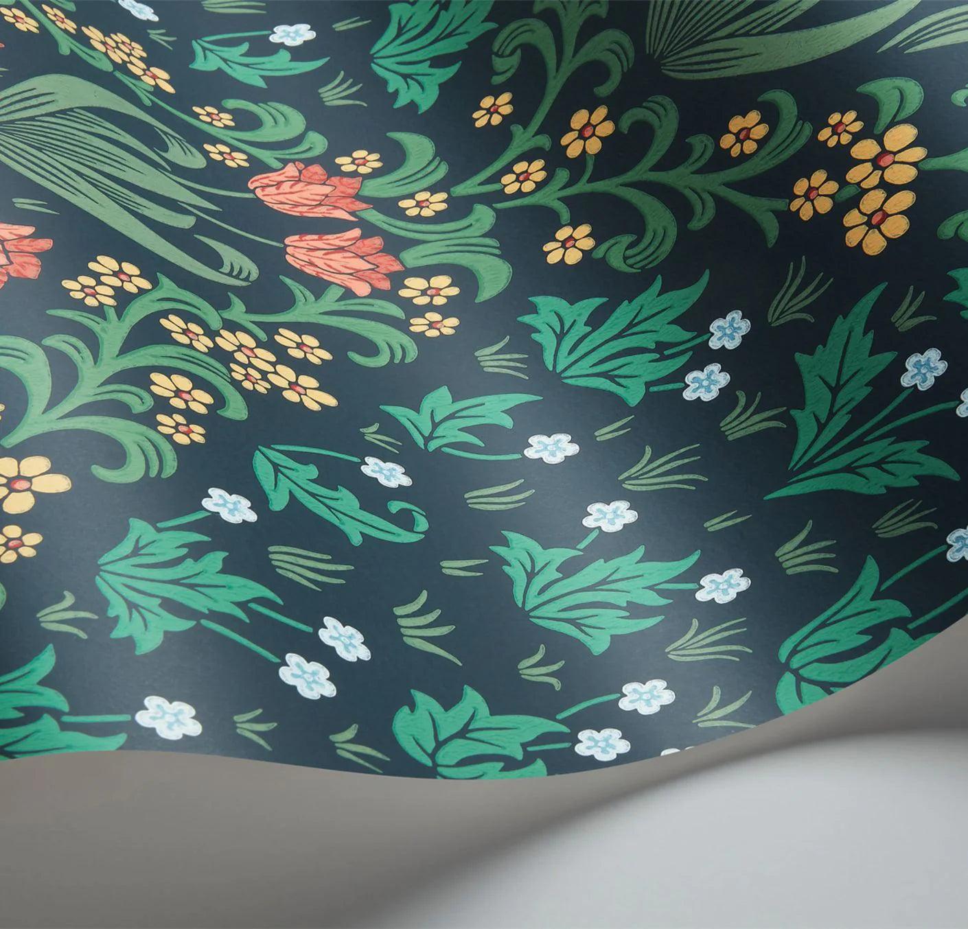 Wallpaper with a plant motif of leaves and flowers HRP GREAT MASTERS - Tudor Garden green and red