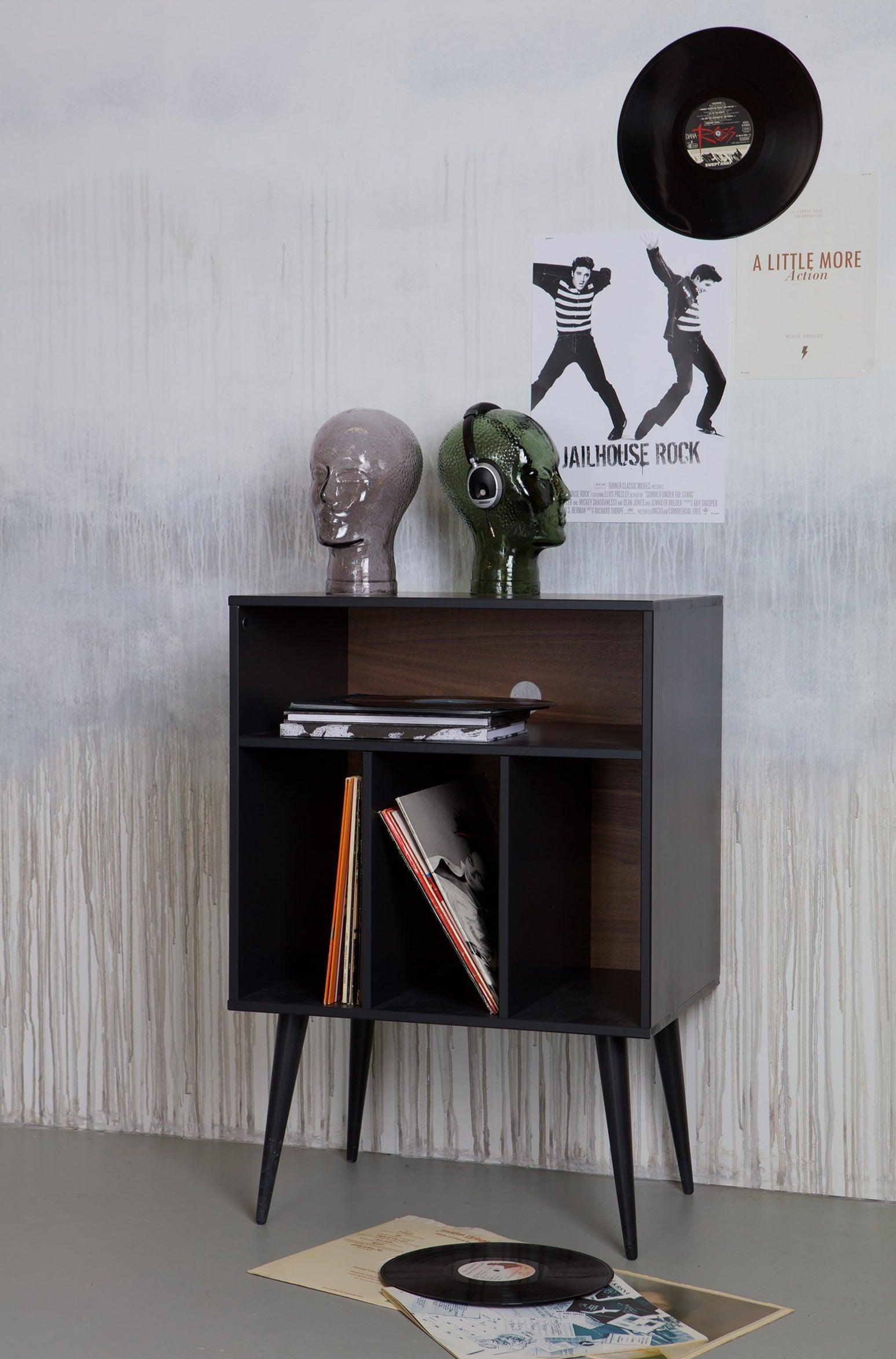 The open vertical shelves are designed to hold books, vinyl records, or other tall items. The cabinet supported by four tall legs adds lightness to the interior and pairs beautifully with the entire James collection.