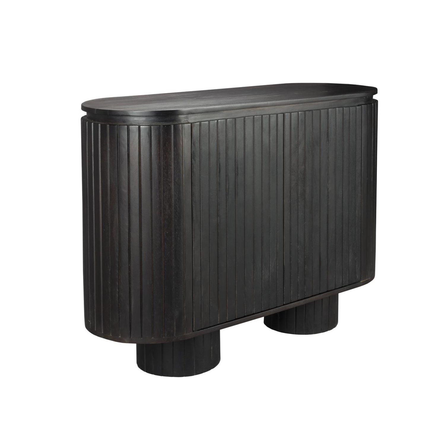 Cabinet Kenji from Dutchbone is a expressive element that immediately gives the interior character. It is distinguished by its oval shape and black wood, and the wide, rounded legs slightly lift it above the floor, emphasizing its streamlined form. The most unique element of the Kenji cabinet is a finish with narrow, vertical strips that make the door almost invisible, creating a coherent whole.