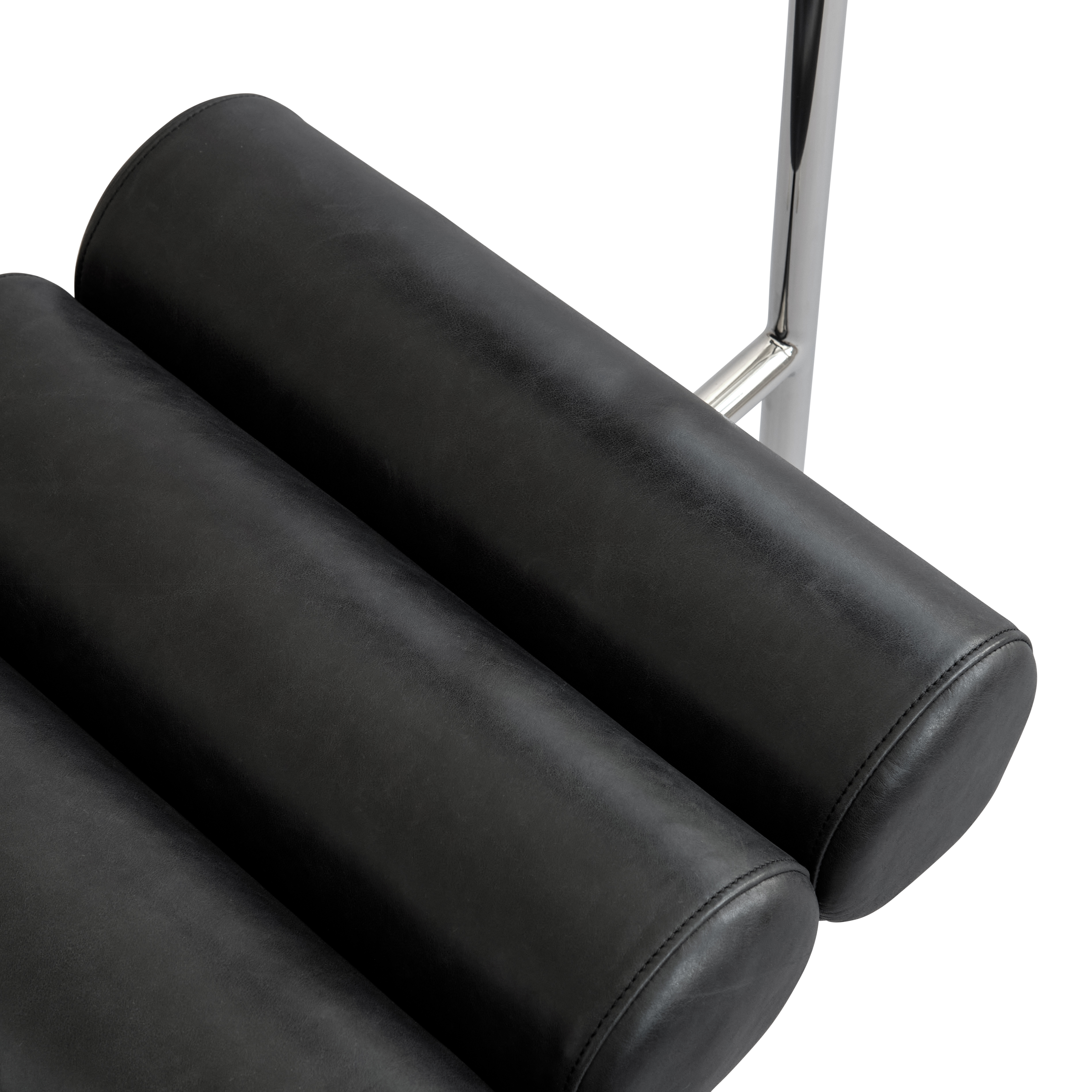 Chair Hiro is a combination of minimalist form and refined detail. Four cylindrical elements create its seat and backrest, forming a composition that is raw on one side and distinctly sculptural on the other. Three slender legs made of stainless steel give the whole piece a sense of lightness, contrasting with the strongly defined shape of the upholstered cylinders. The black upholstery made of high-quality aniline leather adds depth and elegance to the chair, emphasizing its graphic character. The backrest, reminiscent of a handle, not only catches the eye but also makes it easier to move the furniture around – a subtle gesture of functionality embedded in the form.