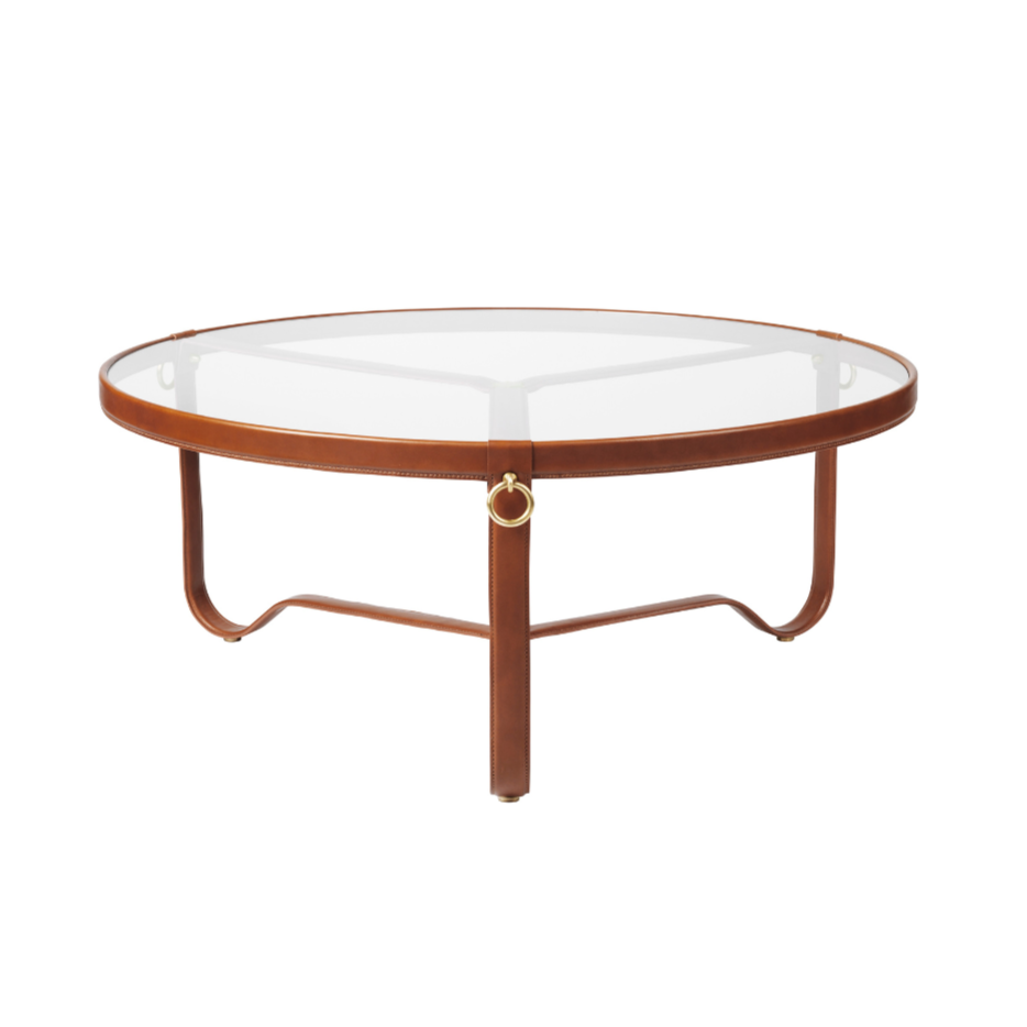 ADNET coffee table glass and brown leather