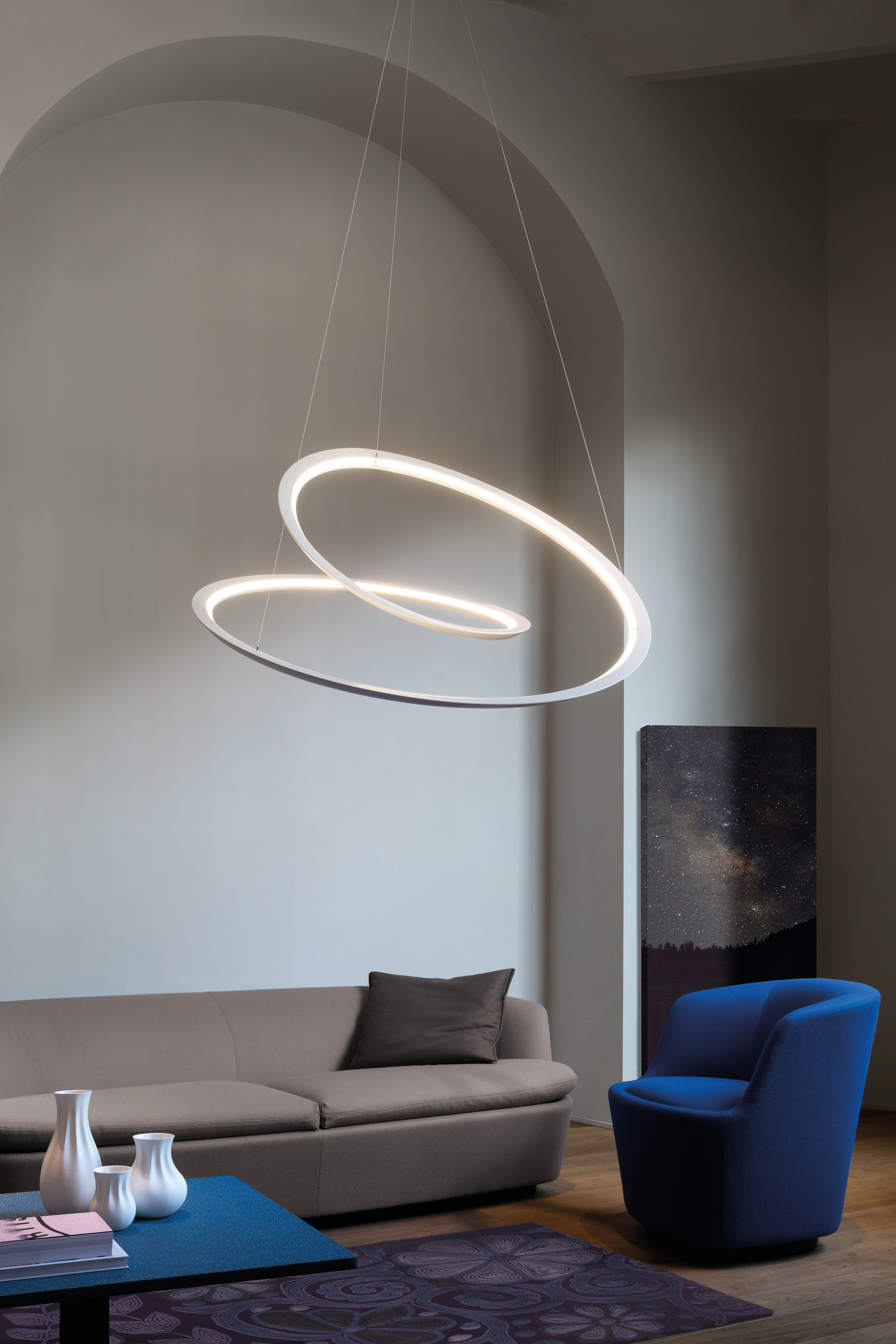 The Kepler pendant lamp is a spectacular form inspired by the principle of the mathematical Möbius strip. Its continuous line, made of bent aluminum, creates a sculptural, three-dimensional structure that draws the eye and defines the space. Thanks to the technology developed by the brand Nemo, the Kepler pendant lamp delights with both its form and functionality.