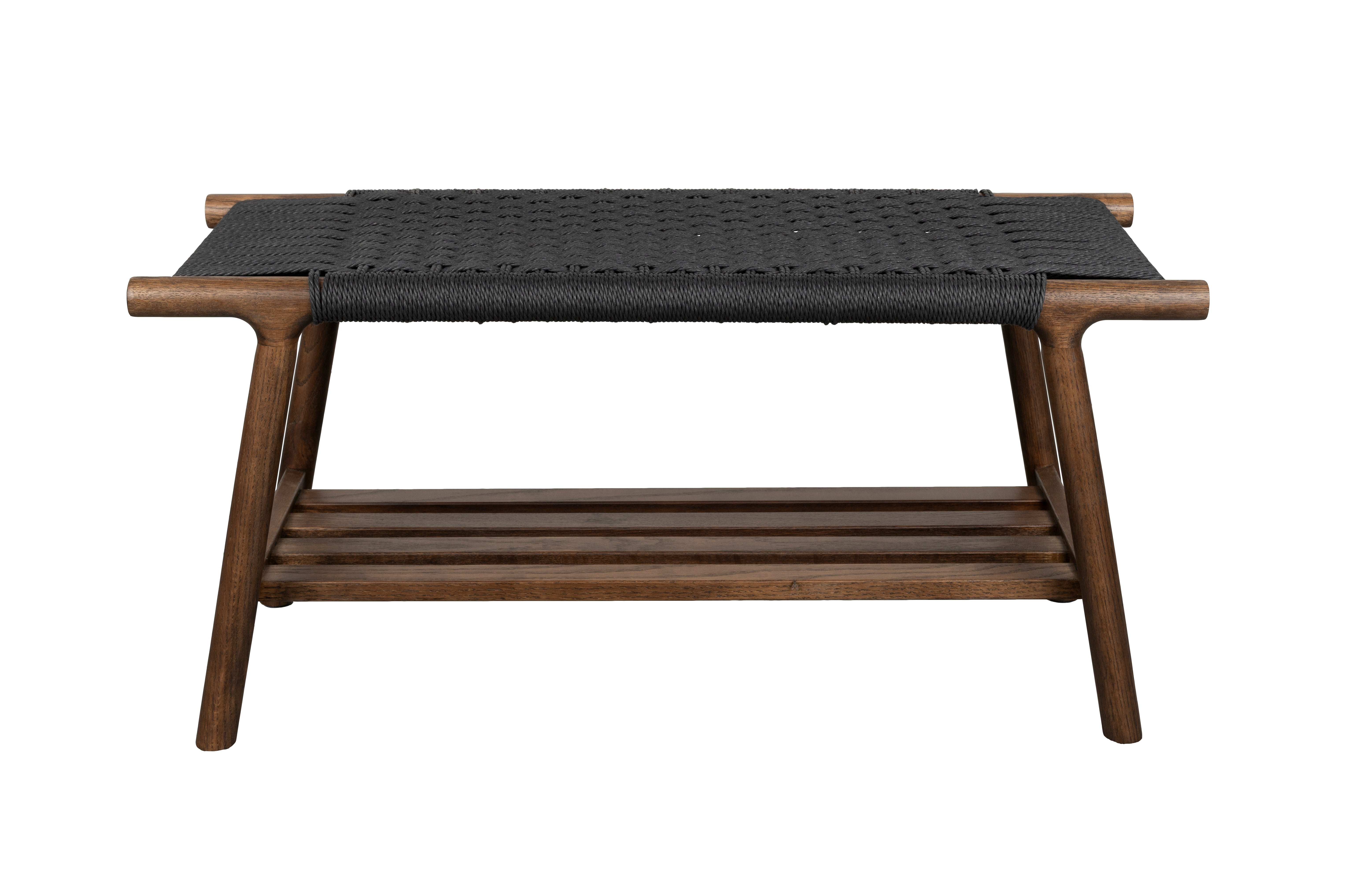 Elegant bench Kintaro in walnut color is a stylish piece of furniture that will bring a warm 1970s vibe into your interior. Made of solid oak wood in a rich walnut shade, it delights with organic lines and rounded edges. The most striking feature is the characteristic seat made of woven cord, where vertical and horizontal strands intertwine in the center, creating a stunning pattern. An additional slatted shelf placed under the seat provides a practical space for storing shoes, books, or small items.