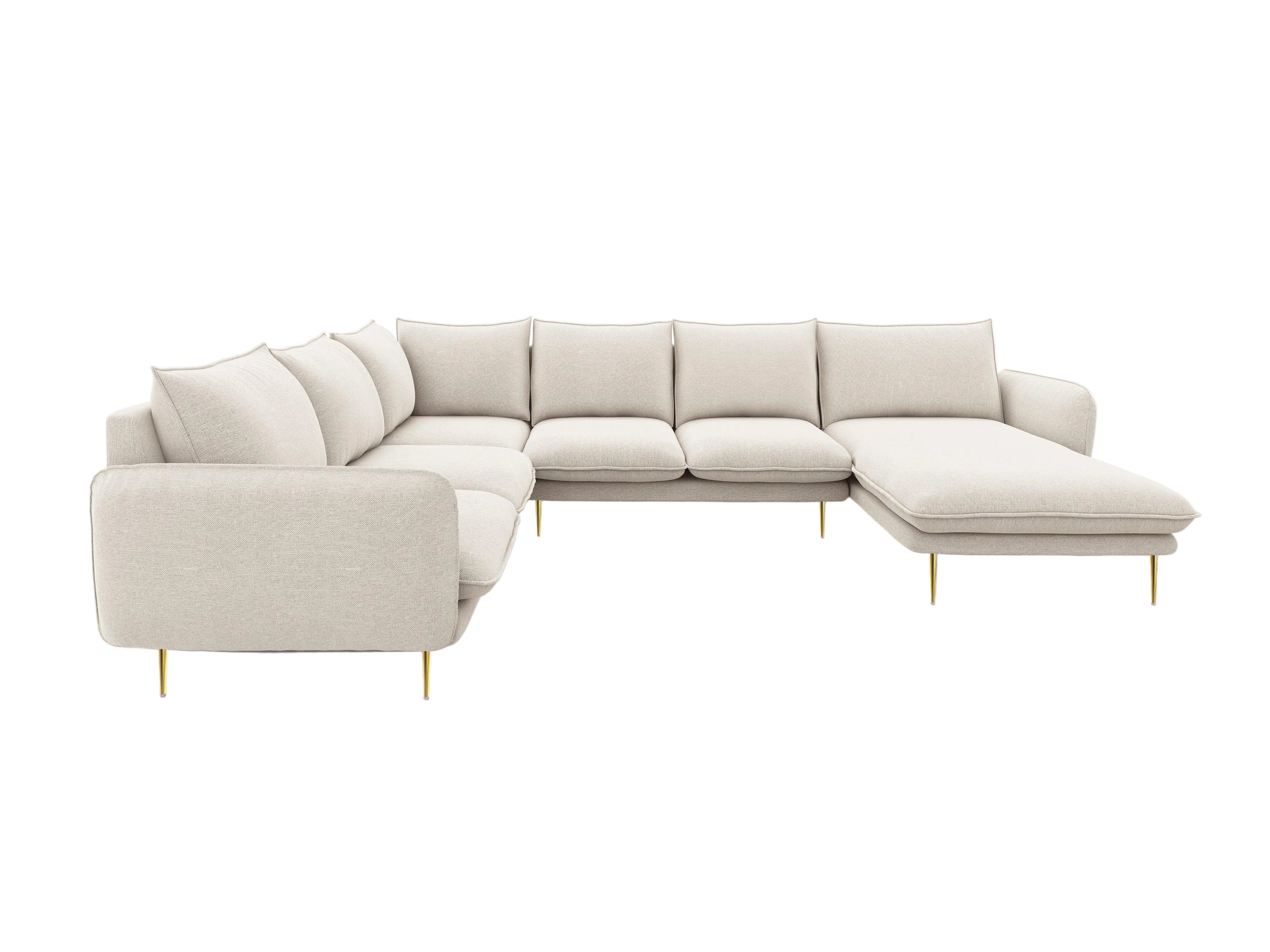 Left-facing panoramic corner sofa for 7 people VIENNA in light beige chenille with a gold base