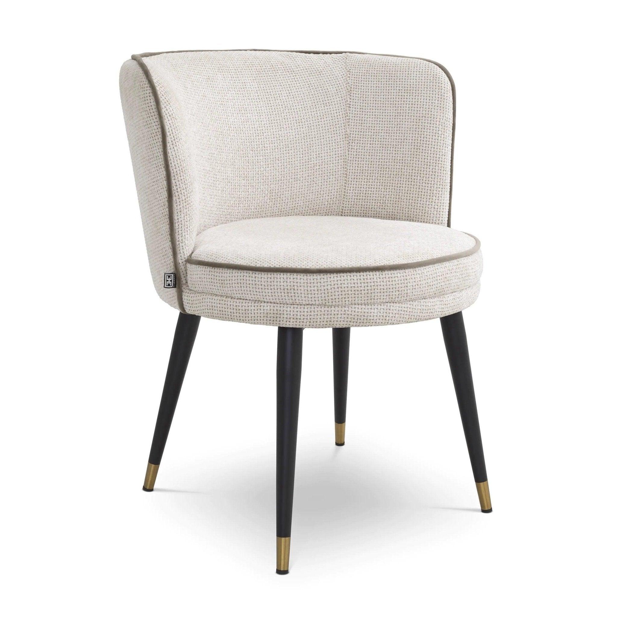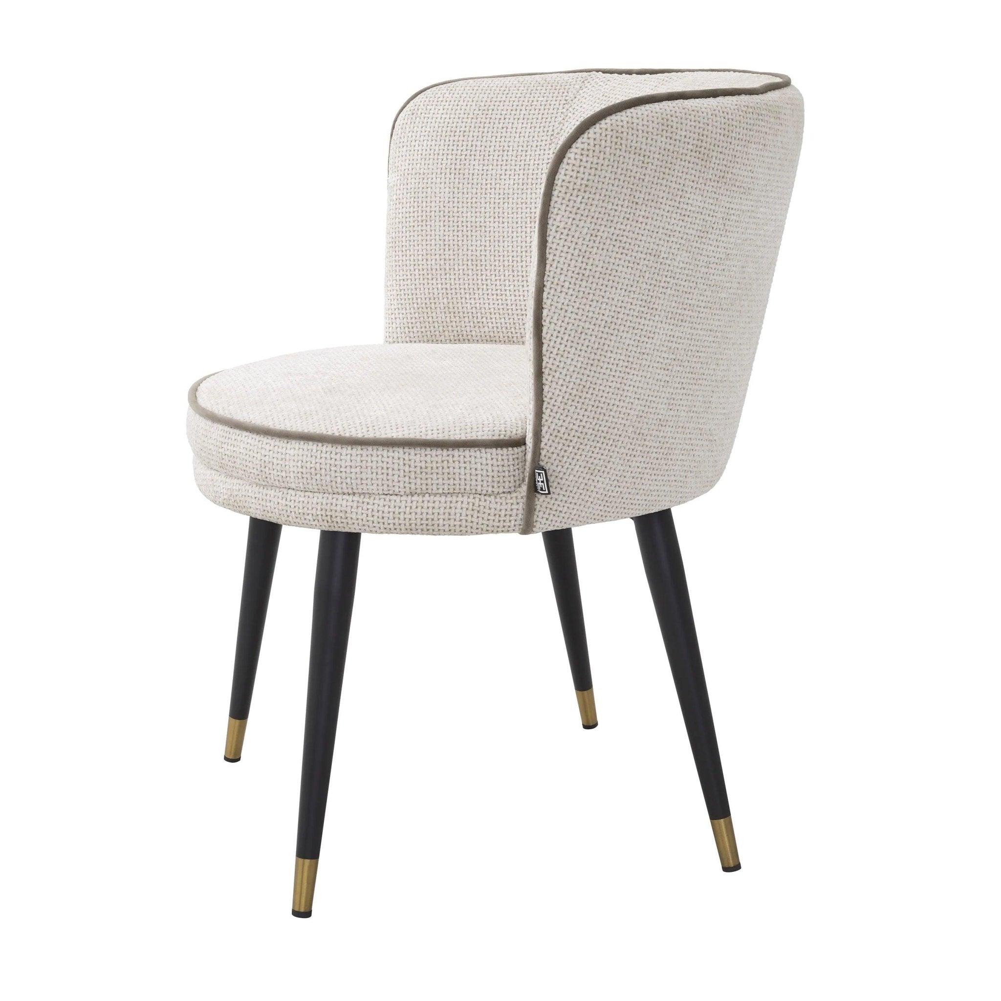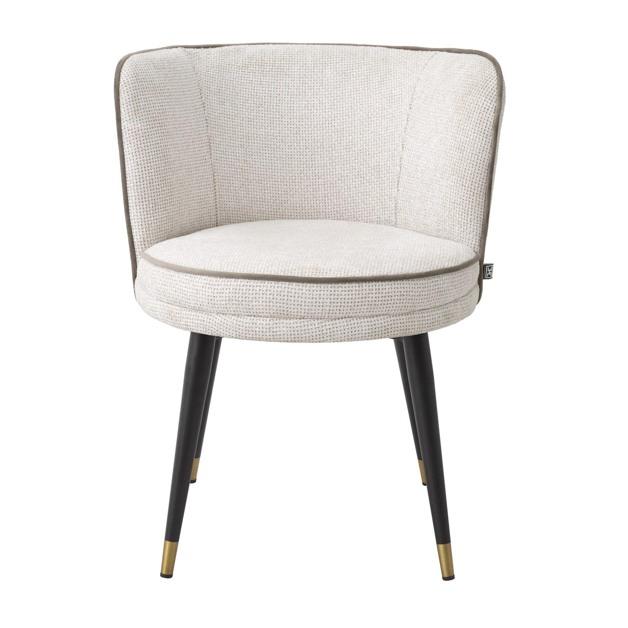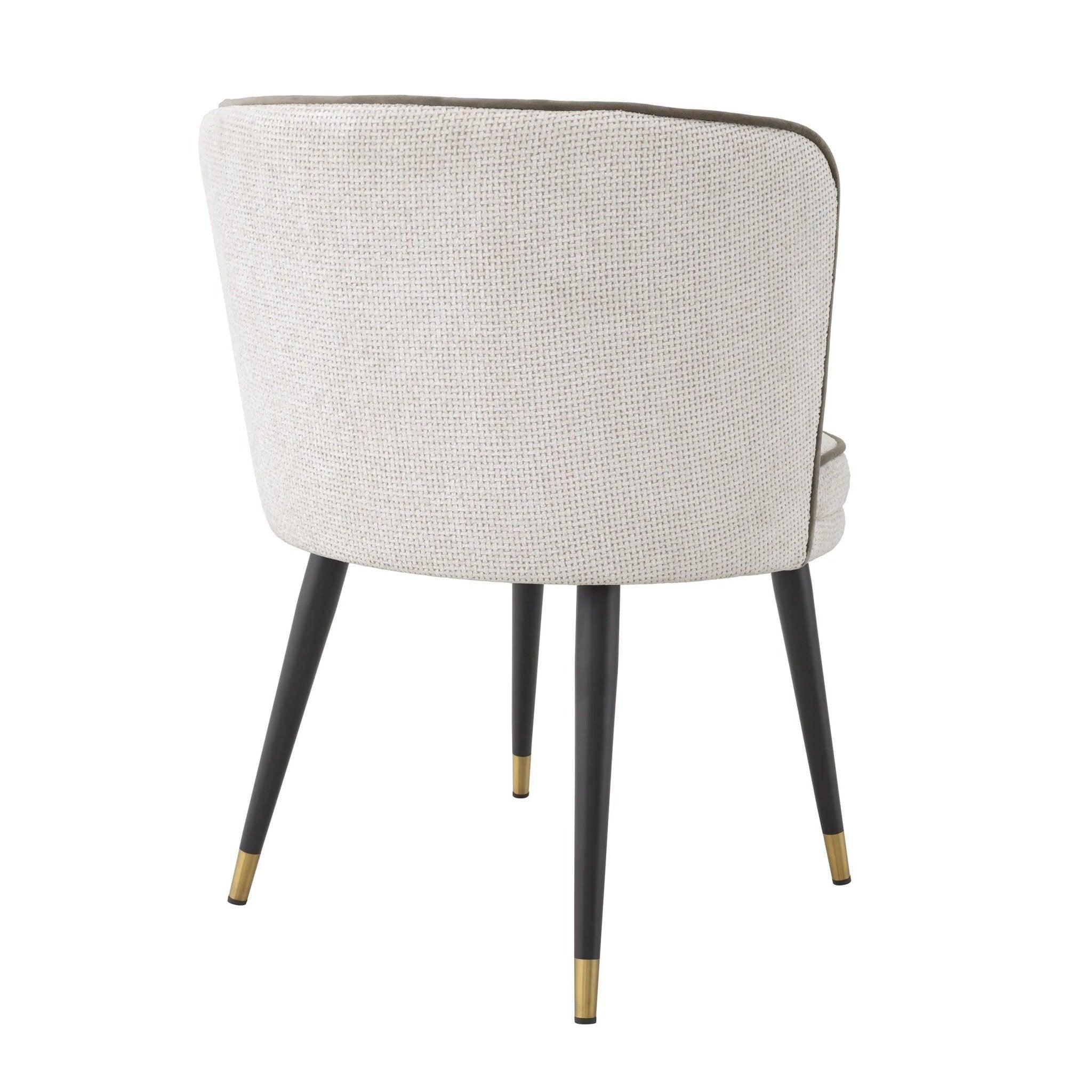 Black narrowed legs Grenada is a classic that never ages, but the added brass covers are like thoughtful jewelry that complements the whole. But this seat and support are a real pearl of this chair. Lyssa upholstery in broken white brings subtlety and elegance, while the gray velvet trim surrounds it like a decorative frame, adding additional contrast and depth.