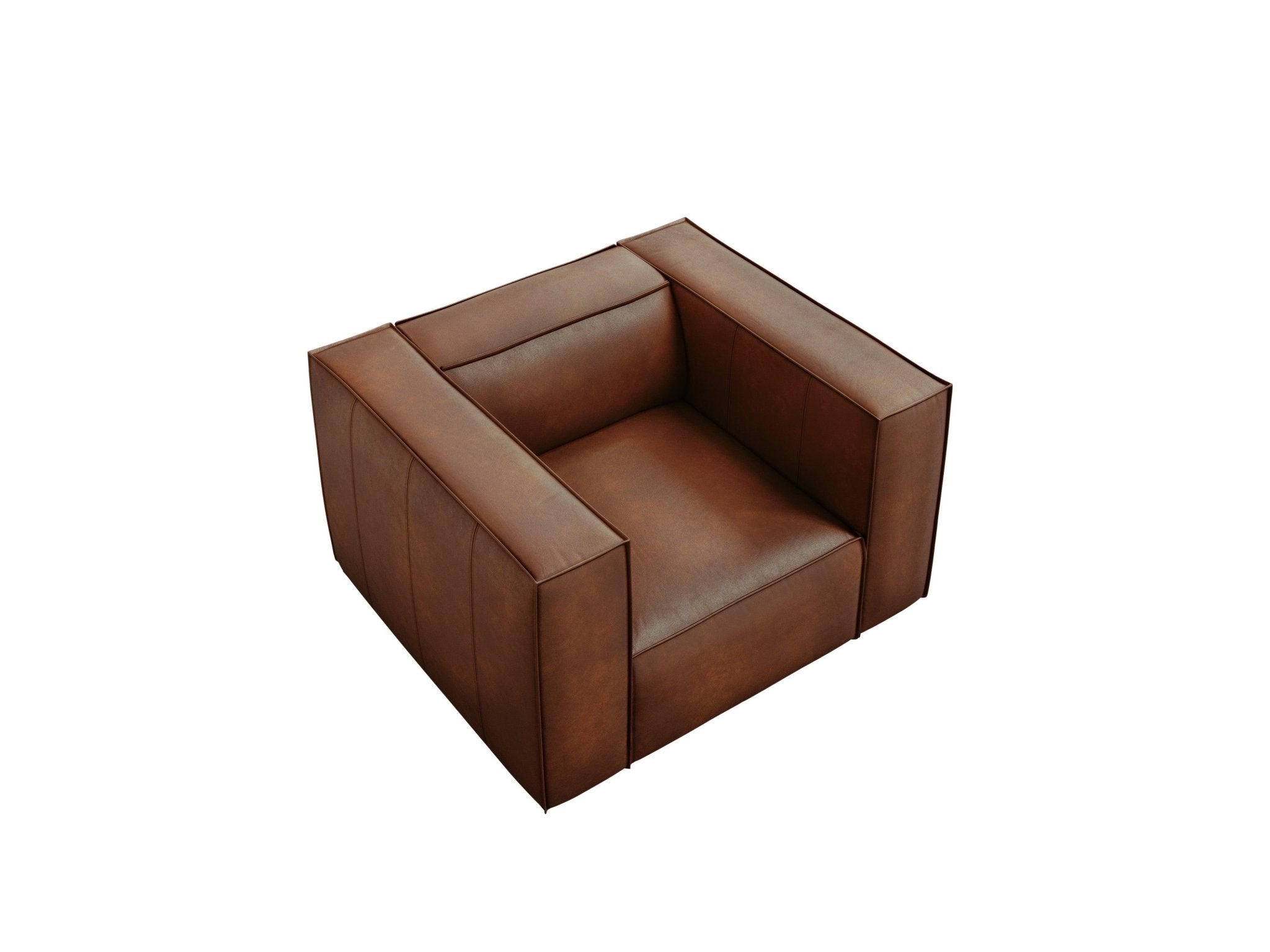 Leather armchair Madame is the perfect combination of elegance and timeless form. The geometric, somewhat raw shape fits beautifully in modern classic interiors with a touch of modernity. Decorative stitching on the leather upholstery adds an extraordinary character to the whole piece. The wooden legs made of beech not only look stunning but also provide a solid foundation.