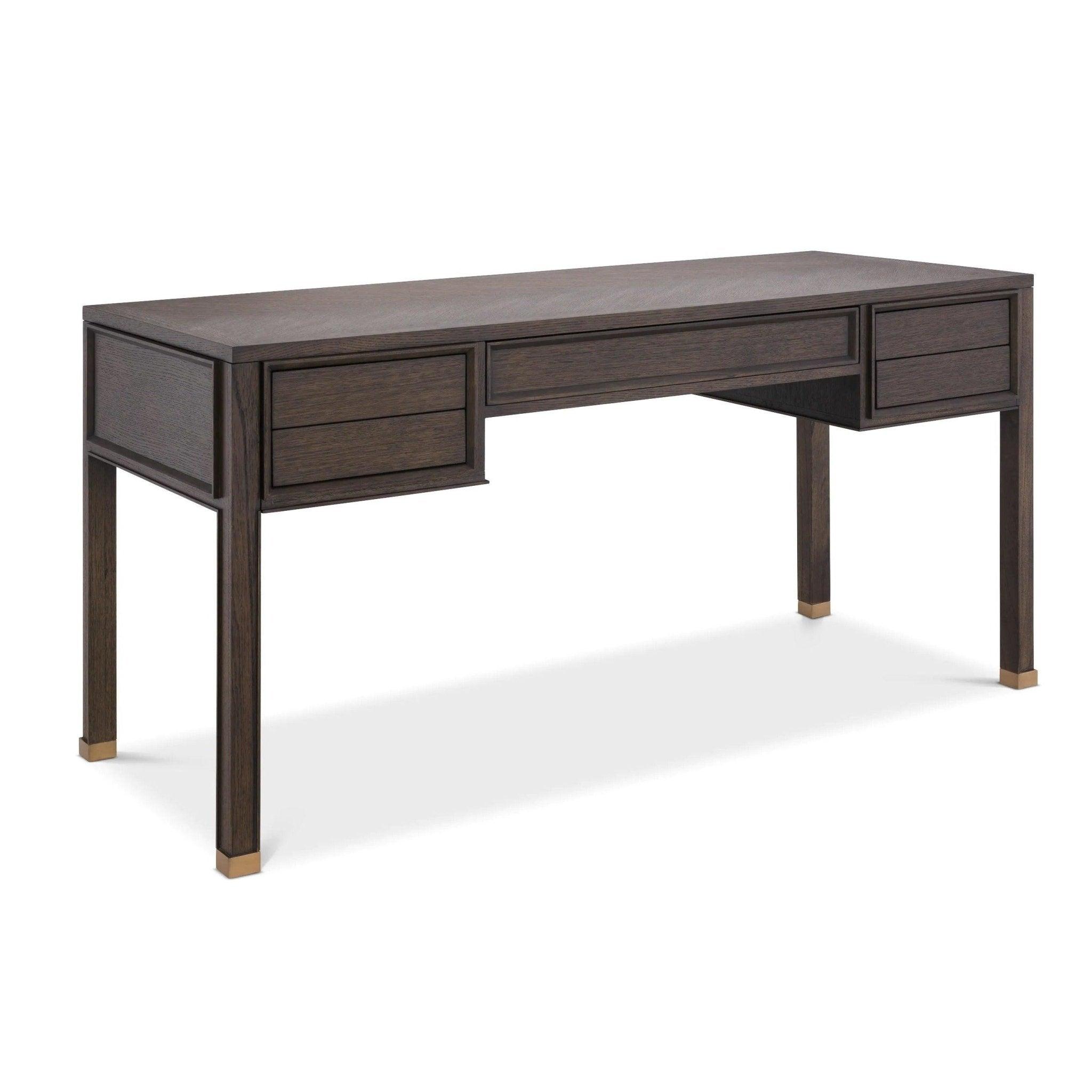 Desk Melchior is the quintessence of class and elegance, deriving inspiration from classic Danish furniture from the mid -20th century. Its universal design makes it perfectly fit into various interiors, from traditional to modern. The brown oak veneer top delights with its geometric pattern of the dance floor, adding a unique character and depth. Five functional drawers provide enough storage space, and four solid legs with decorative brushed brass covers guarantee stability and durability.