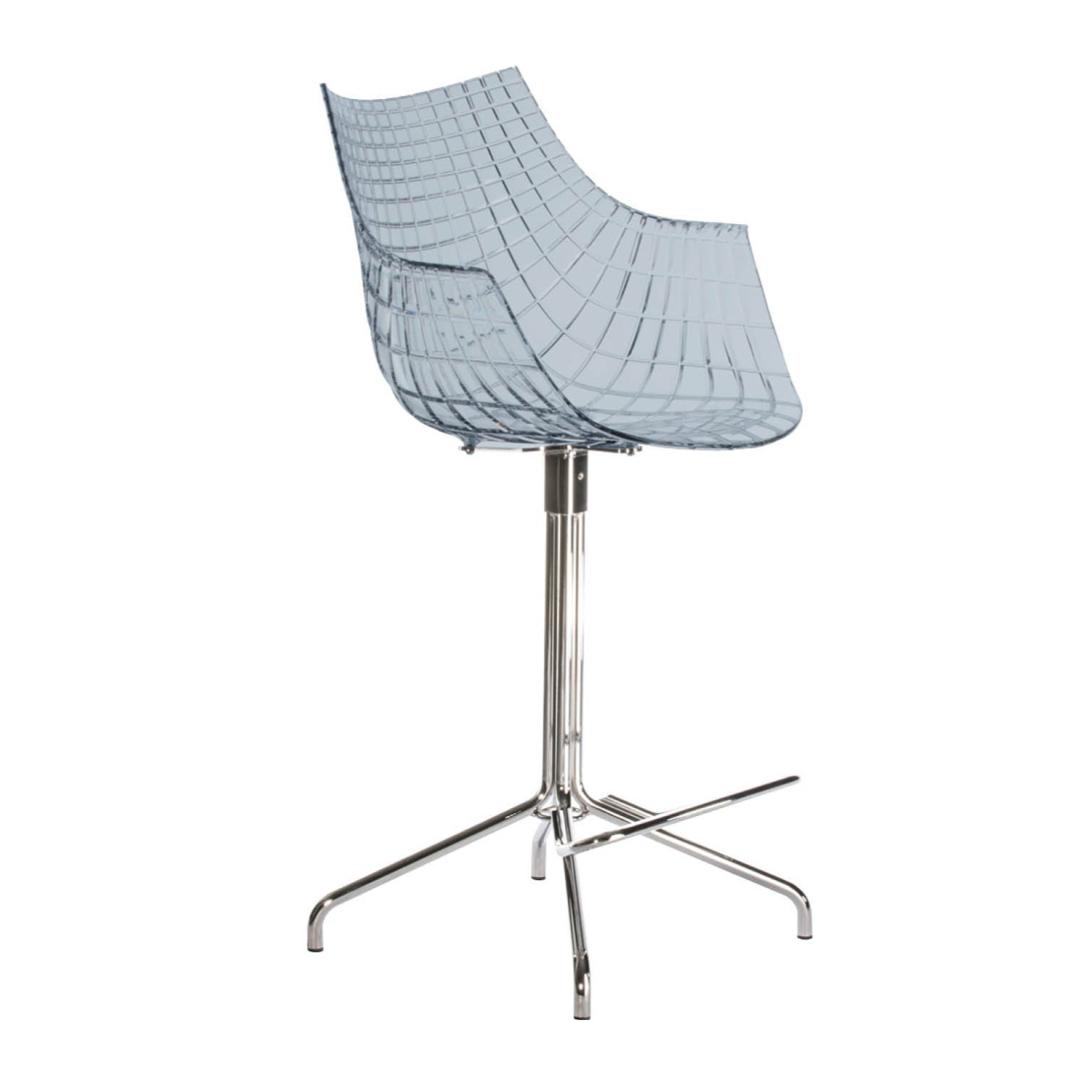 The Meridiana collection includes chairs and stools available in various color options: transparent, smoky, white, and black. Its distinctive shape makes the furniture instantly recognizable and perfectly suited for both dining and office spaces.