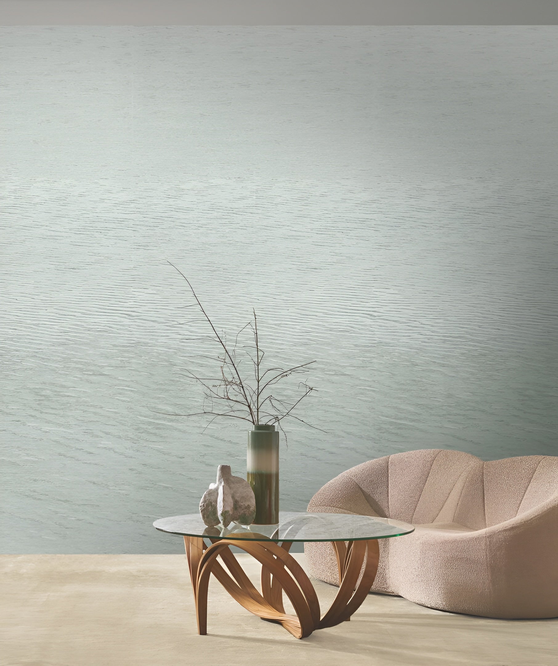 The mural Hamana is a poetic interpretation of a landscape inspired by Lake Hamana, where the calm surface of the water meets the open space of the ocean. Subtle tonal transitions create an impression of soft light and natural depth, giving the wall a light, almost meditative character. The texture reminiscent of jacquard fabric adds nobility and delicate movement to the composition, which changes with the time of day and the lighting in the interior.