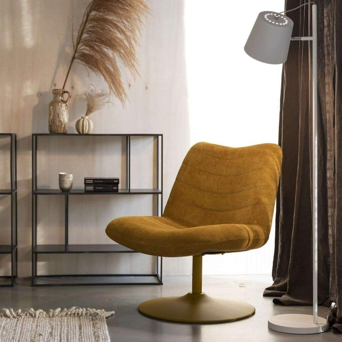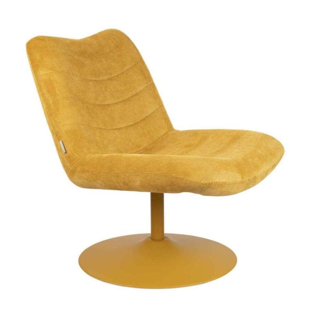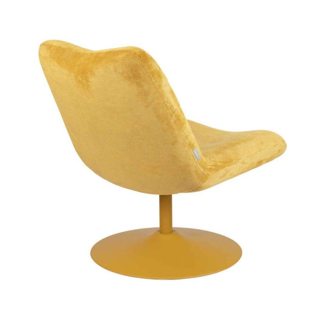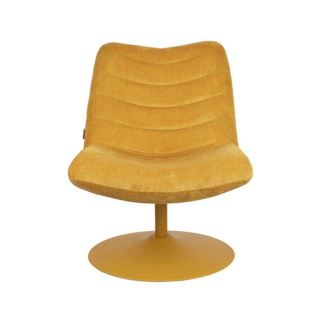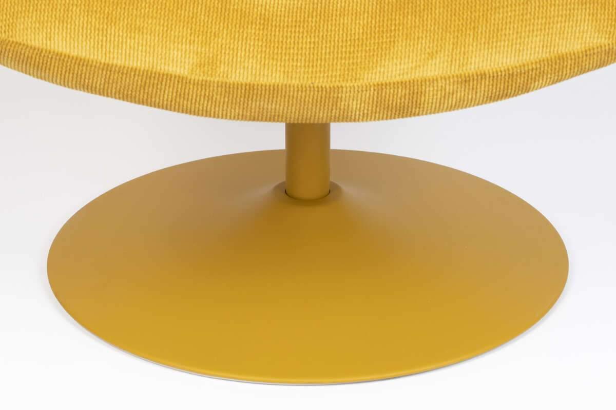 Armchair Bubba is a fantastic combination of comfort and unique design. The contoured seat is upholstered in a mustard-colored, corduroy fabric that is incredibly pleasant to the touch, adorned with horizontal stitching. The entire piece is supported by a subtle, round base, in the same color as the armchair upholstery.