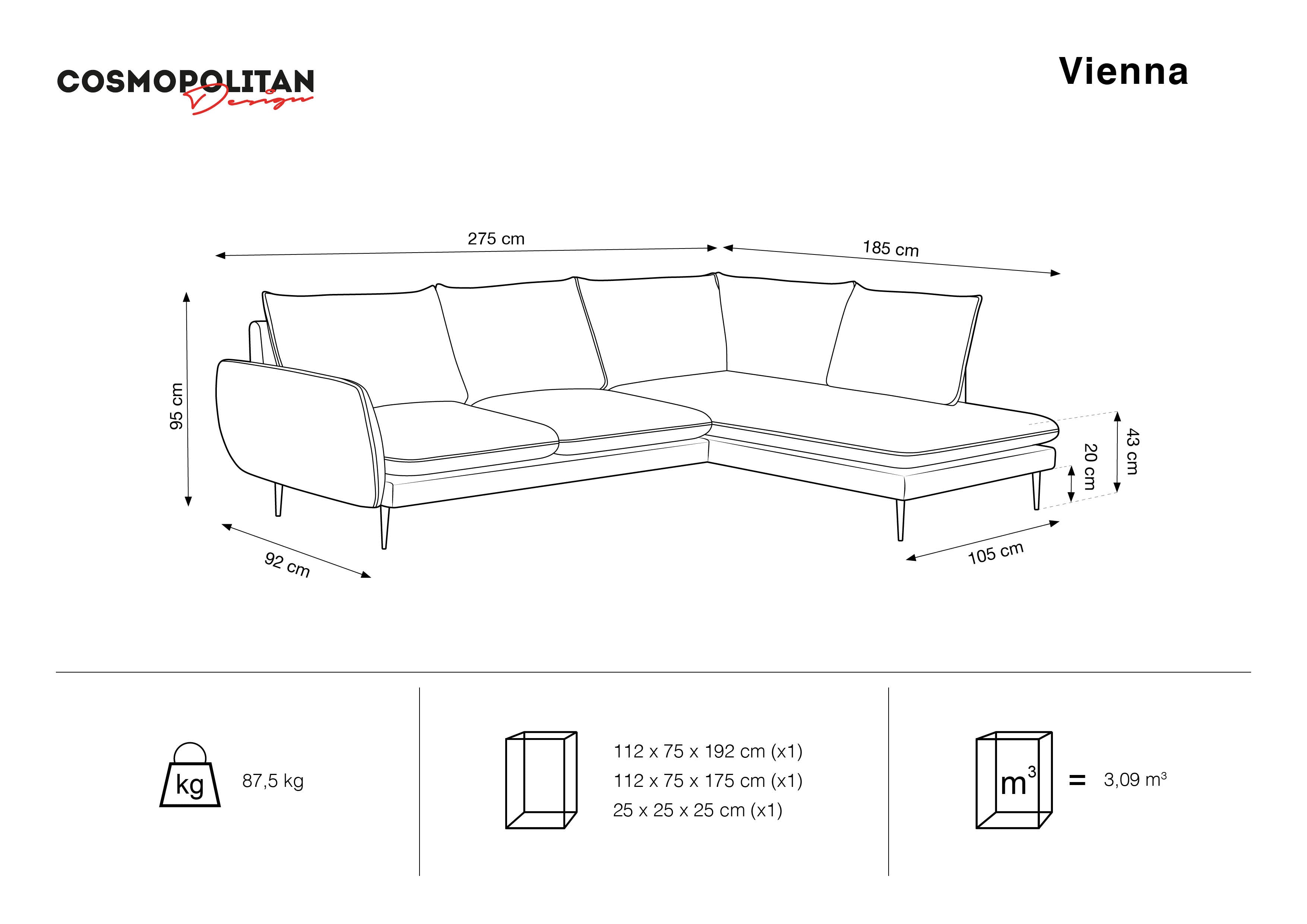 The high-quality chenille fabric stands out with its stylish appearance, mimicking linen with a distinct weave texture. This functional corner sofa perfectly complements the other elements of the Vienna collection, creating a cohesive and elegant arrangement.