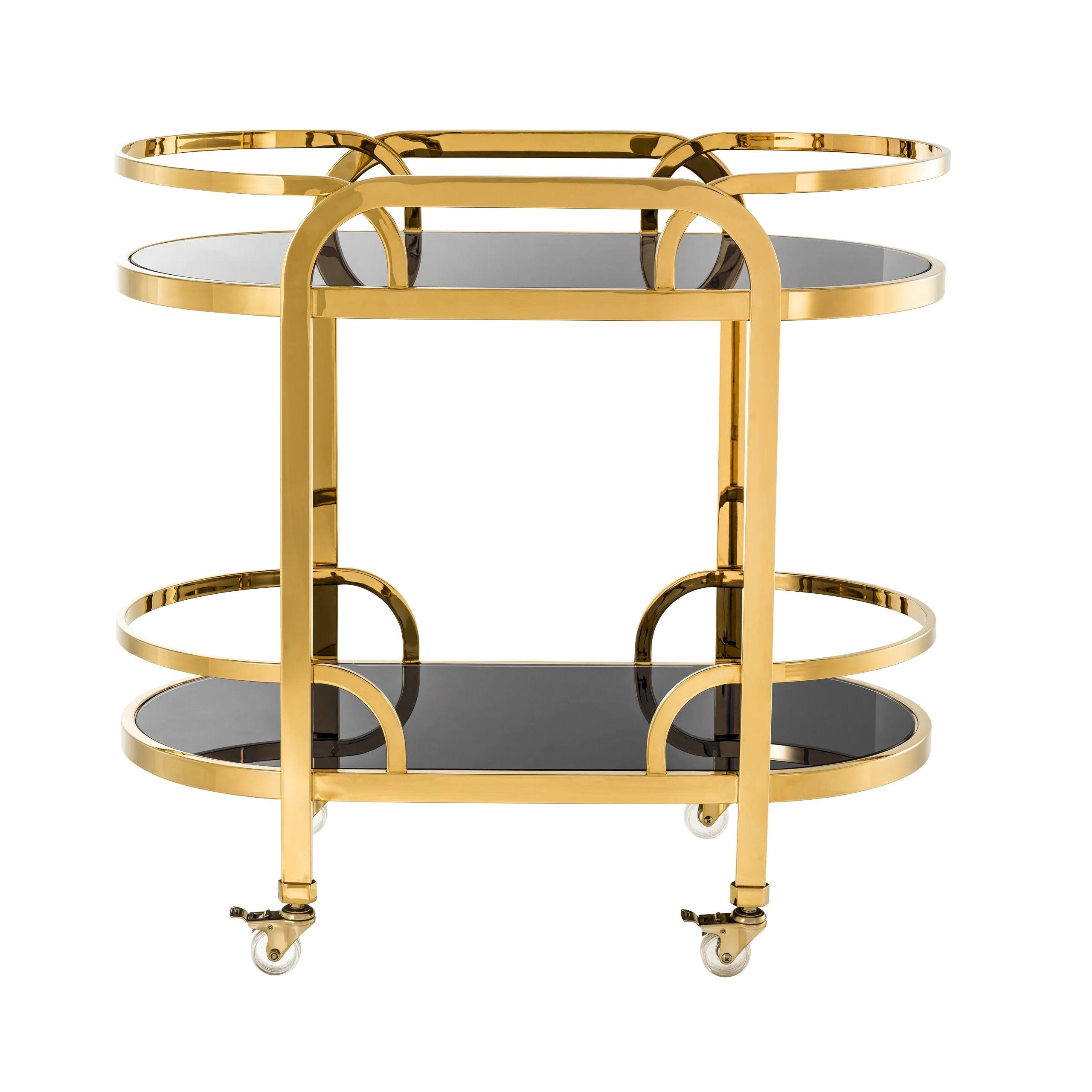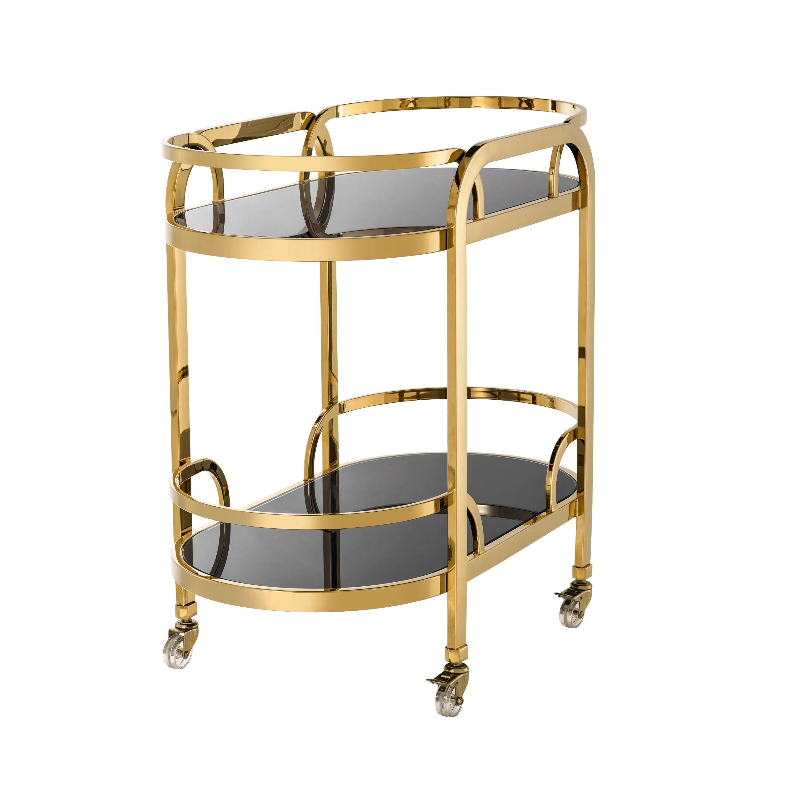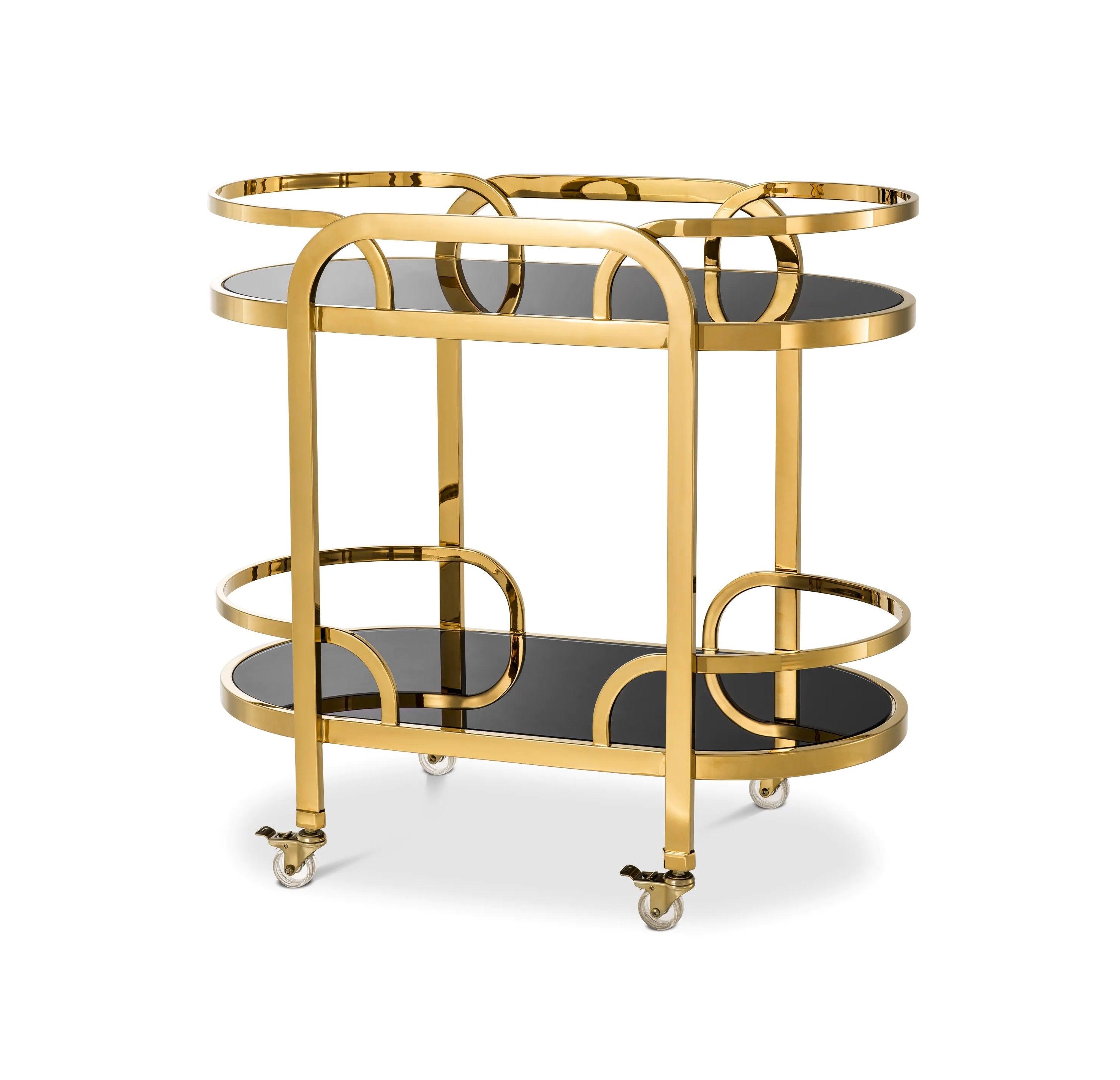 Two longitudinal black glass shelves add contrast and depth to the entire project, while offering a lot of space for storing and serving drinks, snacks or other delicacies. The aesthetics of black glass gives the trolley a sophisticated character, emphasizing its luxurious character.