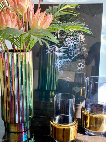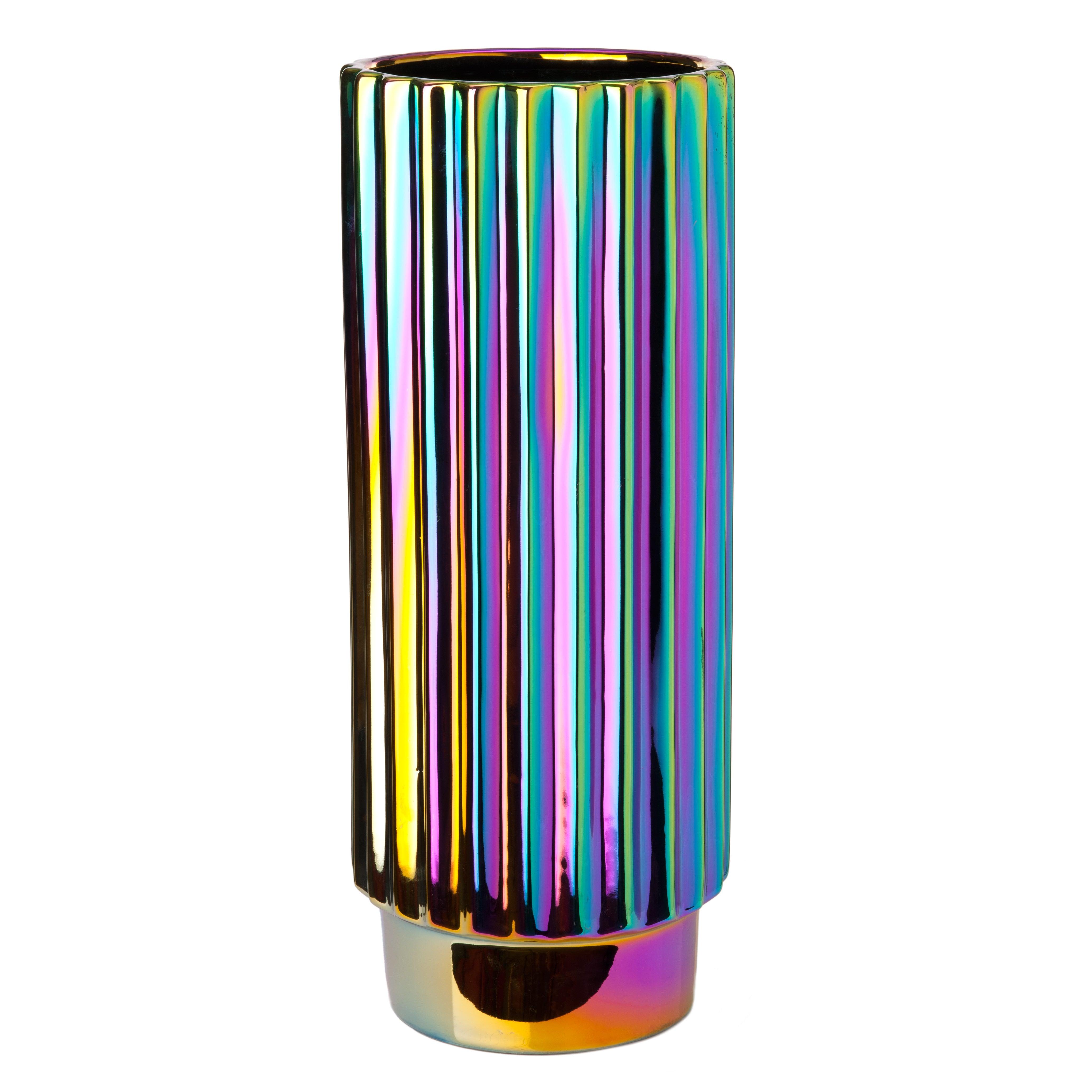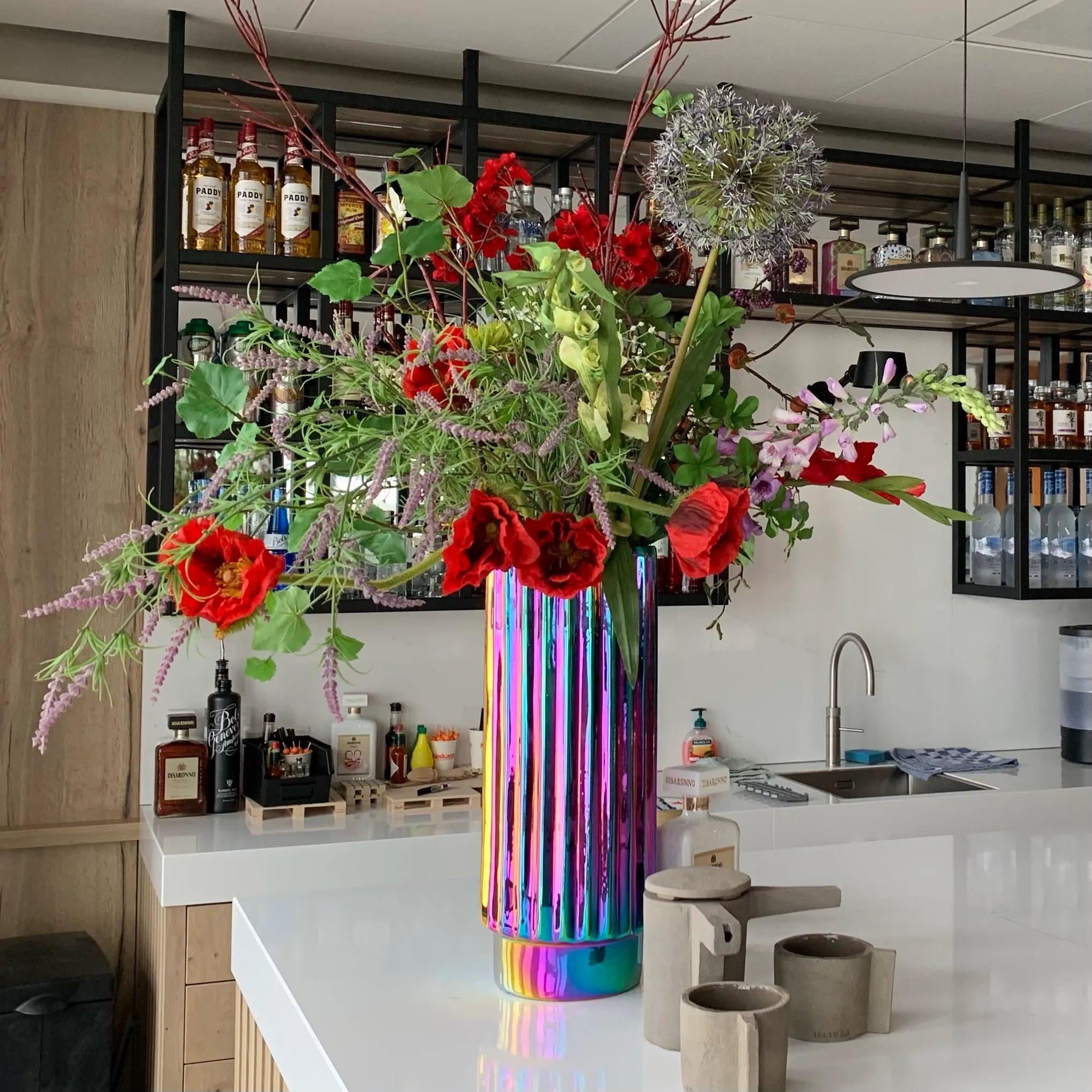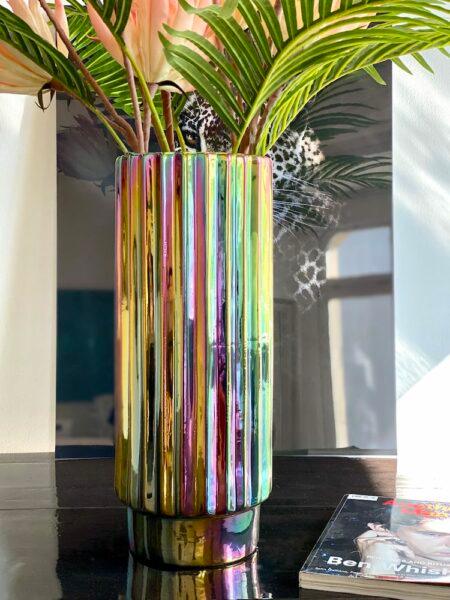 Vase Oily Folds is a model that surprises with its appearance and evokes the image of a distinctive splash of gasoline submerged in a puddle of water. The irregular shape accentuates this extraordinary impression, as sunlight falls on different surfaces, further highlighting the elegant variety of colors.