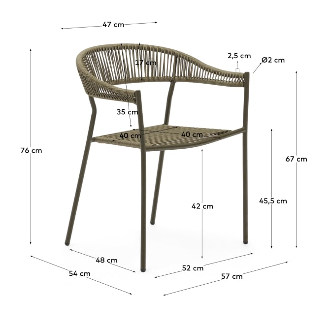 During meals outdoors or in the dining room, add a free look thanks to the string back and seat. Comfort and design connected in this chair suitable 100% outside.