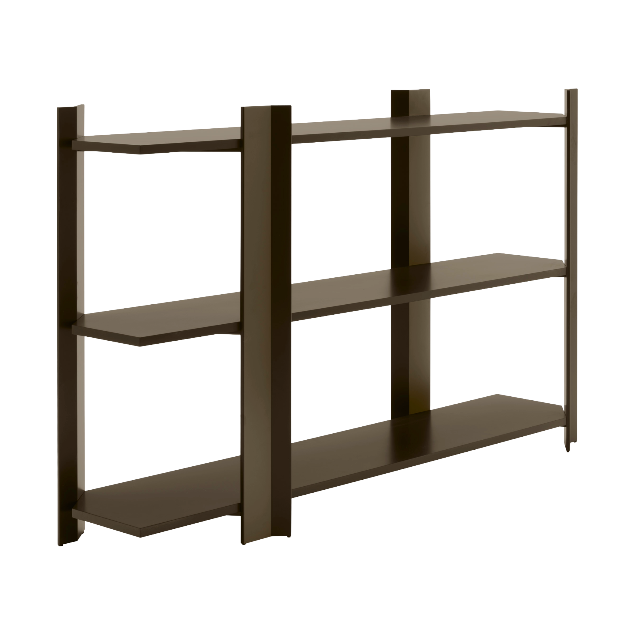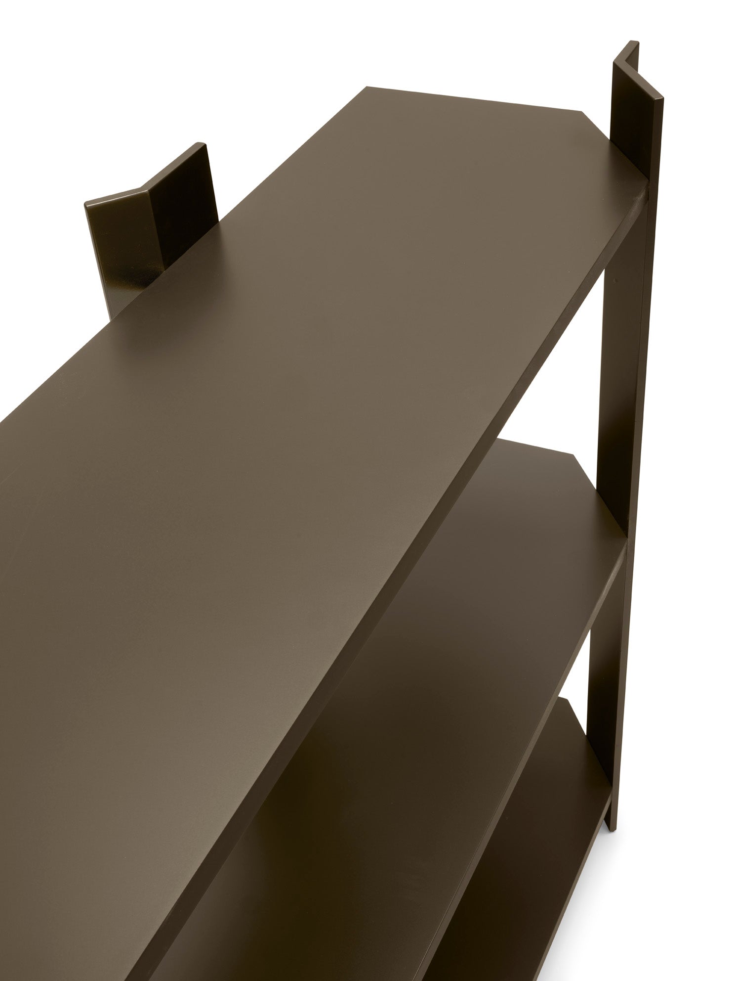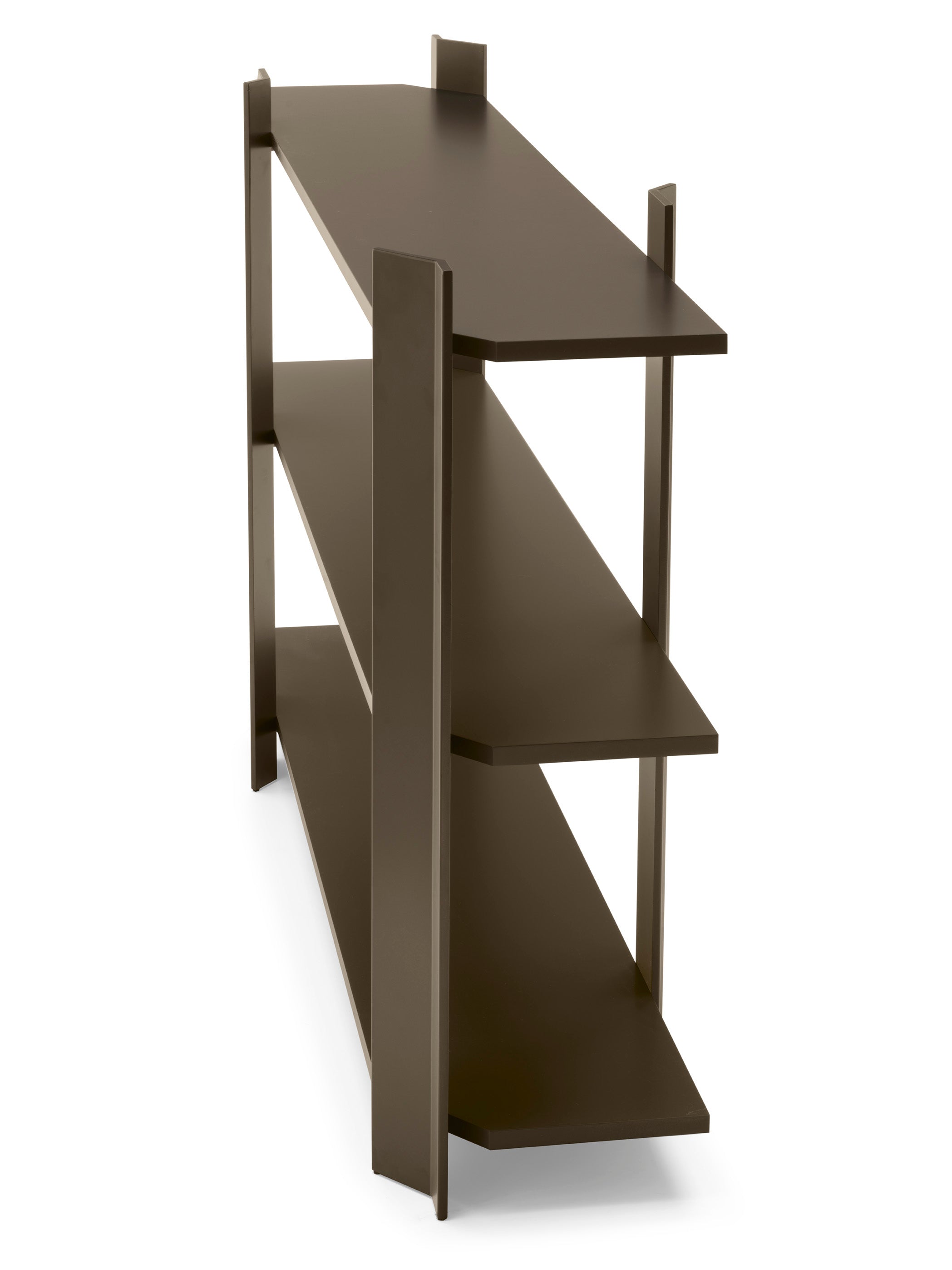 Shelf Wu is a freestanding piece of furniture with versatile applications, which can be placed both against a wall and in the central part of a room as a stylish space divider. Its simple form is enhanced by refined details, such as irregularly spaced V-shaped brackets that give the whole a modern and dynamic character.