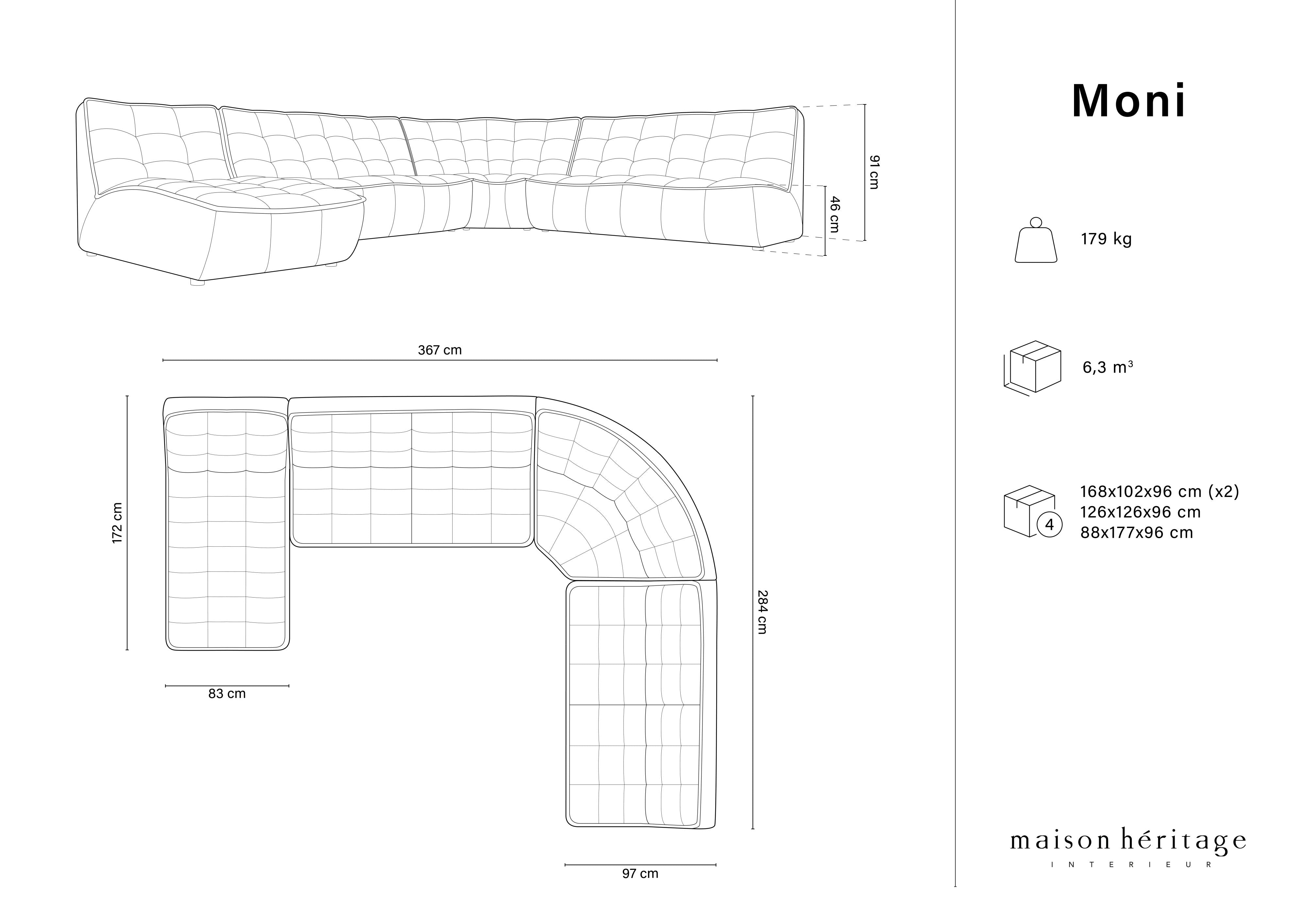 The upholstery made of structural fabric, with its finely woven texture resembling velvet with an uneven surface, is pleasant to the touch and exceptionally durable. Ergonomic shapes provide free support for the entire back. The Moni collection includes several combinations of sofas and corner sofas, as well as elements such as chaise longues and poufs.