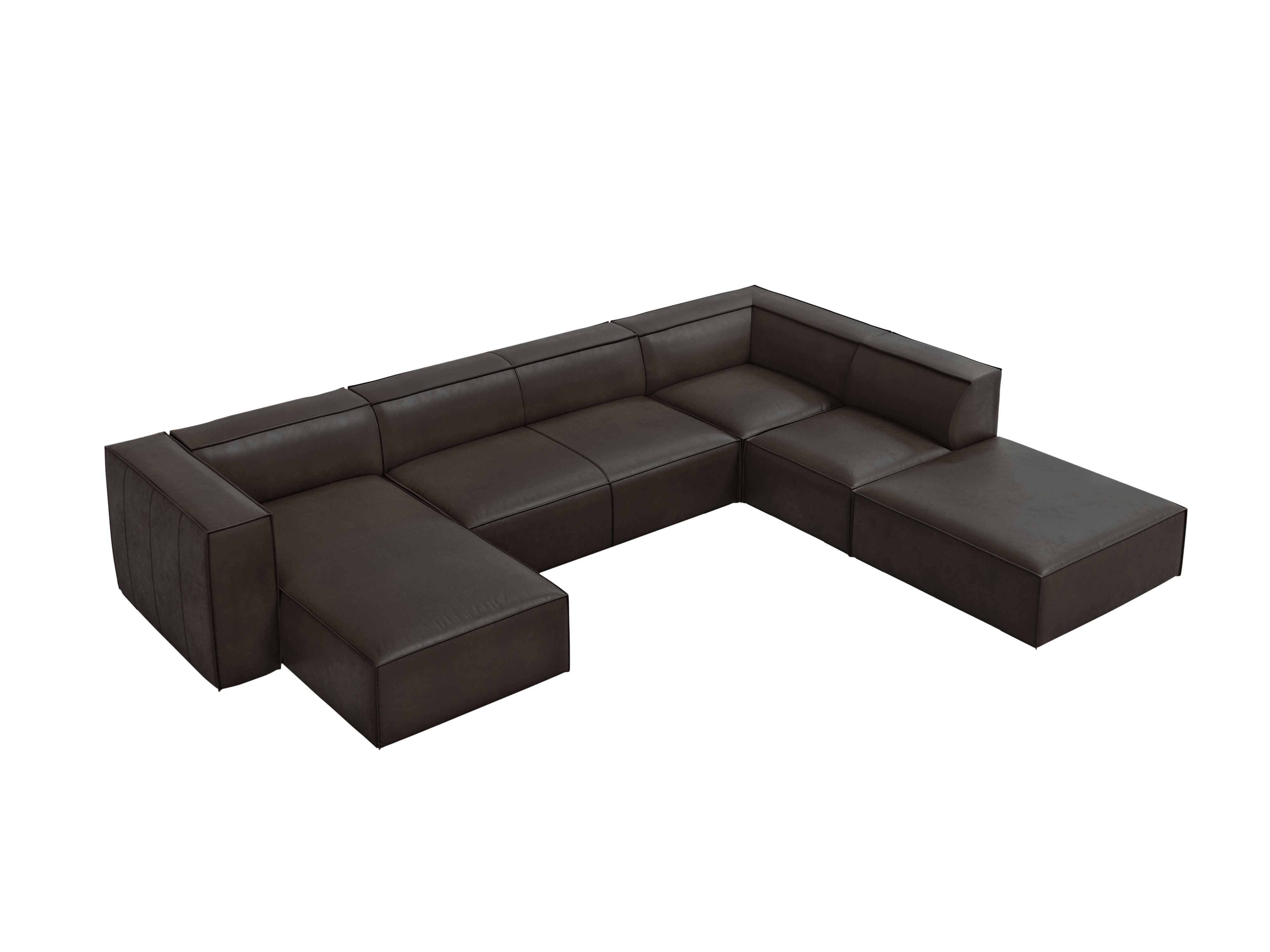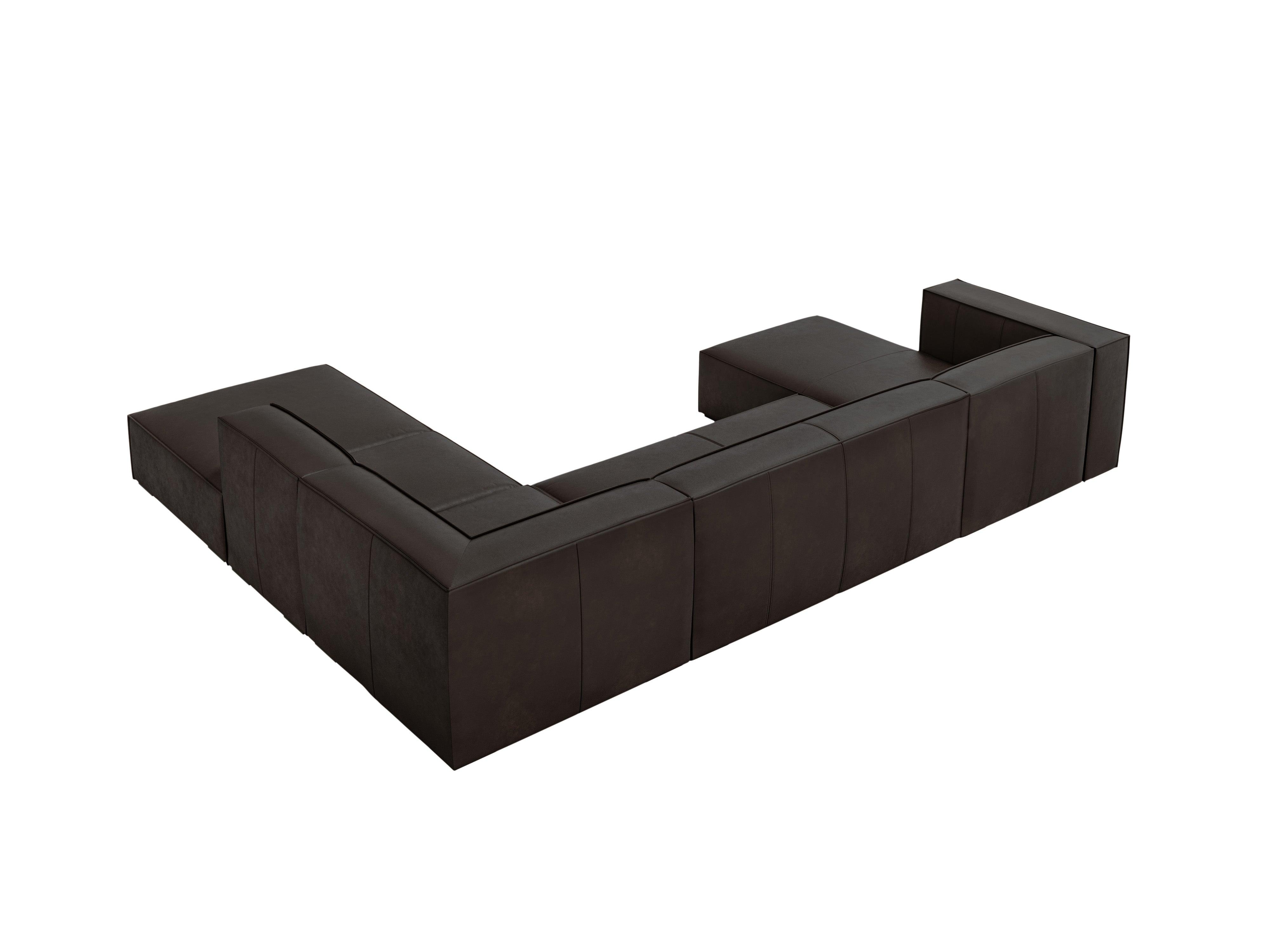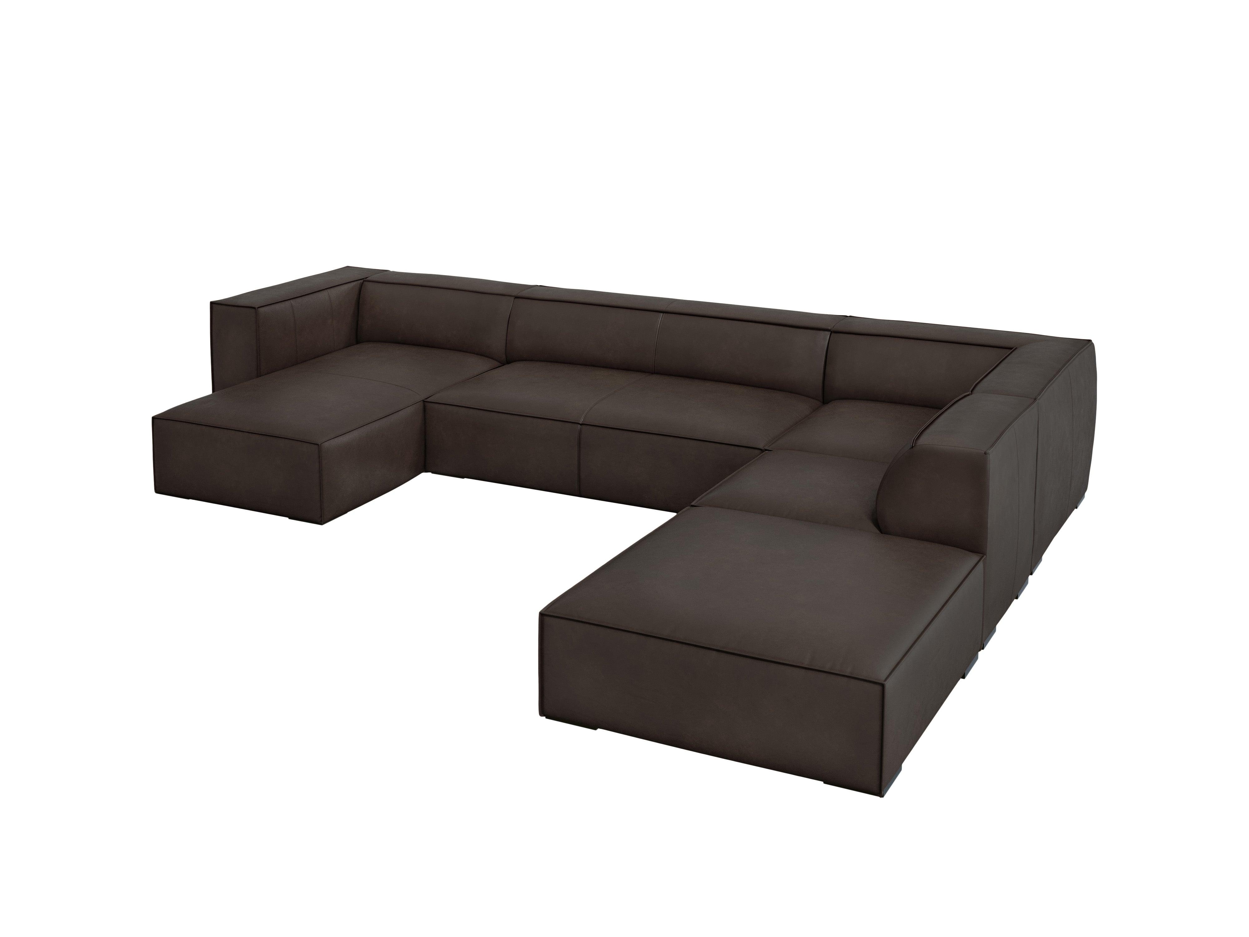 Leather corner panoramic Madame is the perfect combination of elegance and timeless form. The geometric, somewhat raw shape fits beautifully in modern classic interiors with a touch of modernity. Decorative stitching on the leather upholstery adds an extraordinary character to the whole. Wooden legs made of beech not only look beautiful but also provide a solid foundation.