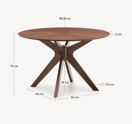 Table Onanius is an elegant and functional choice for the dining room, combining natural materials and unique design. The round top made of natural nut veneer gives it a unique character, thanks to the unique pattern of jars converging in the shape of a star. Legs table, made of solid rubber wood in a nutty finish, ensure durability and stability.