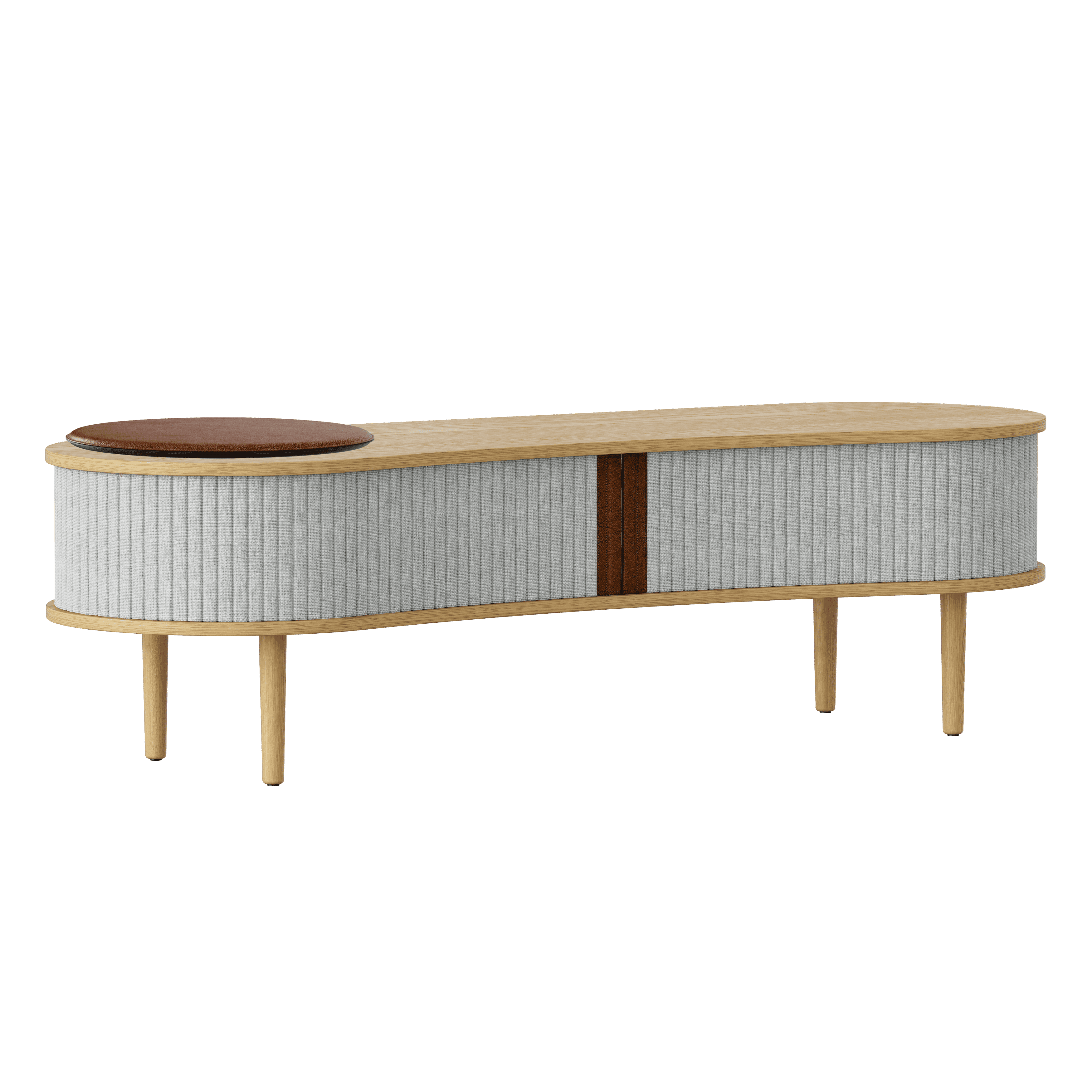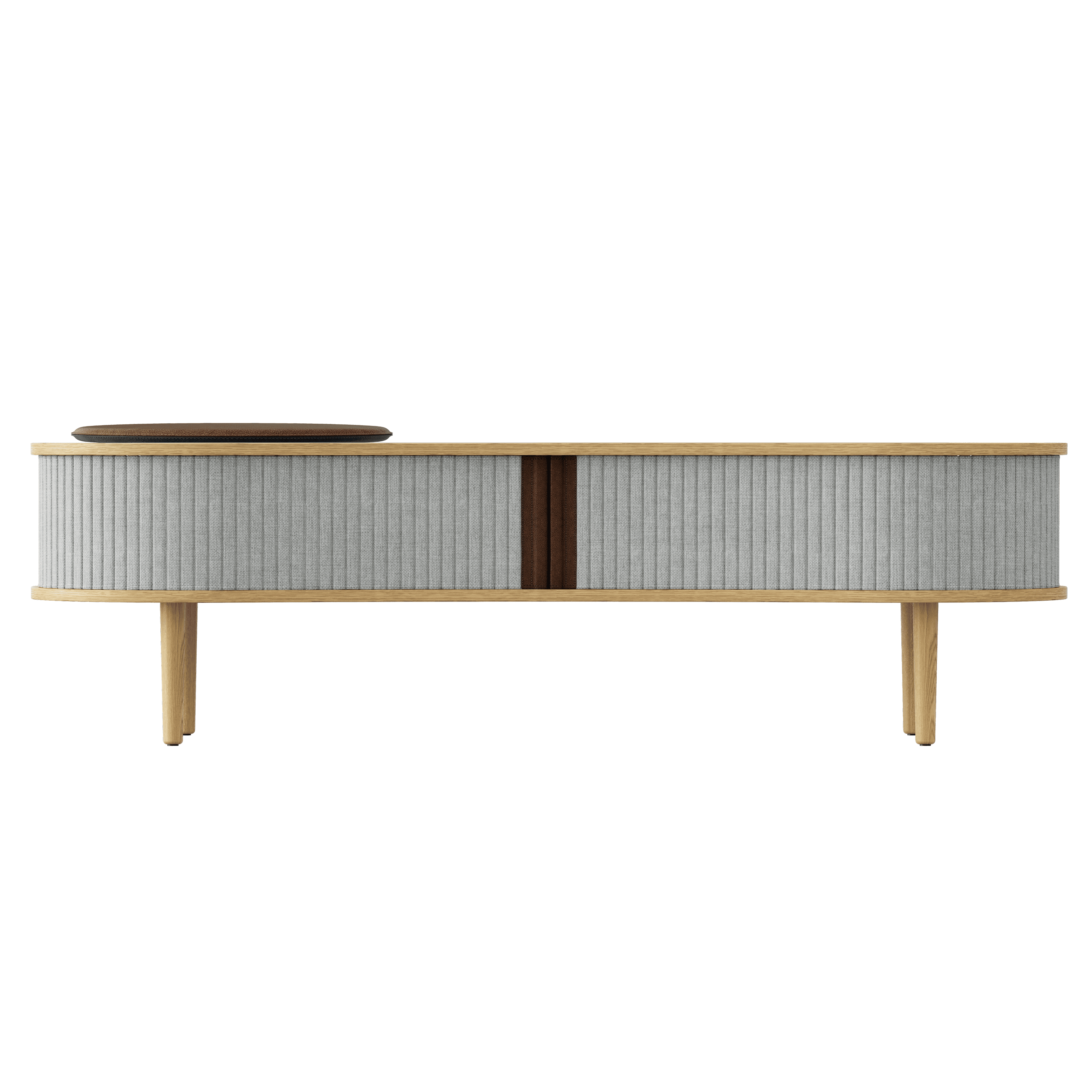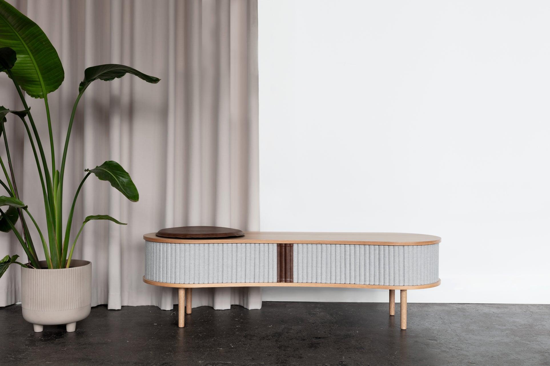 Available in three finishes - oak, dark oak and black oak - with blinds in four selected colors of Horizons fabric, 100% recycled. The blinds are replaceable, which allows you to easily refresh the appearance of the furniture without having to buy a new one, while saving natural resources. It is also possible to buy a seat cushion to increase comfort during use.