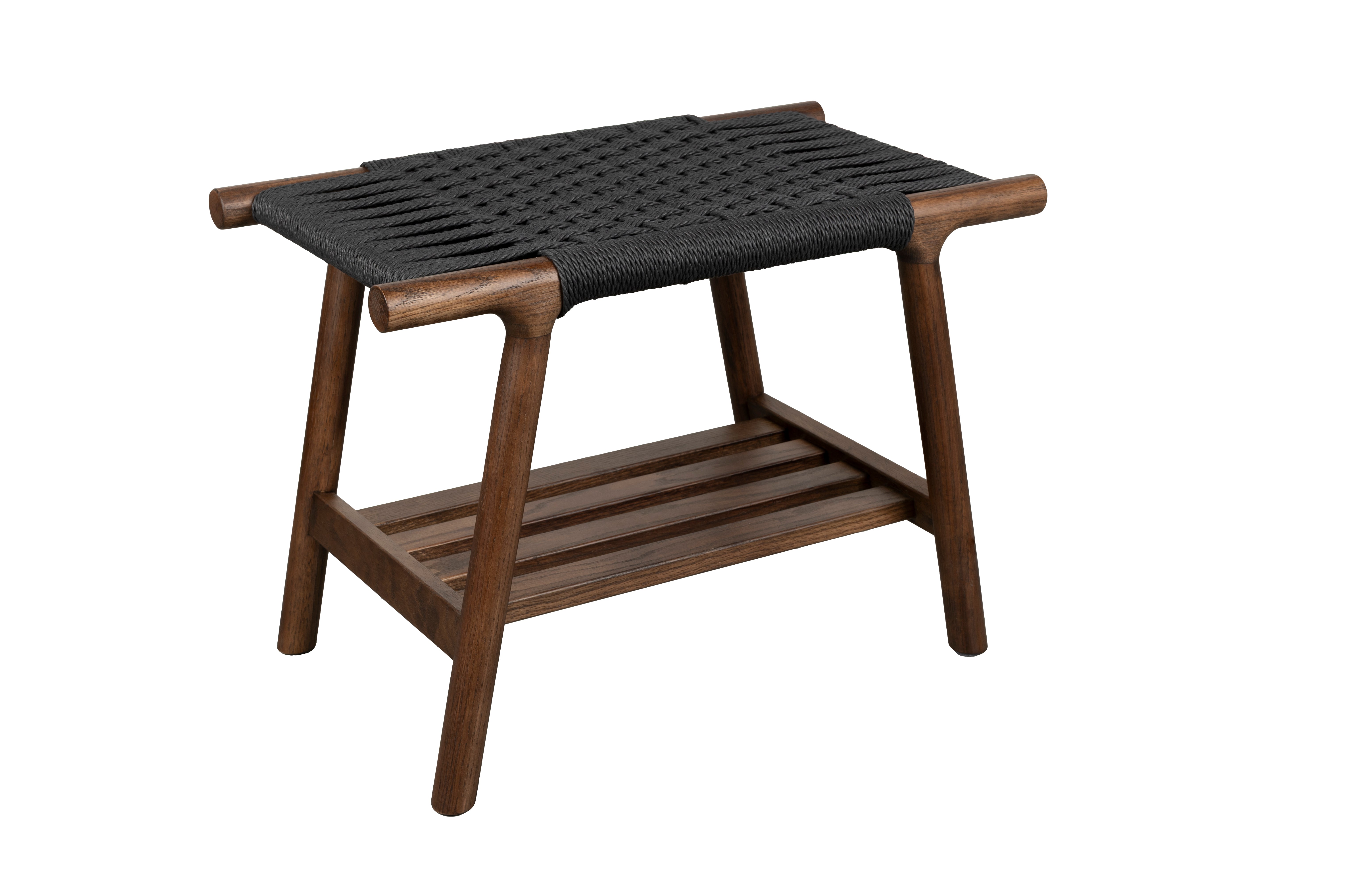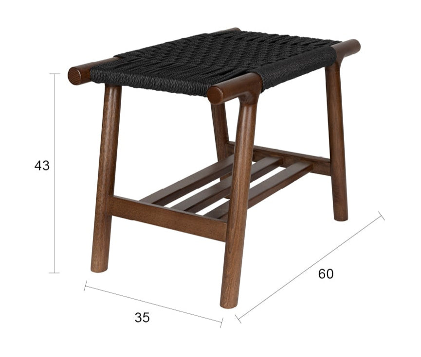 Stool Kintaro in walnut finish is a compact piece of furniture that will bring a warm 1970s vibe to your interior. Made from solid oak and beautifully finished in a deep walnut shade, it delights with organic lines and rounded edges. The most striking feature is the characteristic seat made of woven cord, where horizontal and vertical strands intertwine in an eye-catching pattern. Under the seat, there is a practical slatted shelf that is perfect for storing shoes, books, or small items.
