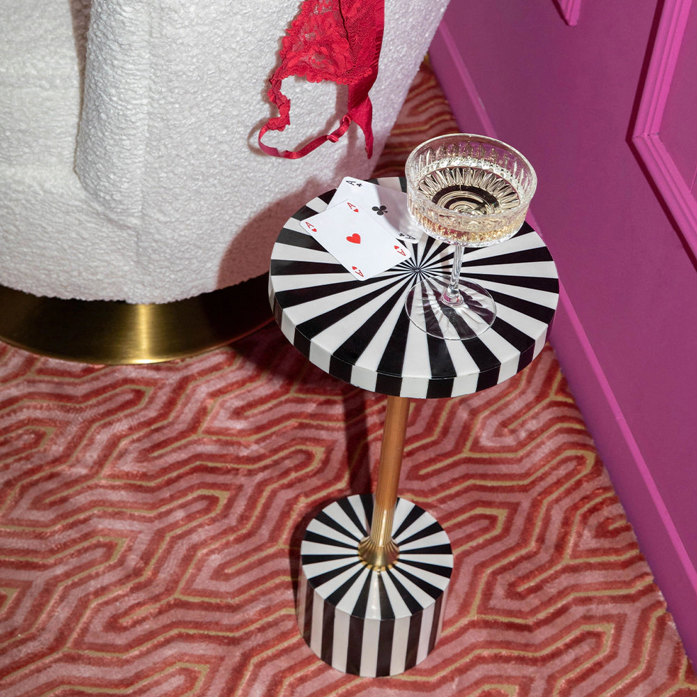 Side table Strike Lucky by Bold Monkey is a designer nod to retro style with a modern twist. Its geometric shape, inspired by falling bowling pins, symbolizes a moment of triumph – the perfect talisman of luck for your interior. The contrasting black-and-white resin top and slender, gilded base create an eye-catching composition that works beautifully as a nightstand in the bedroom or as an elegant accent table in the living room.