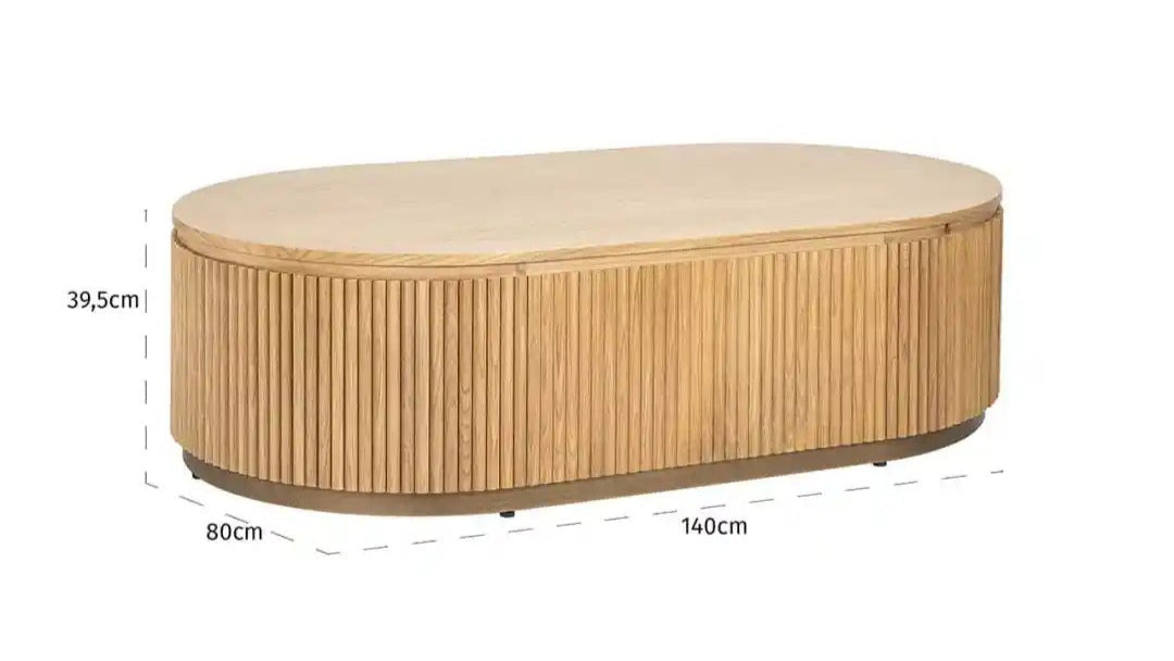 Elegant coffee table Belfort with a rounded shape and ribbed finish is a unique piece of furniture that brings subtle luxury and natural warmth to your interior. Made of oak and oak veneer, it impresses not only with its quality but also with its refined form. The oval top and decorative base create a cohesive, harmonious whole, perfect for modern and cozy living spaces.