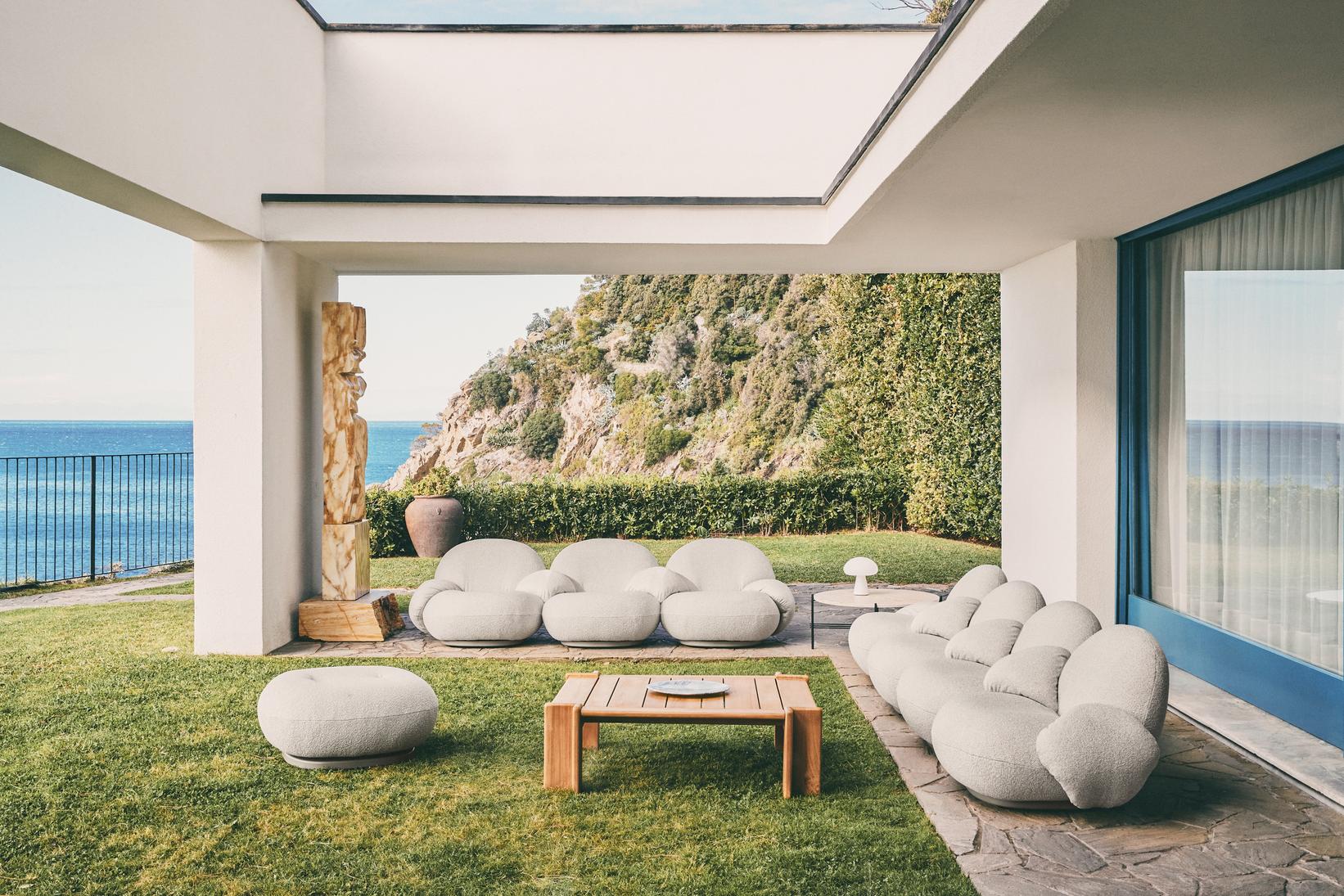 Garden table Atmosfera designed by the Milanese studio GUBI is an example of harmony between form, function, and aesthetics. Its geometric yet subtle construction references classic architectural details and maritime craftsmanship. The surface of the tabletop is made from repeating slats of high-quality teak wood, enclosed in a frame of the same structure. This table brings a natural rhythm and tranquility to outdoor spaces, encouraging relaxation in the fresh air.