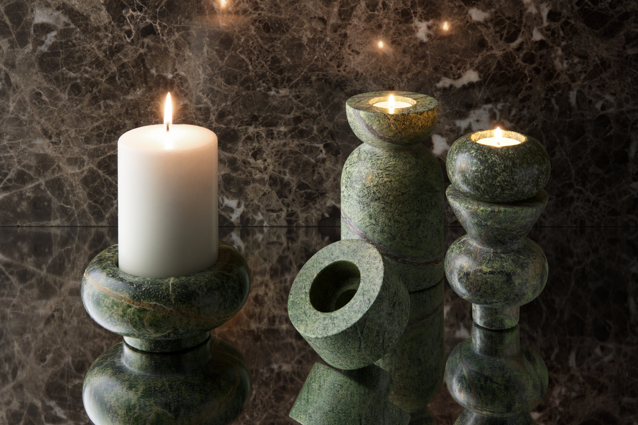 The Stone series is a combination of functionality and decorative value, inspired by the same type of marble that was used to build Taj Mahal. Its hard, semi -precious surface is extremely durable and at the same time pleasant to the touch. Candlesticks Stone is a unique accent in the interiors, combining the severity of the stone with the heat of the candle flame.