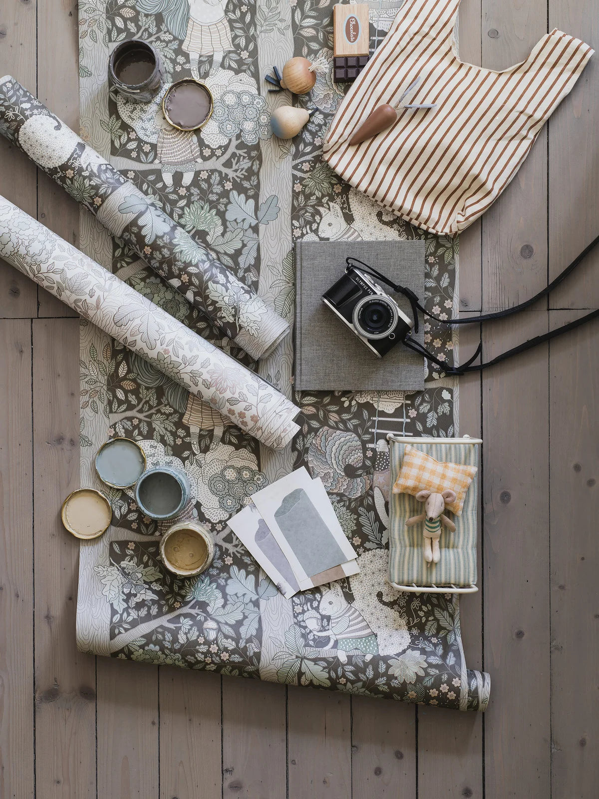 Wallpaper Charlie is a light and cheerful wall decoration that transports you to a fairy-tale, Nordic forest full of energy and childlike imagination. The hand-drawn pattern featuring joyful squirrels jumping between branches creates a dynamic and friendly composition. Meticulously crafted details give the whole piece an artistic character, making the wallpaper delightfully natural and effortlessly stylish.