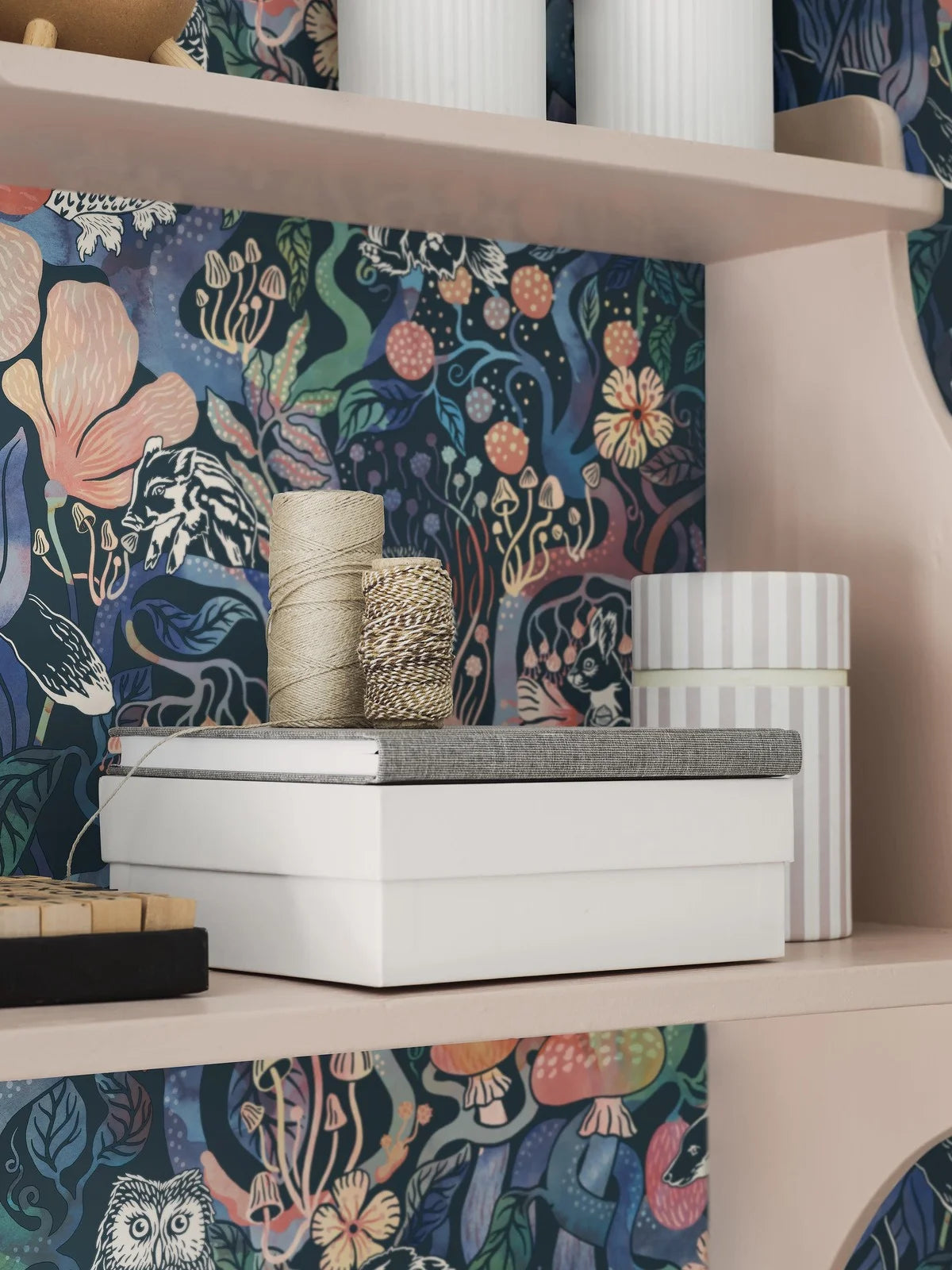 Wallpaper Magic Woods transports you to a mysterious world of an enchanted forest, where nature intertwines with a child's imagination. The dense composition of winding branches, mushrooms, and hidden woodland creatures creates an incredibly rich and immersive pattern that invites you to discover more details. The wallpaper builds an atmosphere of magic and adventure while giving the interior a modern and artistic character.